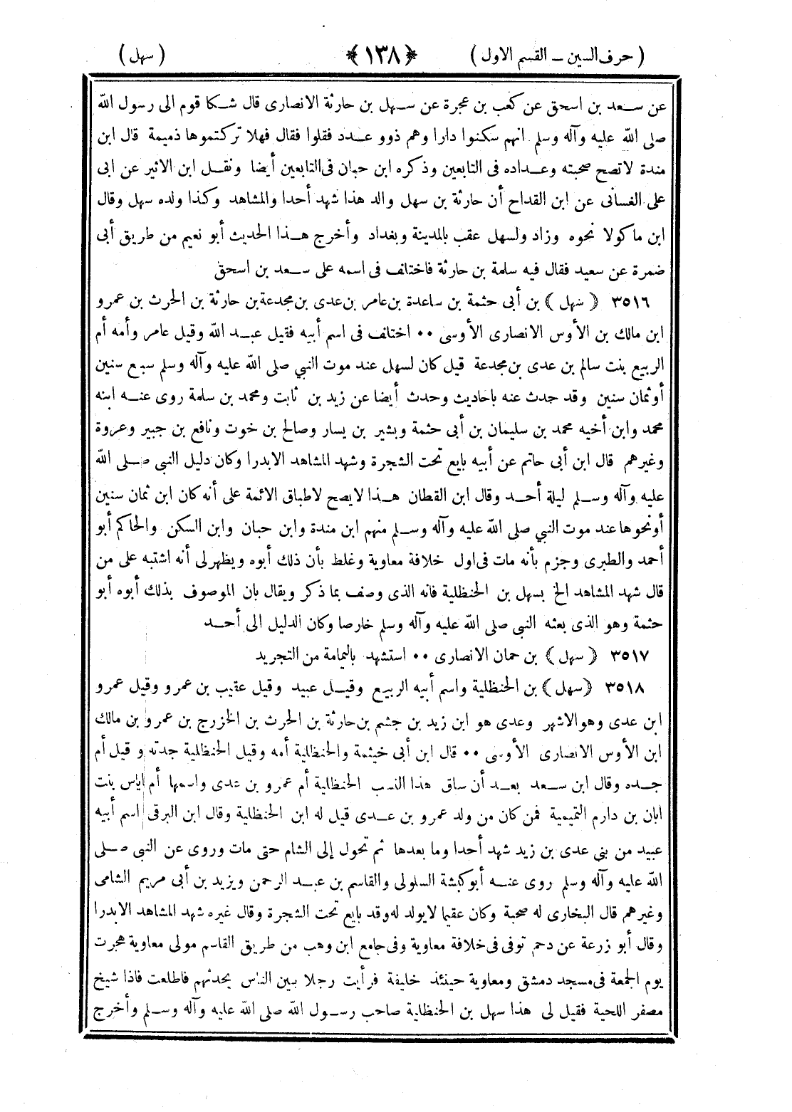 <138> عن سعد بن إسحاق عن كعب بن عجرة عن سهل بن حارثة الأنصاري قال شكا قوم إلى رسول الله صلى الله عليه وسلم أنهم سكنوا دارا وهم ذوو عدد فقلوا فقال فهلا تركتموها ذميمة قال بن منده لا تصح صحبته وعداده في التابعين وذكره بن حبان في التابعين أيضا ونقل بن الأثير عن أبي علي الغساني عن بن القداح أن حارثة بن سهل والد هذا شهد أحدا والمشاهد وكذا ولده سهل وقال بن ماكولا نحوه وزاد ولسهل عقب بالمدينة وبغداد وأخرج هذا الحديث أبو نعيم من طريق أبي ضمرة عن سعيد فقال فيه سلمة بن حارثة فاختلف في اسمه على سعد بن إسحاق سهل بن أبي حثمة بن ساعدة بن عامر بن عدي بن مجدعة بن حارثة بن الحارث بن عمرو بن مالك بن الأوس الأنصاري الأوسي اختلف في اسم أبيه فقيل عبد الله وقيل عامر وأمه أم الربيع بنت سالم بن عدي بن مجدعة قيل كان لسهل عند موت النبي صلى الله عليه وسلم سبع سنين أو ثمان سنين وقد حدث عنه بأحاديث وحدث أيضا عن زيد بن ثابت ومحمد بن مسلمة روى عنه ابنه محمد وابن أخيه محمد بن سليمان بن أبي حثمة وبشير بن يسار وصالح بن خوات ونافع بن جبير وعروة وغيرهم وقال بن أبي حاتم عن أبيه بايع تحت الشجرة وشهد المشاهد الا بدرا وكان دليل النبي صلى الله عليه وسلم ليلة أحد وقال بن القطان هذا لا يصح لاطباق الأئمة على أنه كان بن ثمان سنين أو نحوها عند موت النبي صلى الله عليه وسلم منهم بن منده وابن حبان وابن السكن والحاكم أبو أحمد والطبري وجزم بأنه مات في أول خلافة معاوية وغلط بأن ذلك أبوه ويظهر لي أنه اشتبه على من قال شهد المشاهد الخ بسهل بن الحنظلية فإنه الذي وصف بما ذكر ويقال بان الموصوف بذلك أبوه أبو حثمة وهو الذي بعثه النبي صلى الله عليه وسلم خارصا وكان الدليل إلى أحد سهل بن حمار الأنصاري استشهد باليمامة من التجريد سهل بن الحنظلية واسم أبيه الربيع وقيل عبيد وقيل عقيب بن عمرو وقيل عمرو بن عدي وهو الأشهر عدي هو بن زيد بن جشم بن حارثة بن الحارث بن الخزرج بن عمرو بن مالك بن الأوس الأنصاري الأوسي قال بن أبي خيثمة والحنظلية أمه وقيل الحنظلية جدته وقيل أم جده وقال بن سعد بعد أن ساق هذا النسب الحنظلية أم عمرو بن عدي واسمها أم إياس بنت أبان بن دارم التميمية فمن كان من ولد عمرو بن عدي قيل له بن الحنظلية وقال بن البرقي اسم أبيه عبيد من بني عدي بن زيد شهد أحدا وما بعدها ثم تحول إلى الشام حتى مات وروى عن النبي صلى الله عليه وسلم روى عنه أبو كبشة السلولي والقاسم بن عبد الرحمن ويزيد بن أبي مريم الشامي وغيرهم قال البخاري له صحبة وكان عقيما لا يولد له وقد بايع تحت الشجرة وقال غيره شهد المشاهد الا بدرا وقال أبو زرعة عن دحيم توفي في خلافة معاوية وفي جامع بن وهب من طريق القاسم مولى معاوية هجرت يوم الجمعة في مسجد دمشق ومعاوية حينئذ خليفة فرأيت رجلا بين الناس يحدثهم فاطلعت فإذا شيخ مصفر اللحية فقيل لي هذا سهل بن الحنظلية صاحب رسول الله صلى الله عليه وسلم وأخرج §