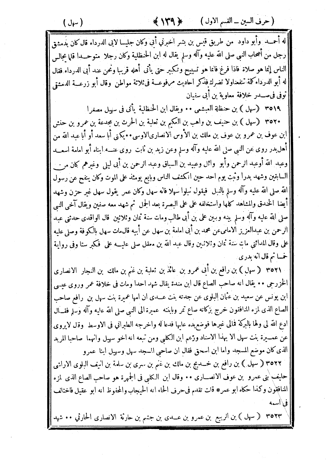 <139> له أحمد وأبو داود من طريق قيس بن بشر أخبرني أبي وكان جليسا لأبي الدرداء قال كان بدمشق رجل من أصحاب النبي صلى الله عليه وسلم يقال له بن الحنظلية وكان رجلا متوحدا قلما يجالس الناس إنما هو صلاة فإذا فرغ فإنما هو تسبيح وتكبير حتى يأتي أهله قريبا ونحن عند أبي الدرداء فقال أبو الدرداء كلمة تنفعنا ولا تضرك فذكر أحاديث مرفوعة في ثلاثة مواطن وقال أبو زرعة الدمشقي توفي في صدر خلافة معاوية بن أبي سفيان سهل بن حنظلة العبشمي ويقال بن الحنظلية يأتي في سهيل مصغرا سهل بن حنيف بن واهب بن العكيم بن ثعلبة بن الحارث بن مجدعة بن عمرو بن حبيش بن عوف بن عمرو بن عوف بن مالك بن أوس الأنصاري الأوسي يكنى أبا سعد وأبا عبد الله من أهل بدر روي عن النبي صلى الله عليه وسلم وعن زيد بن ثابت روى له أبناه أبو أمامة أسعد وعبد الله أو عبد الرحمن وأبو وائل وعبيد بن السباق وعبد الرحمن بن أبي ليلى وغيرهم كان من السابقين وشهد بدرا وثبت يوم أحد حين انكشف الناس وبايع يومئذ على الموت وكان ينفح عن رسول الله صلى الله عليه وسلم بالنبل فيقول نبلوا سهلا فإنه سهل وكان عمر يقول سهل غير حزن وشهد أيضا الخندق والمشاهد كلها واستخلفه علي على البصرة بعد الجمل ثم شهد معه صفين ويقال آخى النبي صلى الله عليه وسلم بينه وبين علي بن أبي طالب ومات سنة ثمان وثلاثين قال الواقدي حدثني عبد الرحمن بن عبد العزيز الأمامي عن محمد بن أبي إمامة بن سهل عن أبيه قال مات سهل بالكوفة وصلى عليه علي وقال المدائني مات سنة ثمان وثلاثين وقال عبد الله بن مغفل صلى عليه علي فكبر ستا وفي رواية خمسا ثم قال أنه بدري سهل بن رافع بن أبي عمرو بن عائذ بن ثعلبة بن غنم بن مالك بن النجار الأنصاري الخزرجي يقال أنه صاحب الصاع قال بن منده يقال شهد أحدا ومات في خلافة عمر وروى عيسى بن يونس عن سعيد بن عثمان البلوي عن جدته بنت عدي أن أمها عميرة بنت سهل بن رافع صاحب الصاع الذي لمزه المنافقون خرج بزكاته صاع تمر وبابنته عميرة إلى النبي صلى الله عليه وسلم فقال أدع الله لي ولها بالبركة فما لي غيرها فوضع يده عليها فدعا له وأخرجه الطبراني في الأوسط وقال لا يروي عن عميرة بنت سهل إلا بهذا الإسناد وزعم بن الكلبي ومن تبعه أنه أخو سهيل وإنهما صاحبا المربد الذي كان موضع المسجد وأما بن إسحاق فقال أن صاحبي المسجد سهل وسهيل ابنا عمرو سهل بن رافع بن خديج بن مالك بن غنم بن سري بن سلمة بن أنيف البلوي الأراشي حليف بني عمرو بن عوف الأنصاري وقال بن الكلبي في الجمهرة هو صاحب الصاع الذي لمزه المنافقون وكذا حكاه أبو عمر قلت تقدم في حرف الحاء أنه الحبحاب والمحفوظ أنه أبو عقيل فأختلف في اسمه سهل بن الربيع بن عمرو بن عدي بن جشم بن حارثة الأنصاري الحارثي شهد §