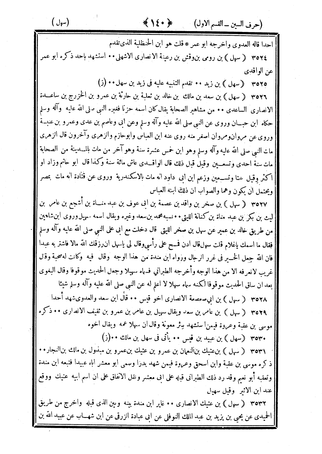 <140> أحدا قال العدوي وأخرجه أبو عمر قلت هو بن الحنظلية الذي تقدم سهل بن رومي بن وقش بن زغبة الأنصاري الأشهلي استشهد بأحد ذكره أبو عمر عن الواقدي سهل بن زيد تقدم التنبيه عليه في زيد بن سهل سهل بن سعد بن مالك بن خالد بن ثعلبة بن حارثة بن عمرو بن الخزرج بن ساعدة الأنصاري الساعدي من مشاهير الصحابة يقال كان اسمه حزنا فغيره النبي صلى الله عليه وسلم حكاه بن حبان وروى عن النبي صلى الله عليه وسلم وعن أبي وعاصم بن عدي وعمرو بن عبسة وروى عن مروان ومروان أصغر منه روى عنه ابنه العباس وأبو حازم والزهري وآخرون قال الزهري مات النبي صلى الله عليه وسلم وهو بن خمس عشرة سنة وهو آخر من مات بالمدينة من الصحابة مات سنة إحدى وتسعين وقيل قبل ذلك قال الواقدي عاش مائة سنة وكذا قال أبو حاتم وزاد أو أكثر وقيل ستا وتسعين وزعم بن أبي داود أنه مات بالإسكندرية وروى عن قتادة أنه مات بمصر ويحتمل أن يكون وهما والصواب أنه ذلك ابنه العباس سهل بن صخر بن واقد بن عصمة بن أبي عوف بن عبد مناه بن شجع بن عامر بن ليث بن بكر بن عبد مناة بن كنانة الليثي نسبه محمد بن سعد وغيره ويقال اسمه سهيل وروى بن شاهين من طريق خالد بن عمير عن سهيل بن صخر الليثي قال دخلت مع أبي على النبي صلى الله عليه وسلم فقال ما اسمك يا غلام قلت سهل قال ادن فمسح على رأسي وقال لي يا سهل إن رزقك الله مالا فاشتر به بعدا فإن الله جعل الخير في غرر الرجال ورواه بن منده من هذا الوجه وقال فيه وكانت له صحبة وقال غريب لا نعرفه إلا من هذا الوجه وخرجه الطبراني فسماه سهيلا وجعل الحديث موقوفا وقال البغوي بعد أن ساق الحديث موقوفا لكنه سماه سهلا لا أعلم له عن النبي صلى الله عليه وسلم شيئا سهل بن أبي صعصعة الأنصاري أخو قيس قال بن سعد والعدوي شهد أحدا سهل بن عامر بن سعد ويقال سهيل بن عامر بن عمرو بن ثقيف الأنصاري ذكره موسى بن عقبة وعروة فيمن استشهد ببئر معونة وقال إن سهلا عمه ويقال أخوه سهل بن عبيد بن قيس يأتي في سهل بن مالك سهل بن عتيك بن النعمان بن عمرو بن عتيك بن عمرو بن مبذول بن مالك بن النجار ذكره موسى بن عقبة وابن إسحاق وعروة فيمن شهد بدرا وسمي أبو معشر أباه عبيدا فتبعه بن منده وتعقبه أبو نعيم وقد رد على ذلك الطبراني قبله على أبي معشر ونقل الاتفاق على أن اسم أبيه عتيك ووقع عند بن الأثير وقيل سهيل سهل بن عتيك الأنصاري غاير بن منده بينه وبين الذي قبله وأخرج من طريق الحميدي عن يحيى بن يزيد بن عبد الملك النوفلي عن أبي عبادة الزرقي عن بن شهاب عن عبيد الله بن §
