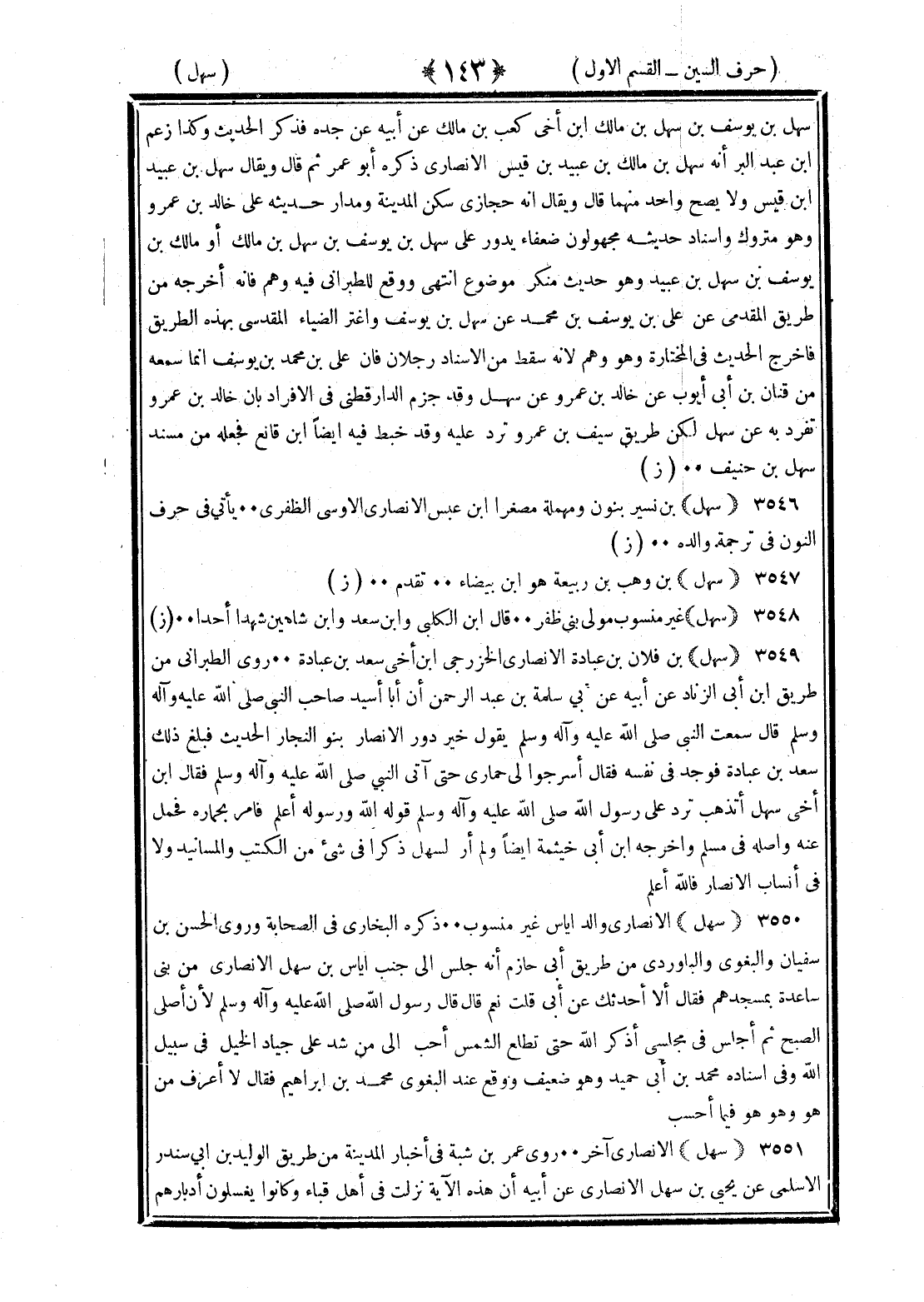 <143> سهل بن يوسف بن سهل بن مالك أبن أخي كعب بن مالك عن أبيه عن جده فذكر الحديث وكذا زعم بن عبد البر أنه سهل بن مالك بن عبيد بن قيس الأنصاري ذكره أبو عمر ثم قال ويقال سهل بن عبيد بن قيس ولا يصح واحد منهما قال ويقال إنه حجازي سكن المدينة ومدار حديثه على خالد بن عمرو وهو متروك وفي إسناد حديثه مجهولون ضعفاء يدور على سهل بن يوسف بن سهل بن مالك أو مالك بن يوسف بن سهل بن عبيد وهو حديث منكر موضوع انتهى ووقع للطبراني فيه وهم فإنه أخرجه من طريق المقدمي عن علي بن يوسف بن محمد عن سهل بن يوسف واغتر الضياء المقدسي بهذه الطريق فأخرج الحديث في المختارة وهو وهم لأنه سقط من الإسناد رجلان فإن علي بن محمد بن يوسف إنما سمعه من قنان بن أبي أيوب عن خالد بن عمرو عن سهل وقد جزم الدارقطني في الأفراد بأن خالد بن عمرو تفرد به عن سهل لكن طريق سيف بن عمر ترد عليه وقد خبط فيه أيضا بن قانع فجعله من مسند سهل بن حنيف سهل بن نسير بنون ومهملة مصغرا بن عنبس الأنصاري الأوسي الظفري يأتي في حرف النون في ترجمة والده سهل بن وهب بن ربيعة هو بن بيضاء تقدم سهل غير منسوب مولى بني ظفر قال بن الكلبي وابن سعد وابن شاهين شهد أحدا سهل بن فلان بن عبادة الأنصاري الخزرجي بن أخي سعد بن عبادة روى الطبراني من طريق بن أبي الزناد عن أبيه عن أبي سلمة بن عبد الرحمن أن أبا أسيد صاحب النبي صلى الله عليه وسلم قال سمعت النبي صلى الله عليه وسلم يقول خير دور الأنصار بنو النجار الحديث فبلغ ذلك سعد بن عبادة فوجد في نفسه فقال أسرجوا إلى حماري حتى آتي النبي صلى الله عليه وسلم فقال بن أخي سهل أتذهب ترد على رسول الله صلى الله عليه وسلم قوله الله ورسوله أعلم فأمر بحماره فحل عنه وأصله في مسلم وأخرجه بن أبي خيثمة أيضا ولم أر لسهل ذكرا في شيء من الكتب والمسانيد ولا في أنساب الأنصاري فالله أعلم سهل الأنصاري والد إياس غير منسوب ذكره البخاري في الصحابة وروى الحسن بن سفيان والبغوي والباوردي من طريق أبي حازم أنه جلس إلى جنب إياس بن سهل الأنصاري من بني ساعدة بمسجدهم فقال ألا أحدثك عن أبي قلت نعم قال قال رسول الله صلى الله عليه وسلم لأن أصلي الصبح ثم أجلس في مجلسي أذكر الله حتى تطلع الشمس أحب إلي من شد على جياد الخيل في سبيل الله وفي إسناده محمد بن أبي حميد وهو ضعيف ووقع عند البغوي محمد بن إبراهيم فقال لا أعرف من هو وهو هو فيما أحسب سهل الأنصاري آخر روى عمر بن شبة في أخبار المدينة من طريق الوليد بن أبي سندر الأسلمي عن يحيى بن سهل الأنصاري عن أبيه أن هذه الآية نزلت في أهل قباء وكانوا يغسلون أدبارهم §