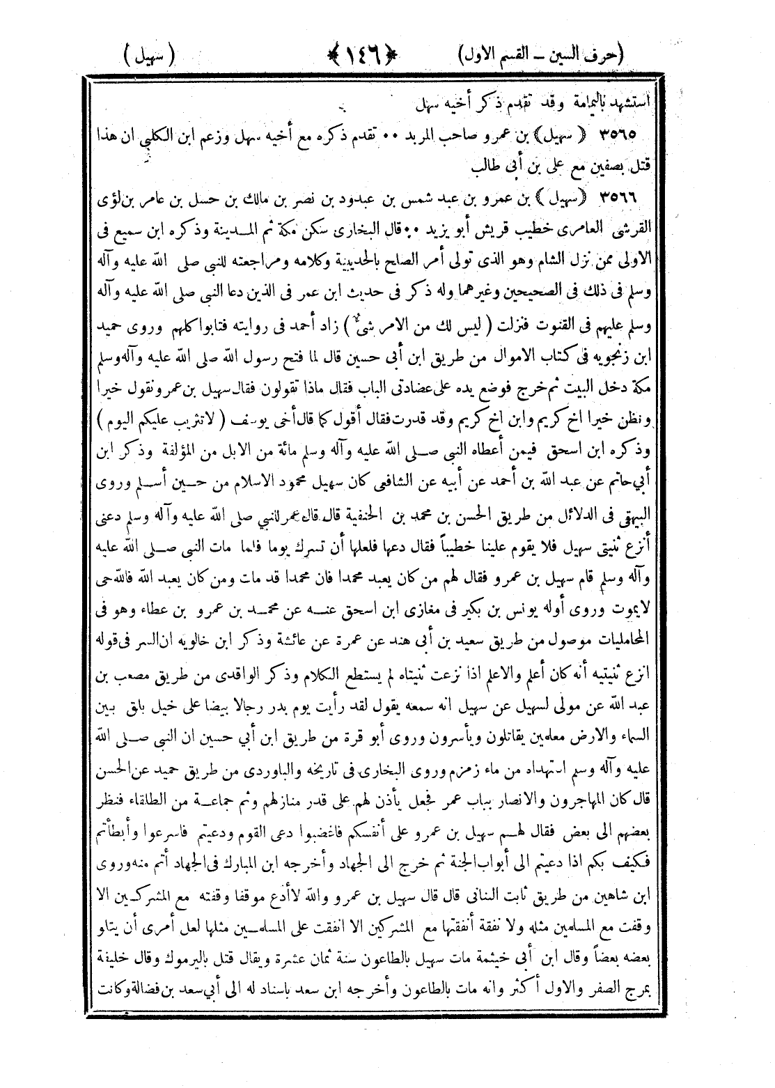 <146> استشهد باليمامة وقد تقدم ذكر أخيه سهل سهيل بن عمرو صاحب المربد تقدم ذكره مع أخيه سهل وزعم بن الكلبي أن هذا قتل بصفين مع علي بن أبي طالب سهيل بن عمرو بن عبد شمس بن عبد ود بن نصر بن مالك بن حسل بن عامر بن لؤي القرشي العامري خطيب قريش أبو يزيد قال البخاري سكن مكة ثم المدينة وذكره بن سميع في الأولى ممن نزل الشام وهو الذي تولى أمر الصلح بالحديبية وكلامه ومراجعته للنبي صلى الله عليه وسلم في ذلك في الصحيحين وغيرهما وله ذكر في حديث بن عمر في الذين دعا النبي صلى الله عليه وسلم عليهم في القنوت فنزلت ليس لك من الأمر شيء زاد أحمد في روايته فتابوا كلهم وروى حميد بن زنجويه في كتاب الأموال من طريق بن أبي حسين قال لما فتح رسول الله صلى الله عليه وسلم مكة دخل البيت ثم خرج فوضع يده على عضادتي الباب فقال ماذا تقولون فقال سهيل بن عمرو نقول خيرا ونظن خيرا أخ كريم وابن أخ كريم وقد قدرت فقال أقول كما قال أخي يوسف لا تثريب عليكم اليوم وذكره بن إسحاق فيمن أعطاه النبي صلى الله عليه وسلم مائة من الإبل من المؤلفة وذكر بن أبي حاتم عن عبد الله بن أحمد عن أبيه عن الشافعي كان سهيل محمود الإسلام من حين أسلم وروى البيهقي في الدلائل من طريق الحسن بن محمد بن الحنفية قال قال عمر للنبي صلى الله عليه وسلم دعني أنزع ثنيتي سهيل فلا يقوم علينا خطيبا فقال دعها فلعلها أن تسرك يوما فلما مات النبي صلى الله عليه وسلم قام سهيل بن عمرو فقال لهم من كان يعبد محمدا فإن محمدا قد مات ومن كان يعبد الله فإن الله حي لا يموت وروى أوله يونس بن بكير في مغازي بن إسحاق عنه عن محمد بن عمرو بن عطاء وهو في المحامليات موصول من طريق سعيد بن أبي هند عن عمرة عن عائشة وذكر بن خالويه أن السر في قوله أنزع ثنيتيه أنه كان أعلم والأعلم إذا نزعت ثنيتاه لم يستطع الكلام وذكر الواقدي من طريق مصعب بن عبد الله عن مولى لسهيل عن سهيل أنه سمعه يقول لقد رأيت يوم بدر رجالا بيضا على خيل بلق بين السماء والأرض معلمين يقاتلون ويأسرون وروى أبو قرة من طريق بن أبي حسين أن النبي صلى الله عليه وسلم استهداه من ماء زمزم وروى البخاري في تاريخه والباوردي من طريق حميد عن الحسن قال كان المهاجرون والأنصار بباب عمر فجعل يأذن لهم على قدر منازلهم وثم جماعة من الطلقاء فنظر بعضهم إلى بعض فقال لهم سهيل بن عمرو على أنفسكم فاغضبوا دعي القوم ودعيتم فأسرعوا وأبطأتم فكيف بكم إذا دعيتم إلى أبواب الجنة ثم خرج إلى الجهاد وأخرجه بن المبارك في الجهاد أتم منه وروى بن شاهين من طريق ثابت البناني قال قال سهيل بن عمرو والله لا أدع موقفا وقفته مع المشركين إلا وقفت مع المسلمين مثله ولا نفقة أنفقتها مع المشركين إلا أنفقت على المسلمين مثلها لعل أمري أن يتلو بعضه بعضها وقال بن أبي خيثمة مات سهيل بالطاعون سنة ثمان عشرة ويقال قتل باليرموك وقال خليفة بمرج الصفر والأول أكثر وأنه مات بالطاعون وأخرجه بن سعد بإسناد له إلى أبي سعد بن أبي فضالة وكانت §