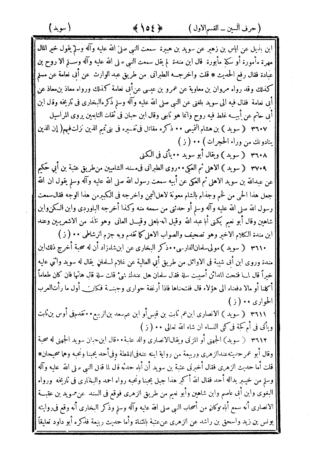 <154> بن بديل عن إياس بن زهير عن سويد بن هبيرة سمعت النبي صلى الله عليه وسلم يقول خير المال مهرة مأمورة أو سكة مأبورة قال بن منده لم يقل سمعت النبي صلى الله عليه وسلم إلا روح بن عبادة عن أبي نعامة عن مسلم وقد رواه مروان بن معاوية عن عمرو بن عيسى عن أبي نعامة فقال برفع الحديث قلت وأخرجه الطبراني من طريق عبد الوارث عن أبي نعامة عن مسلم كذلك وقد رواه مروان بن معاوية عن عمرو بن عيسى عن أبي نعامة كذلك ورواه معاذ بن معاذ عن أبي نعامة فقال فيه إلى سويد بلغني عن النبي صلى الله عليه وسلم ذكره البخاري في تاريخه وقال بن أبي حاتم عن أبيه غلط فيه روح وإنما هو تابعي وقال بن حبان في ثقات التابعين يروي المراسيل سويد بن هشام التميمي ذكره مقاتل في تفسيره في بني تميم الذين نزلت فيهم إن الذين ينادونك من وراء الحجرات الآية سويد ويقال أبو سويد يأتي في الكنى سويد الآهلي ثم العكي روى الطبراني في مسند الشاميين من طريق عتبة بن أبي حكيم عن عبد الله بن سويد الآهلي ثم العكي عن أبيه سمعت رسول الله صلى الله عليه وسلم يقول إن الله جعل هذا الحي من لخم وجذام بالشام معونة لأهل اليمن وأخرجه في الكبير من هذا الوجه فقال سمعت رسول الله صلى الله عليه وسلم يقول أو حدثني من سمعه منه وكذا أخرجه الباوردي وابن السكن وابن شاهين وقال أبو نعيم يكنى أبا عبد الله وقيل إنه باهلي وقيل ألهاني وهو فخذ من الأشعريين وعنده بن منده الكلام الأخير وهو تصحيف والصواب الآهلي كما تقدم وبه جزم الرشاطي سويد مولى سلمان الفارسي ذكر البخاري عن بن قهزاد أن له صحبة أخرج ذلك بن منده وروى بن أبي شيبة في الأوائل من طريق أبي العالية عن غلام لسلمان يقال له سويد وأثنى عليه خيرا قال لما فتحت المدائن أصبت سلة فقال سلمان هل عندك شيء قلت سلة قال هاتها فإن كان طعاما أكلناه أو مالا رفعناه إلى هؤلاء قال ففتحناها فإذا أرغفة حوارى وجبنة فكان أول ما رأيت العرب الحواري سويد الأنصاري بن عمر ثابت بن قيس أو بن عم سعد بن الربيع تقدم في أوس بن ثابت ويأتي في أم كجة في كنى النساء إن شاء الله تعالى سويد الجهني أو المزني ويقال الأنصاري والد عقبة قال بن حبان سويد الجهني له صحبة وقال أبو عمر حديثه عند الزهري وربيعة من رواية ابنه عنه في اللقطة وفي أحد يحبنا ونحبه وهما صحيحان قلت أما حديث الزهري فقال أخبرني عقبة بن سويد أن أباه حدثه قال لما قفل النبي صلى الله عليه وسلم من خيبر بدا له أحد فقال الله أكبر هذا جبل يحبنا ونحبه رواه أحمد والبخاري في تارخيه ورواه البغوي وابن أبي عاصم وابن شاهين وأبو نعيم من طريق الزهري فوقع في السند عن سويد بن عقبة الأنصاري أنه سمع أباه وكان من أصحاب النبي صلى الله عليه وسلم وذكر البخاري أنه وقع في رواية يونس بن زيد وإسحاق بن راشد عن الزهري عن عتبة بالمثناة وأما حديث ربيعة فذكره أبو داود تعليقا §