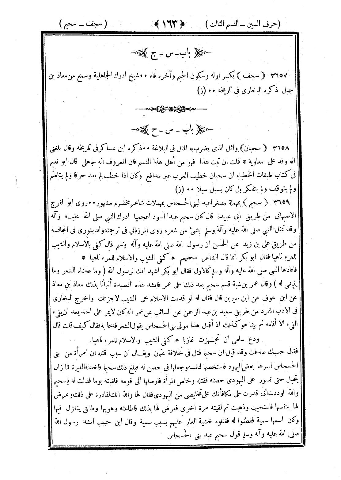 <163> سجف بكسر أوله وسكون الجيم وآخره فاء شيخ أدرك الجاهلية وسمع من معاذ بن جبل ذكره البخاري في تاريخه السين بعدها الحاء سحبان وائل الذي يضرب به المثل في البلاغة ذكره بن عساكر في تاريخه وقال بلغني وفد على معاوية قلت أن ثبت هذا فهو من أهل هذا القسم فإن المعروف أنه جاهلي وقال أبو نعيم في كتاب طبقات الخطباء كان سحبان خطيب العرب غير مدافع وكان إذا خطب لم يعد حرفا ولم يتلعثم ولم يتوقف ولم يتفكر بل كان يسيل سيلا سحيم بمهملة مصغرا عبد لبني الحسحاس بمهملات شاعر مخضرم مشهور روى أبو الفرج الأصبهاني من طريق أبي عبيدة قال كان سحيم عبدا أسود أعجميا أدرك النبي صلى الله عليه وسلم وقد تمثل النبي صلى الله عليه وسلم بشيء من شعره روى المرزباني في ترجمته والدينوري في المجالسة من طريق علي بن زيد عن الحسن أن رسول الله صلى الله عليه وسلم قال كفى بالإسلام والشيب للمرء ناهيا فقال أبو بكر إنما قال الشاعر كفى الشيب والإسلام للمرء ناهيا فأعادها النبي صلى الله عليه وسلم كالأول فقال أبو بكر أشهد إنك لرسول الله وما علمناه الشعر وما ينبغي له وقال عمر بن شبة قدم سحيم بعد ذلك على عمر فأنشده القصيدة أنبأنا بذلك معاذ بن جبل عن بن عوف عن بن سيرين قال فقال له لو قدمت الإسلام على الشيب لأجزتك وأخرج البخاري في الأدب المفرد من طريق سعيد بن عبد الرحمن عن السائب عن عمر أنه كان لا يمر على أحد يعد أن يفيء الفيء الا أقامه ثم بينا هو كذلك إذ أقبل مولى بني الحسحاس يقول الشعر فدعا به فقال كيف قلت قال ودع سليمي أن تجهزت غاديا كفى الشيب والأسلام للمرء ناهيا فقال حسبك صدقت صدقت وقد قيل أن سحيما قتل في خلافة عثمان ويقال أن سبب قتله أن امرأة من بني الحسحاس اسرها بعض اليهود فاستخصها لنفسه وجعلها في حصن له فبلغ ذلك سحيما فأخذته الغيرة فما زال يتحيل حتى تسور على اليهودي حصنه فقتله وخلص المرأة فأوصلها إلى قومه فلقيته يوما فقالت له يا سحيم والله لوددت إني قدرت على مكافأتك على تخليصي من اليهودي فقال لها والله انك لقادرة على ذلك وعرض لها بنفسها فاستحيت وذهبت ثم لقيته مرة أخرى فعرض لها بذلك فأطاعته وهويها وطفق يتغزل فيها وكان اسمها سمية ففطنوا له فقتلوه خشية العار عليهم بسبب سمية وقال بن حبيب أنشدت رسول الله صلى الله عليه وسلم قول سحيم عبد بني الحسحاس §