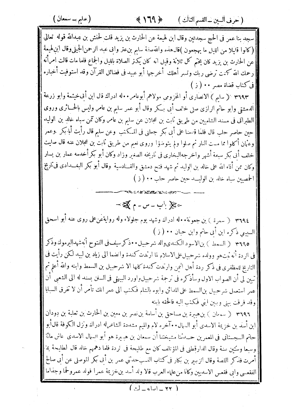 <169> سجد بنا عمر في الحج سجدتين وقال بن لهيعة عن الحارث بن يزيد قلت لحنش بن عبد الله قوله تعالى كانوا قليلا من الليل ما يهجعون قال هذه والله صفة سليم بن عتر وأبي عبد الرحمن الجبلي وقال بن لهيعة عن الحارث بن يزيد كان يختم كل ثلاثة وقيل أنه كان يكثر الصلاة بالليل والجماع فلما مات قالت امرأته رحمك الله كنت ترضي ربك وتسر أهلك أخرجها أبو عبيد في فضائل القرآن وقد استوفيت اخباره في كتاب قضاة مصر سليم الأنصاري أو المخزومي مولاهم أبو عامر له إدراك قال بن خيثمة وأبو زرعة الدمشقي وأبو حاتم الرازي صلى خلف أبي بكر وقال أبو عمر سليم بن عامر وأبو عامر وليس بالخبائري وروى الطبراني في مسند الشاميين من طريق ثابت بن عجلان عن سليم أبي عامر وكان ممن سباه خالد بن الوليد حين حاصر حلب قال فلما قدمنا على أبي بكر جعلني في المكتب وعن سليم قال رأيت أبا بكر وعمر وعثمان أكلوا مما مست النار ثم صلوا ولم يتوضئوا وروى دحيم من طريق ثابت بن عجلان عنه قال صليت خلف أبي بكر سبعة أشهر وأخرجه البخاري في تاريخه الصغير وزاد وكان أبو بكر أخدمه عمار بن ياسر وكان ممن أفاء الله على خالد بن الوليد ثم شهد فتح دمشق والقادسية وقال أبو بكر البغدادي في تاريخ الحمصيين سباه خالد بن الوليد حين حاصر حلب السين بعدها الميم سمرة بن جعونة له إدراك وشهد يوم جلولاء وله رواية عن علي روى عنه أبو إسحاق السبيعي ذكره بن أبي حاتم وابن حبان السمط بن الأسود الكندي والد شرحبيل ذكر سيف في الفتوح أنه شهد اليرموك وذكر في الردة أنه ثبت هو وولده شرحبيل على الإسلام لما ارتدت كندة وانضما إلى زياد بن لبيد لكن رأيت في التاريخ للمظفري في ذكر ردة أهل اليمن وارتدت كندة كلها الا شرحبيل بن السمط وابنه والله أعلم ثم تبين لي أن الصواب الأول وسأذكره في ترجمة شرحبيل وأورد البيهقي في السنن بسند له إلى الشعبي أن عمر استعمل شرحبيل بن السمط على المدائن وأبوه بالشام فكتب إلى عمر أنك تأمر ألا تفرق السبايا وقد فرقت بيني وبين ابني فكتب إليه فألحقه بابنه سمعان بن هبيرة بن مساحق بن بجير بن أسامة بن نصر بن قعين بن الحارث بن ثعلبة بن دودان بن أسد بن خزيمة الأسدي أبو السمال آخره لام والميم مشددة الشاعر له إدراك ونزل الكوفة قال أبو حاتم السجستاني في المعمرين حدثنا مشيختنا أن سمعان بن هبيرة هو أبو السمال الأسدي عاش مائة وسبعا وستين سنة وقال الدارقطني في المؤتلف كان مع طليحة في الردة فلما دهمهم خالد قال لطليحة بم أمرت فذكر القصة وقال الزبير بن بكار في كتاب النسب حدثني عمر بن أبي بكر الموصلي عن أبي صالح الفقعي وأبي فقعس الأسديين وكان من علماء العرب قال ولد أسد بن خزيمة عمرا فولد عمرو لخما وجذيمة §