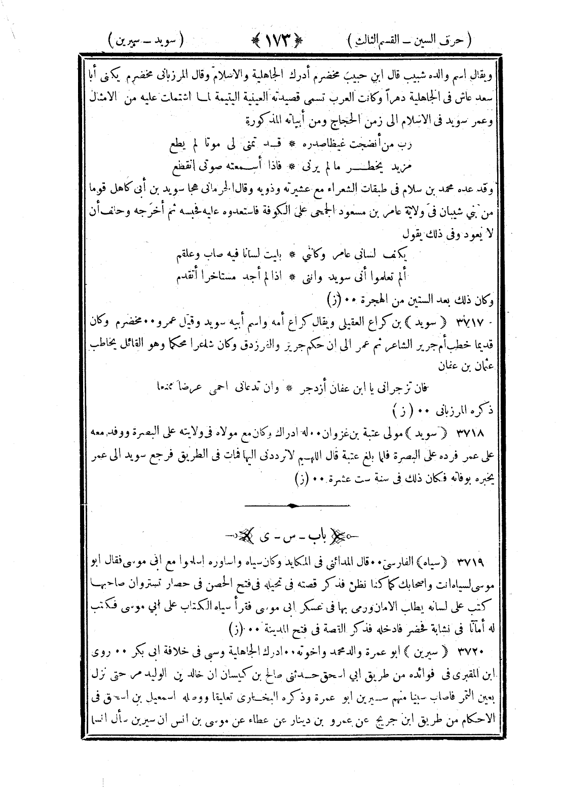 <173> ويقال اسم والده شبيب قال بن حبيب مخضرم أدرك الجاهلية والإسلام وقال المرزباني مخضرم يكنى أبا سعد عاش في الجاهلية دهرا وكانت العرب تسمي قصيدته العينيه اليتيمة لما اشتملت عليه من الأمثال وعمر سويد في الإسلام إلى زمن الحجاج ومن أبياته المذكورة رب من انضجت غيظا صدره قد تمنى لي موتا لم يطع مزبد يخطر ما لم يرني فإذا أسمعته صوتي انقطع وقد عده محمد بن سلام في طبقات الشعراء مع عشيرته وذويه وقال الحرمازي هجا سويد بن أبي كاهل قوما من بني شيبان في ولاية عامر بن مسعود الجمحي على الكوفة فاستعدوه عليه فحبسه ثم أخرجه وحلف ألا يعود وفي ذلك يقول يكف لساني عامر وكأنما بليت لسانا فيه صاب وعلقم ألم تعلموا إني سويد وأنني إذا لم أجد مستأخرا أتقدم وكان ذلك بعد الستين من الهجرة سويد بن كراع العقيلي يقال كراع أمه واسم أبيه سويد وقيل عمرو مخضرم وكان قديما خطب أم جرير الشاعر ثم عمر إلى أن حكم بين جرير والفرزدق وكان شاعرا محكما وهو القائل يخاطب عثمان بن عفان فإن تزجراني يا بن عفان ازدجر وإن تدعاني احم عرضا ممنعا ذكره المرزباني سويد مولى عتبة بن غزوان له إدراك وكان مع مولاه في ولايته على البصرة ووفد معه على عمر فرده على البصرة فلما بلغ عتبة قال اللهم لا تردني إليها فمات في الطريق فرجع سويد إلى عمر يخبره بوفاته فكان ذلك سنة ست عشرة السين بعدها الياء سياه الفارسي قال المدائني في المكايد وكان سياه وأساورة أسلموا مع أبي موسى فقال أبو موسى لسياه ما أنت وأصحابك كما كنا نظن فذكر قصته في تحيله في فتح الحصن في حصار تستر وأن صاحبها كتب على لسانه يطلب الأمان ورمى بها في عسكر أبي موسى فقرأ سياه الكتاب على أبي موسى فكتب له أمانا في نشابة فحضر فأدخله فذكر القصة في فتح المدينة سيرين أبو عمرة والد محمد وإخوته أدرك الجاهلية وسبي في خلافة أبي بكر روى بن المقبري في فوائده من طريق أبي إسحاق حدثني صالح بن كيسان أن خالد بن الوليد مر حتى نزل بعين التمر فأصاب سبيا منهم سيرين أبو عمرة وذكره البخاري تعليقا ووصله إسماعيل بن إسحاق في الأحكام من طريق بن جريج عن عمرو بن دينار عن عطاء عن موسى بن أنس أن سيرين سأل أنسا §