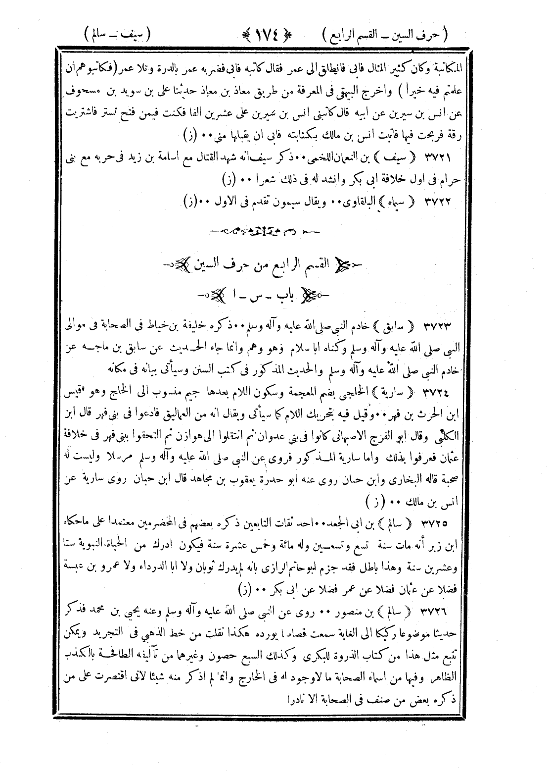 <174> المكاتبة وكان كثير المال فأبى فانطلق إلى عمر فقال كاتبة فأبى فضربه عمر بالدرة وتلا عمر فكاتبوهم أن علمتم فيهم خيرا وأخرج البيهقي في المعرفة من طريق معاذ بن معاذ حدثنا علي بن سويد بن منجوف عن أنس بن سيرين عن أبيه قال كاتبني أنس بن مالك على عشرين ألفا فكنت فيمن فتح تستر فاشتريت رثة فربحت فيها فأتيت أنس بن مالك بكتابته فأبى أن يقبلها مني سيف بن النعمان اللخمي ذكر سيف أنه شهد القتال مع أسامة بن زيد في حربه مع بني جذام في أول خلافة أبي بكر وأنشد له في ذلك شعرا سيماه البلقاوي ويقال سيمويه تقدم في الأول القسم الرابع من حرف السين السين بعدها الألف سابق خادم النبي صلى الله عليه وسلم ذكره خليفة بن خياط في الصحابة في موالي النبي صلى الله عليه وسلم وكناه أبا سلام وهو وهم وإنما جاء الحديث عن سابق بن حية عن خادم النبي صلى الله عليه وسلم والحديث المذكور في كتب السنن وسيأتي بيانه في مكانه سارية الخلجي بضم المعجمة وسكون اللام بعدها جيم منسوب إلى الخلج وهو قيس بن الحارث بن فهر وقيل فيه بتحريك اللام كما سيأتي ويقال أنه من العماليق فادعوا في بني فهر قاله بن الكلبي وقال أبو الفرج الأصبهاني كانوا في بني عدوان ثم انتقلوا إلى هوازن ثم التحقوا ببني فهر في خلافة عثمان فعرفوا بذلك وأما سارية المذكور فروى عن النبي صلى الله عليه وسلم مرسلا وليست له صحبة قاله البخاري وابن حبان روى عنه أبو حزرة يعقوب بن مجاهد قال بن حبان روى سارية عن أنس بن مالك سالم بن أبي الجعد أحد ثقات التابعين ذكره بعضهم في المخضرمين معتمدا على ما حكاه بن زبر أنه مات سنة تسع وتسعين وله مائة وخمس عشرة سنة فيكون أدرك من الحياة النبوية ستا وعشرين سنة وهذا باطل فقد جزم أبو حاتم الرازي بأنه لم يدرك ثوبان ولا أبا الدرداء ولا عمرو بن عبسة فضلا عن عثمان فضلا عن عمر فضلا عن أبي بكر سالم بن منصور روى عن النبي صلى الله عليه وسلم وعنه يحيى بن محمد فذكر حديثا موضوعا ركيكا إلى الغاية فسمعت قصاصا يورده هكذا نقلت من خط الذهبي في التجريد ويمكن تتبع مثل هذا من كتاب الذروة للبكري وكذلك السبع حصون وغيرهما من تآليفه الطافحة بالكذب الظاهر وفيها من أسماء الصحابة ما لا وجود له في الخارج وإنما لم أذكر منه شيئا لأني اقتصرت على من ذكره بعض من صنف في الصحابة إلا نادرا §