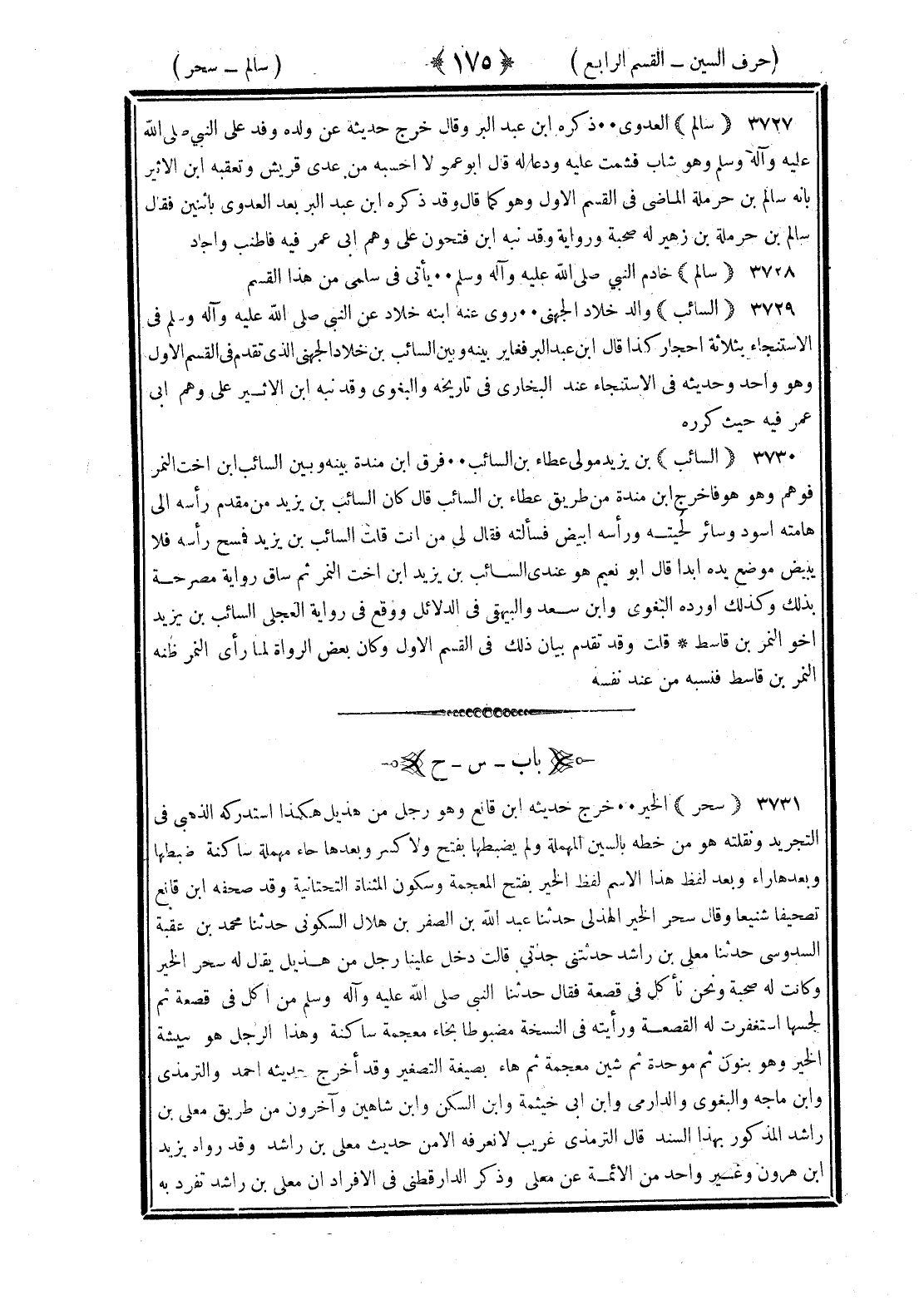 <175> سالم العدوي ذكره بن عبد البر وقال مخرج حديثه عن ولده وفد على النبي صلى الله عليه وسلم وهو شاب فشمت عليه ودعا له قال أبو عمر لا أحسبه من عدي قريش وتعقبه بن الأثير بأنه سالم بن حرملة الماضي في القسم الأول وهو كما قال وقد ذكره بن عبد البر بعد العدوي باثنين فقال سالم بن حرملة بن زهير له صحبة ورواية وقد نبه بن فتحون على وهم أبي عمر فيه فأطنب وأجاد سالم خادم النبي صلى الله عليه وسلم يأتي في سلمى من هذا القسم السائب والد خلاد الجهني روى عنه ابنه خلاد عن النبي صلى الله عليه وسلم في الاستنجاء بثلاثة أحجار كذا قال بن عبد البر فغاير بينه وبين السائب بن خلاد الجهني الذي تقدم في القسم الأول وهو واحد وحديثه في الاستنجاء عند البخاري في تاريخه والبغوي وقد نبه بن الأثير على وهم أبي عمر فيه حيث كرره السائب بن يزيد مولى عطاء بن السائب فرق بن منده بينه وبين السائب بن أخت النمر فوهم وهو هو فأخرج بن منده من طريق عطاء بن السائب قال كان السائب بن يزيد من مقدم رأسه إلى هامته أسود وسائر لحيته ورأسه أبيض فسألته فقال مر بي النبي صلى الله عليه وسلم فقال لي من أنت قلت السائب بن يزيد فمسح رأسي فلا يبيض موضع يده أبدا قال أبو نعيم هو عندي السائب بن يزيد بن أخت النمر ثم ساق رواية مصرحة بذلك وكذا أورده البغوي وابن سعد والبيهقي في الدلائل ووقع في رواية العجلي السائب بن يزيد أخو النمر بن قاسط زاد بن قاسط وتعقبه أبو عمر بأنه ليس من ولد النمر بن قاسط قلت وقد تقدم بيان ذلك في القسم الأول وكان بعض الرواة لما رأى النمر ظنه النمر بن قاسط فنسبه من عند نفسه السين بعدها الحاء سحر الخير خرج حديثه بن قانع وهو رجل من هذيل هكذا استدركه الذهبي في التجريد ونقلته من خطه بالسين المهملة ولم يضبطها بفتح ولا كسر وبعدها حاء مهملة ساكنة ضبطها وبعدها راء وبعد لفظ هذا الاسم لفظة الخير بفتح المعجمة وسكون المثناة التحتانية وقد صحفه بن قانع تصحيفا شنيعا وقال سحر الخير الهذلي حدثنا عبد الله بن الصقر بن هلال السكوني حدثنا محمد بن عقبة السدوسي حدثنا معلى بن راشد حدثتني جدتي قالت دخل علينا رجل من هذيل يقال له سحر الخير وكانت له صحبة ونحن نأكل في قصعة فقال حدثنا النبي صلى الله عليه وسلم أنه من أكل في قصعة ثم لحسها استغفرت له القصعة ورأيته في النسخة مضبوطا بخاء معجمة ساكنة وهذا الرجل هو نبيشة الخير وهو بنون ثم موحدة ثم شين معجمة ثم هاء بصيغة التصغير وقد أخرج حديثه أحمد والترمذي وابن ماجة والبغوي والدارمي وابن أبي خيثمة وابن السكن وابن شاهين وآخرون من طريق معلى بن راشد المذكور بهذا السند قال الترمذي غريب لا نعرفه الا من حديث معلى بن راشد وقد رواه يزيد بن هارون وغير واحد من الأئمة عن معلى وذكر الدارقطني في الأفراد أن معلى بن راشد تفرد به §