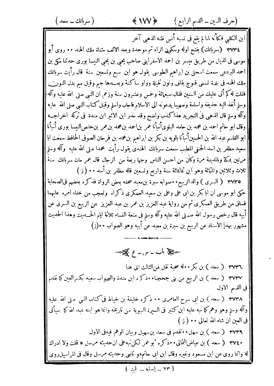 <177> بن الكلبي فكأنه لما لم يقع في نسبه أنس ظنه الذهبي آخر سرباتك بفتح أوله وسكون الراء ثم موحدة وبعد الألف مثناة ملك الهند روى أبو موسى في الذيل من طريق بشر بن أحمد الإسفرائيني صاحب يحيى بن يحيى النيسابوري حدثنا مكي بن أحمد البردعي سمعت إسحاق بن إبراهيم الطوسي يقول هو بن سبع وتسعين سنة قال رأيت سرباتك ملك الهند في بلدة تسمى قنوج بقاف ونون ثقيلة واو ساكنة وبعدها جيم وقيل ميم بدل النون فقلت له كم أتى عليك من السنين قال سبعمائة وخمس وعشرون سنة وزعم أن النبي صلى الله عليه وسلم أنفذ إليه وأسامة وصهيبا يدعونه إلى الإسلام فأجاب وأسلم وقبل كتاب النبي صلى الله عليه وسلم قال الذهبي في التجريد هذا كذب واضح وقد عذر بن الأثير بن منده في تركه إخراجه وقال أبو حامد أحمد بن محمد بن الجليل البلوي أنبأنا عمر بن أحمد بن محمد بن عمر بن حفص النيسابوري أنبأنا أبو القاسم عبد الله بن الحسين بن بالويه بن بكر بن إبراهيم بن محمد بن فرحان الصوفي الحافظ سمعت أبا سعيد مظفر بن أسد الحنفي المتطبب سمعت سرباتك الهندي يقول رأيت محمدا صلى الله عليه وسلم مرتين بمكة وبالمدينة مرة وكان من أحسن الناس وجها ربعة من الرجال قال عمر مات سرباتك سنة ثلاث وثلاثين وثلاث مائة وهو بن ثمانمائة سنة وأربع وتسعين قاله مظفر بن أسد السري والد الربيع صوابه سبرة بن معبد صحفه بعض الرواة فذكره بعضهم في الصحابة حكى أبو موسى أن أبا بكر بن أبي علي وعلي بن سعيد العسكري ذاكراه وتعجب من خفاء أمره عليهما فساق من طريق العسكري ثم من رواية عبد العزيز بن عمر بن عبد العزيز عن الربيع بن السري عن أبيه قال رخص رسول الله صلى الله عليه وسلم في متعة النساء ثلاثة أيام الحديث وهذا الحديث مشهور بهذا الإسناد عن الربيع بن سبرة بن معبد عن أبيه وهو الصواب السين بعدها العين سعد بن بكر له صحبة نقل من الثالث إلى هنا سعد بن الربيع من بني جحجى ذكره بن منده والصواب سعيد بكسر العين كما تقدم في القسم الأول سعد بن أبي سرح العامري ذكره خليفة بن خياط في كتاب النبي صلى الله عليه وسلم وهو وهم كما نبه عليه بن كثير في السيرة النبوية من تاريخه وإنما هو ابنه عبد الله كما سيأتي في العين إن شاء الله تعالى سعد بن سهل تقدم في سعيد بن سهيل وبيان الوهم فيه في الأول سعد بن عياض الثمالي ذكره أبو عمر لكن نبه على أن حديثه مرسل قلت ولا إدراك له وإنما روى عن بن مسعود وغيره وقال بن أبي حاتم هو تابعي وحديثه مرسل وقال في المراسيل روى §