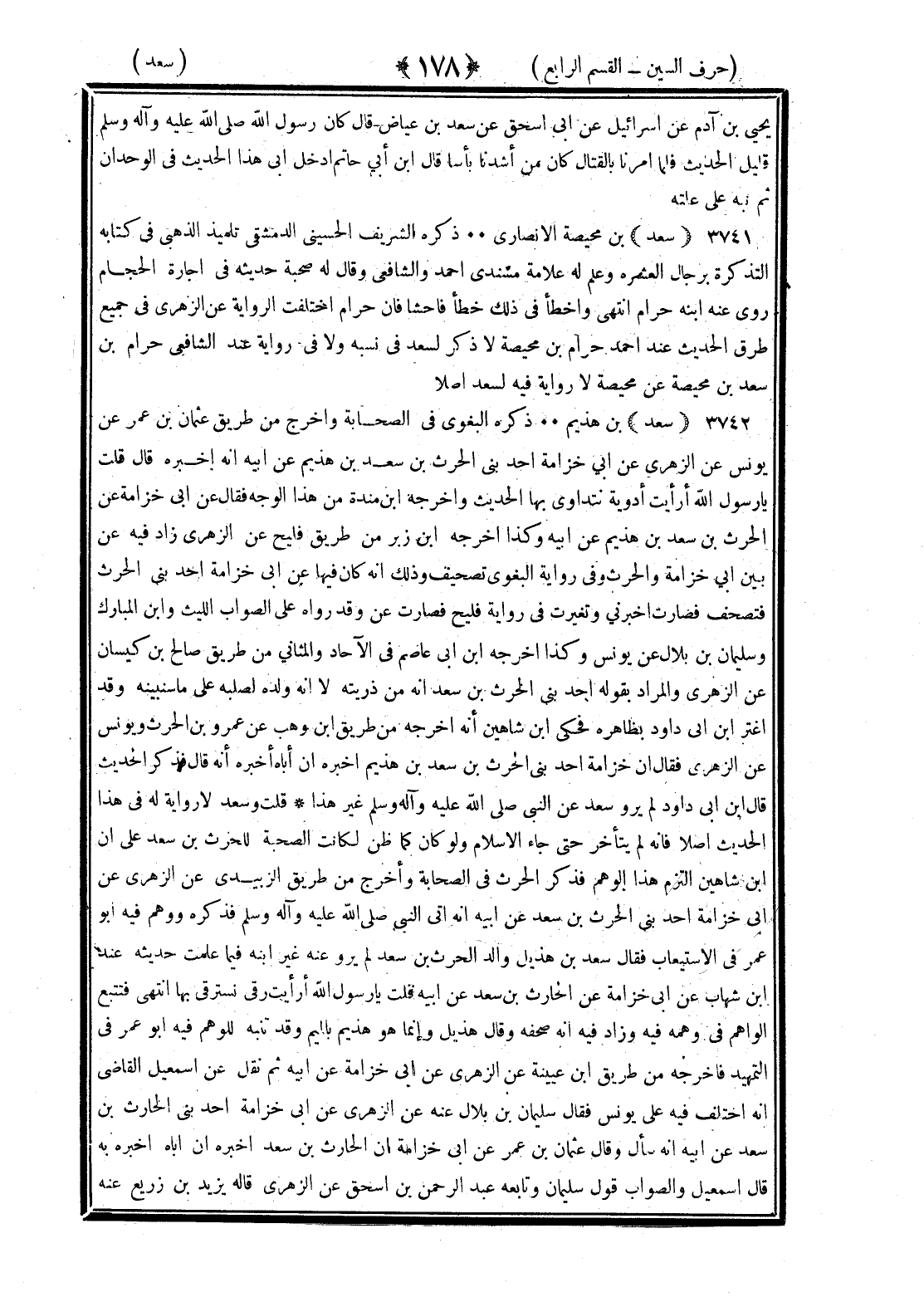<178> يحيى بن آدم عن إسرائيل عن أبي إسحاق عن سعد بن عياض قال كان رسول الله صلى الله عليه وسلم قليل الحديث فلما أمرنا بالقتال كان من اشدنا بأسا قال بن أبي حاتم أدخل أبي هذا الحديث في الوحدان ثم نبه على علته سعد بن محيصة الأنصاري ذكره الشريف الحسيني الدمشقي تلميذ الذهبي في كتابه التذكرة برجال العشرة وعلم له علامة مسندي أحمد والشافعي وقال له صحبة حديثه في إجازة الحجام روى عنه بن حرام انتهى وأخطأ في ذلك خطأ فاحشا فإن حراما اختلفت الرواية عن الزهري في جميع طرق الحديث عند أحمد حرام بن محيصة لا ذكر لسعد في نسبه ولا في رواية عند الشافعي حرام بن سعد بن محيصة عن محيصة لا رواية فيه لسعد أصلا سعد بن هذيم ذكره البغوي في الصحابة وأخرج من طريق عثمان بن عمر عن يونس عن الزهري عن أبي خزامة أحد بني الحارث بن سعد بن هذيم عن أبيه أنه أخبره قال قلت يا رسول الله أرأيت أدوية نتداوى بها الحديث وأخرجه بن منده من هذا الوجه فقال عن أبي خزامة عن الحارث بن يعد بن هذيم عن أبيه وكذا أخرجه بن زبر من طريق فليح عن الزهري زاد فيه عن أبي خزامة والحارث وفي رواية البغوي تصحيف وذلك أنه كان فيها عن أبي خزامة أحد بني الحارث فتصحف فصارت أخبرني وتغيرت في رواية فليح فصارت عن وقد رواه على الصواب الليث وابن المبارك وسليمان بن بلال عن يونس وكذا أخرجه بن أبي عاصم في الآحاد والمثاني من طريق صالح بن كيسان عن الزهري والمراد بقوله أحد بني الحارث بن سعد أنه من ذريته لا أنه ولده لصلبه على ما سنبينه وقد اغتر بن أبي داود بظاهره فحكى بن شاهين أنه أخرجه من طريق بن وهب عن عمرو بن الحارث ويونس عن الزهري فقال أن خزامة أحد بني الحارث بن سعد بن هذيم أخبره أن أباه أخبره أنه قال فذكر الحديث قال بن أبي داود لم يرو سعد عن النبي صلى الله عليه وسلم غير هذا قلت وسعد لا رواية له في هذا الحديث أصلا فإنه لم يتأخر حتى جاء الإسلام ولو كان كما ظن لكانت الصحبة للحارث بن سعد على أن بن شاهين التزم هذا الوهم فذكر الحارث في الصحابة وأخرج من طريق الزبيدي عن الزهري عن أبي خزامة أحد بني الحارث بن سعد عن أبيه أنه أتى النبي صلى الله عليه وسلم فذكره ووهم فيه أبو عمر في الاستيعاب فقال سعد بن هذيل والد الحارث بن سعد لم يرو عنه غير ابنه فيما علمت حديثه عند بن شهاب عن أبي خزامة عن الحارث بن سعد عن أبيه قلت يا رسول الله أرأيت رقي نسترقي بها انتهى فتبع الواهم في وهمه فيه وزاد فيه أنه صحفه وقال هذيل وإنما هو هذيم بالميم وقد تنبه للوهم فيه أبو عمر في التمهيد فأخرجه من طريق بن عيينة عن الزهري عن أبي خزامة عن أبيه ثم نقل عن إسماعيل القاضي أنه اختلف فيه على يونس فقال سليمان بن بلال عنه عن الزهري عن أبي خزامة أحد بني الحارث بن سعد عن أبيه أنه سأل وقال عثمان بن عمر عن أبي خزامة أن الحارث بن سعد أخبره أن أباه أخبر به قال إسماعيل والصواب قول سليمان وتابعه عبد الرحمن بن إسحاق عن الزهري قاله يزيد بن زريع عنه §