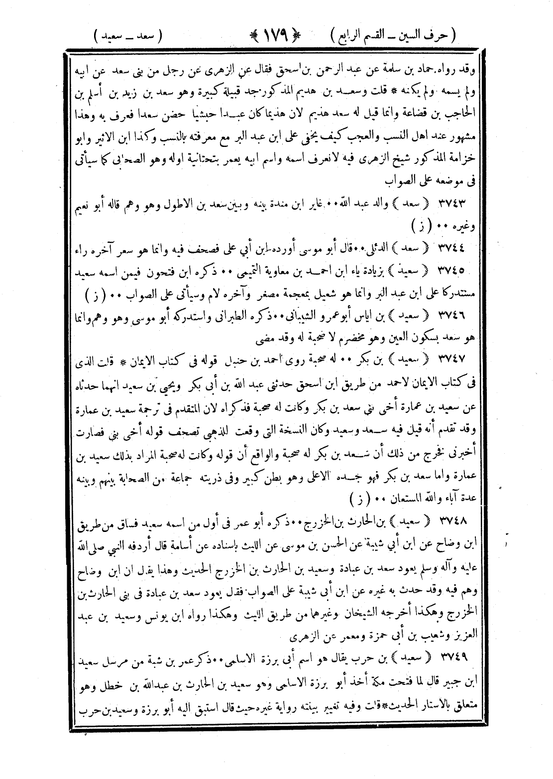 <179> وقد رواه حماد بن سلمة عن عبد الرحمن بن إسحاق فقال عن الزهري عن رجل من بني سعد عن أبيه ولم يسمه ولم يكنه قلت وسعد بن هذيم المذكور جد قبيلة كبيرة وهو سعد بن زيد بن أسلم بن الحاف بن قضاعة وإنما قيل له سعد هذيم لأن هذيما كان عبدا حبشيا حضن سعدا فعرف به وهذا مشهور عند أهل النسب والعجب كيف يخفى على بن عبد البر مع معرفته بالنسب وكذا بن الأثير وأبو خزامة المذكور شيخ الزهري فيه لا نعرف اسمه واسم أبيه يعمر بتحتانية أوله وهو الصحابي كما سيأتي في موضعه على الصواب سعد والد عبد الله غاير بن منده بينه وبين سعد بن الأطول وهو وهم قاله أبو نعيم وغيره سعد الدئلي قال أبو موسى أورده بن أبي علي فصحف فيه وإنما هو سعر آخره راء سعيد بزيادة ياء بن أحمد بن معاوية التميمي ذكره بن فتحون فيمن اسمه سعيد مستدركا على بن عبد البر وإنما هو شعيل بمعجمة مصغرا وآخره لام وسيأتي على الصواب سعيد بن إياس أبو عمرو الشيباني ذكره الطبراني واستدركه أبو موسى وهو وهم وإنما هو سعد بسكون العين وهو مخضرم لا صحبة له وقد مضى سعيد بن بكر له صحبة روى أحمد بن حنبل قوله في كتاب الإيمان قلت الذي في كتاب الإيمان لأحمد من طريق بن إسحاق حدثني عبد الله بن أبي بكر ويحيى بن سعيد أنهما حدثاه عن سعيد بن عمارة أخي بني سعد بن بكر وكانت له صحبة فذكر الأثر المتقدم في ترجمة سعيد بن عمارة وقد تقدم أنه قيل فيه سعد وسعيد وكأن النسخة التي وقعت للذهبي تصحف قوله أخي بني فصارت أخبرني فخرج من ذلك أن سعد بن بكر له صحبة والواقع أن قوله وكانت له صحبة المراد بذلك سعيد بن عمارة وأما سعد بن بكر فهو جده الأعلى وهو بطن كبير وفي ذريته جماعة من الصحابة بينهم وبينه عدة آباء والله المستعان سعيد بن الحارث بن الخزرج ذكره أبو عمر في أول من اسمه سعيد فساق من طريق بن وضاح عن بن أبي شيبة عن الحسن بن موسى عن الليث بإسناده عن أسامة قال أردفه النبي صلى الله عليه وسلم وراءه يعود سعد بن عبادة وسعيد بن الحارث بن الخزرج الحديث وهذا يقال إن بن وضاح وهم فيه وقد حدث غيره عن بن أبي شيبة على الصواب فقال يعود سعد بن عبادة في بني الحارث بن الخزرج وهكذا أخرجه الشيخان وغيرهما من طريق الليث وهكذا رواه بن يونس وسعيد بن عبد العزيز وشعيب بن أبي حمزة ومعمر عن الزهري سعيد بن حرب يقال هو اسم أبي برزة الأسلمي ذكر عمر بن شبة من مرسل سعيد بن جبير قال لما فتحت مكة أخذ برزة الأسلمي وهو سعيد بن الحارث عبد الله بن خطل وهو متعلق بالأستار الحديث قلت وفيه تغيير بينته رواية غيره حيث قال استبق إليه أبو برزة وسعيد بن حرب §