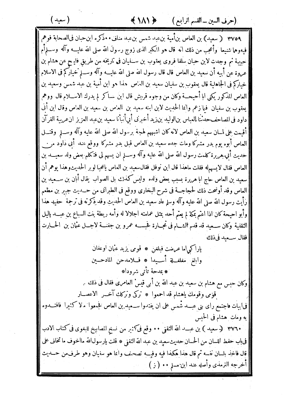 <181> سعيد بن العاص بن أمية بن عبد شمس بن عبد مناف ذكره بن حبان في الصحابة فوهم فيه وهما شنيعا وأعجب من ذلك أنه قال هو المكبر الذي زوج رسول الله صلى الله عليه وسلم أم حبيبة ثم وجدت لابن حبان سلفا فروى يعقوب بن سفيان في تاريخه من طريق مليح عن هشام بن عروة عن أبيه أن سعيد بن العاص قال قال رسول الله صلى الله عليه وسلم خياركم في الإسلام خياركم في الجاهلية قال يعقوب بن سفيان سعيد بن العاص هذا هو بن أمية بن عبد شمس وسعيد بن العاص المذكور يكنى أبا أحيحة وكان من وجوه قريش قال ابن عساكر لم يدرك الإسلام قال ووهم يعقوب بن سفيان فيما زعم وإنما الحديث لابن ابنه سعيد بن العاص بن سعيد بن العاص وقال بن أبي داود في المصاحف حدثنا العباس بن الوليد بن زيد أخبرني أبي أنبأنا سعيد بن عبد العزيز أن عربية القرآن أقيمت على لسان سعيد بن العاص لأنه كان أشبههم لهجة برسول الله صلى الله عليه وسلم وقتل العاص أبوه يوم بدر مشركا ومات جده سعيد بن العاص قبل بدر مشركا ووقع عند أبي داود من حديث أبي هريرة كلمت رسول الله صلى الله عليه وسلم أن يسهم لي فتكلم بعض ولد سعيد بن العاص فقال لا يسهم له فقلت ما هذا قاتل بن نوفل فقال سعيد بن العاص يا عجبا لوبر الحديث وهذا يوهم أن سعيد بن العاص حاج أبا هريرة بسبب بعض ولده وليس كذلك بل الصواب فقال أبان بن سعيد بن العاص وقد أوضحت ذلك بحجاجة في شرح البخاري ووقع في الطبراني من حديث جبير بن مطعم رأيت رسول الله صلى الله عليه وسلم عاد سعيد بن العاص الحديث وقد ذكرته في ترجمة حفيد هذا وأبو أحيحة كان إذا أعتم بمكة لم يعتم أحد بمثل عمامته إجلالا له وأمه ريطة بنت البياع بن عبد ياليل الثقفية وكان سعيد قد قدم الشام في تجارة فحبسه عمرو بن جفنة لأجل عثمان بن الحارث فقال سعيد في ذلك يا راكبي إما عرضت فبلغن قومي يزيدا عثمان أو عفان أو أبلغ مغلغلة أسيدا فلأمدحن المادحين بمدحة تأتي شرودا وكان حبس مع هشام بن سعيد بن عبد الله بن أبي قيس العامري فقال في ذلك قومي وقومك يا هشام اجمعوا تركي وتركك آخر الأعصار في أبيات فاجتمع رأي بني عبد شمس على أن يفتدوا سعيد بن العاص فجمعوا مالا كثيرا فافتدوه به ومات هشام في الحبس سعيد بن عبد الله الثقفي وقع في كثير من نسخ المصابيح للبغوي في كتاب الأدب في باب حفظ اللسان من الحسان حديث سعيد بن عبد الله الثقفي قلت يا رسول الله ما أخوف ما تخاف على قال فأخذ بلسان نفسه ثم قال هذا هكذا فيه وفيه تصحيف وإنما هو سفيان وهو طرف من حديث أخرجه الترمذي وأصله عند بن مسلم §