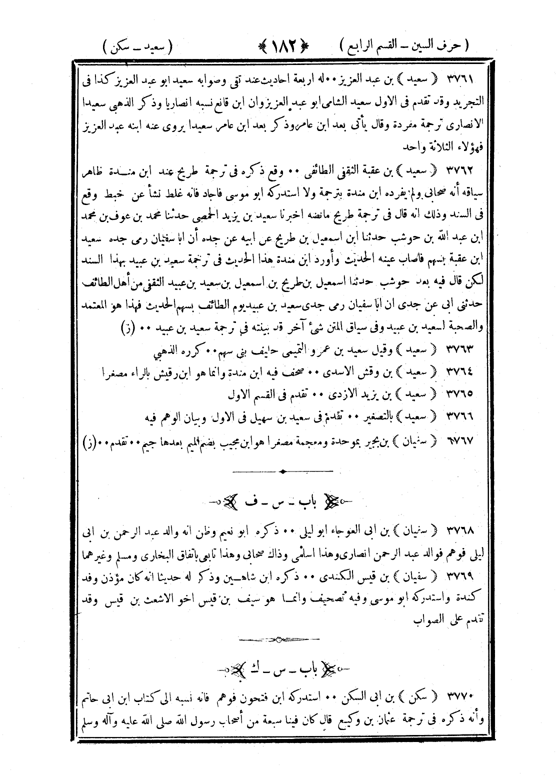 <182> سعيد بن عبد العزيز له أربعة أحاديث عند بقي وصوابه سعيد أبو عبد العزيز كذا في التجريد وقد تقدم في الأول سعيد الشامي أبو عبد العزيز وأن بن قانع نسبه أنصاريا وذكر الذهبي سعيد الأنصاري ترجمة مفردة وقال يأتي بعد بن عامر وذكر بعد بن عامر سعيدا يروي عنه ابنه عبد العزيز فهؤلاء الثلاثة واحد سعيد بن عقبة الثقفي الطائفي وقع ذكره في ترجمة طريح عند بن منده ظاهر سياقه أنه صحابي ولم يفرده بن منده بترجمة ولا استدركه أبو موسى فأجاد فإنه غلط نشأ عن خبط وقع في السند وذلك أنه قال في ترجمة طريح ما نصه أخبرنا سعيد بن يزيد الحمصي حدثنا محمد بن عوف حدثنا محمد بن عبد الله بن حوشب حدثنا بن إسماعيل بن طريح عن أبيه عن جده أن أبا سفيان رمى جده سعيد بن عقبة بسهم فأصاب عينه الحديث وأورد بن منده هذا الحديث في ترجمة سعيد بن عبيد بهذا السند لكن قال فيه بعد حوشب حدثنا إسماعيل بن سعيد بن عبيد الثقفي من أهل الطائف حدثني أبي عن جده أن أبا سفيان رمى جدي سعيد بن عبيد يوم الطائف بسهم الحديث فهذا هو المعتمد والصحبة لسعيد بن عبيد وفي سياق المتن شيء آخر قد بينته في ترجمة سعيد بن عبيد سعيد وقيل معبد بن عمرو التميمي حليف بني سهم كرره الذهبي سعيد بن وقش الأسدي صحف فيه بن منده وإنما هو بن رقيش بالراء مصغرا سعيد بن يزيد الأزدي تقدم في القسم الأول سعيد بالتصغير تقدم في سعيد بن سهيل في الأول وبيان الوهم فيه السين بعدها الفاء سفيان بن بجير بموحدة وعجمة مصغرا وهو لبن مجيب بضم الميم بعدها جيم تقدم سفيان بن أبي العوجاء أبو ليلى ذكره أبو نعيم وظن أنه والد عبد الرحمن بن أبي ليلى فوهم فوالد عبد الرحمن أنصاري وهذا سلمي وذاك صحابي وهذا تابعي باتفاق البخاري ومسلم وغيرهما سفيان بن قيس الكندي ذكره بن شاهين وذكر له حديثا أنه كان مؤذن وفد كنده واستدركه أبو موسى وفيه تصحيف وإنما هو سيف بن قيس أخو الأشعث بن قيس وقد تقدم على الصواب السين بعدها الكاف سكن بن أبي السكن استدركه بن فتحون فوهم فإنه نسبه إلى كتاب بن حاتم وأنه ذكره في ترجمة عثمان بن وكيع قال كان فينا سبعة من أصحاب رسول الله صلى الله عليه وسلم §