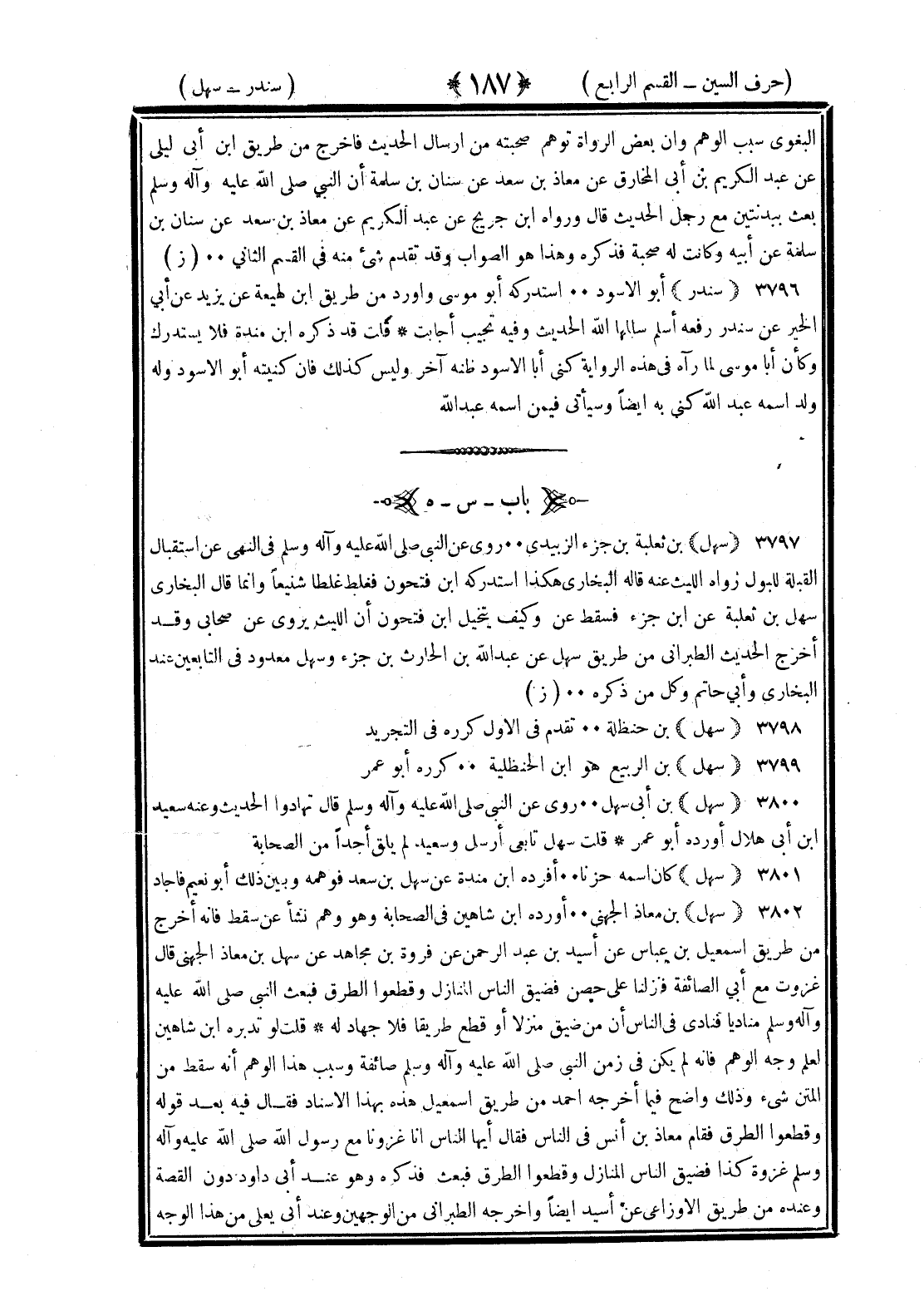 <187> البغوي سبب الوهم وأن بعض الرواة توهم صحبته من إرسال الحديث فأخرج من طريق بن أبي ليلى عن عبد الكريم بن أبي المخارق عن معاذ بن سعد عن سنان بن سلمة أن النبي صلى الله عليه وسلم بعث ببدنتين مع رجل الحديث قال ورواه بن جريج عن عبد الكريم عن معاذ بن سعد عن سنان بن سلمة عن أبيه وكانت له صحبة فذكره وهذا هو الصواب وقد تقدم شيء منه في القسم الثاني سندر أبو الأسود استدركه أبو موسى وأورد من طريق بن لهيعة عن يزيد عن أبي الخير عن سندر رفعه أسلم سالمها الله الحديث وفيه تجيب أجابت قلت قد ذكره بن منده فلا يستدرك وكأن أبا موسى لما رآه في هذه الرواية كنى أبا الأسود ظنه آخر وليس كذلك فإنه كنيته أبو الأسود وله ولد اسمه عبد الله كنى به أيضا وسيأتي فيمن اسمه عبد الله السين بعدها الهاء سهل بن ثعلبة بن جزء الزبيدي روى عن النبي صلى الله عليه وسلم في النهي عن استقبال القبلة للبول رواه الليث عنه عنه قاله البخاري هكذا استدركه بن فتحون فغلط غلطا شنيعا وإنما قال البخاري سهل بن ثعلبة عن بن جزء فسقط عن وكيف يتخيل بن فتحون أن الليث يروي عن صحابي وقد أخرج الحديث الطبراني من طريق سهل عن عبد الله بن الحارث بن جزء وسهل معدود في التابعين عند البخاري وأبي حاتم وكل من ذكره سهل بن حنظلة تقدم في الأول كرره في التجريد سهل بن الربيع هو بن الحنظلية كرره أبو عمر سهل بن أبي سهل روى عن النبي صلى الله عليه وسلم قال تهادوا الحديث وعنه سعيد بن أبي هلال أورده أبو عمر قلت سهل تابعي أرسل وسعيد لم يلق أحدا من الصحابة سهل كان اسمه حزنا أفرده بن منده عن سهل بن سعد فوهمه وبين ذلك أبو نعيم فأجاد سهل بن معاذ الجهني أورده بن شاهين في الصحابة وهو وهم نشأ عن سقط فإنه أخرج من طريق إسماعيل بن عباس عن أسيد بن عبد الرحمن عن فروة بن مجاهد عن سهل بن معاذ الجهني قال غزوت مع أبي الصائفة فنزلنا على حصن فضيق الناس المنازل وقطعوا الطرق فبعث النبي صلى الله عليه وسلم مناديا فنادى في الناس إن من ضيق منزلا أو قطع طريقا فلا جهاد له قلت لو تدبره بن شاهين لعلم وجه الوهم فإنه لم يكن في زمن النبي صلى الله عليه وسلم صائفة وسبب هذا الوهم أنه سقط من المتن شيء وذلك واضح فيما أخرجه أحمد من طريق إسماعيل هذه بهذا الإسناد فقال فيه بعد قوله وقطعوا الطرق فقام معاذ بن أنس في الناس فقال أيها الناس أنا غزونا مع رسول الله صلى الله عليه وسلم غزوة كذا فضيق الناس المنازل وقطعوا الطرق فبعث فذكره وهو عند أبي داود دون القصة وعنده من طريق الأوزاعي عن أسيد أيضا وأخرجه الطبراني من الوجهين وعند أبي يعلى من هذا الوجه §