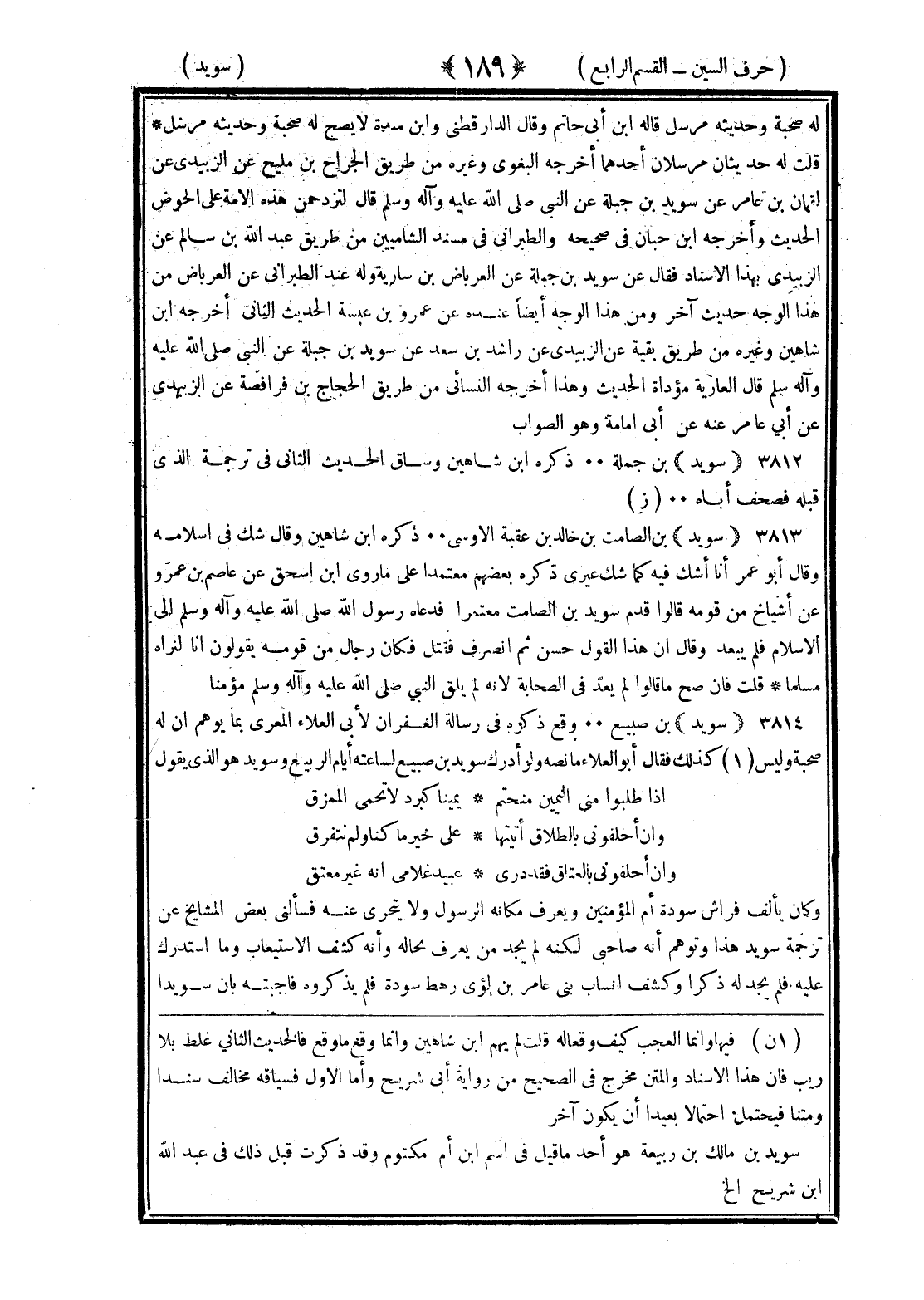 <189> له صحبة وحديثه مرسل قاله بن أبي حاتم وقال الدارقطني وابن منده لا يصح له صحبة وحديثه مرسل قلت له حديثان مرسلان أحدهما أخرجه البغوي وغيره من طريق الجراح بن مليح عن الزبيدي عن لقمان بن عامر عن سويد بن جبلة عن النبي صلى الله عليه وسلم قال لتزدحمن هذه الأمة على الحوض الحديث وأخرجه بن حبان في صحيحه والطبراني في مسند الشاميين من طريق عبد الله بن سالم عن الزبيدي بهذا الإسناد فقال عن سويد بن جبلة عن العرباض بن سارية وله عند الطبراني عن العرباض من هذا الوجه حديث آخر ومن هذا الوجه أيضا عنده عن عمرو بن عنبسة الحديث الثاني أخرجه بن شاهين وغيره من طريق بقية عن الزبيدي عن راشد بن سعد عن سويد بن جبلة عن النبي صلى الله عليه وسلم قال العارية مؤداة الحديث وهذا أخرجه النسائي من طريق الحجاج بن فرافصة عن الزبيدي عن أبي عامر عنه عن أبي إمامة وهو الصواب سويد بن جملة ذكره بن شاهين وساق الحديث الثاني في ترجمة الذي قبله فصحف أباه سويد بن الصامت بن خالد بن عقبة الأوسي ذكره بن شاهين وقال شك في إسلامه وقال أبو عمر أنا أشك فيه كما شك غيري ذكره بعضهم معتمدا على ما روى بن إسحاق عن عاصم بن عمرو عن أشياخ من قومه قالوا قدم سويد بن الصامت معتمرا فدعاه رسول الله صلى الله عليه وسلم إلى الإسلام فلم يبعد وقال إن هذا القول حسن ثم انصرف فقتل فكان رجال من قومه يقولون أنا لنراه مسلما قلت فإن صح ما قالوا لم يعد في الصحابة لأنه لم يلق النبي صلى الله عليه وسلم مؤمنا سويد بن صبيع وقع ذكره في رسالة الغفران لأبي العلاء المعري بما يوهم أن له صحبه وليس كذلك فقال أبو العلاء ما نصه ولو أدرك سويد بن صبيع لشاغبه أيام الربيع وسويد هو الذي يقول إذا طلبوا مني اليمن منحتهم يمينا كبرد الأتحمي الممزق وإن احلفوني بالطلاق أتيتها على خير ما كنا ولم نتفرق وإن احلفونى بالعتاق فقد درى عبيد غلامي أنه غير معتق وكان يألف فراش سودة أم المؤمنين ويعرف مكانه الرسول ولا يتحرى عنه فسألني بعض المشايخ عن ترجمة سويد هذا وتوهم أنه صحابي لكنه لم يجد من يعرف بحاله وأنه كشف الاستيعاب وما استدرك عليه فلم يجد له ذكرا وكشف أنساب بني عامر بن لؤي رهط سودة فلم يذكروه فأجبته بان سويدا §