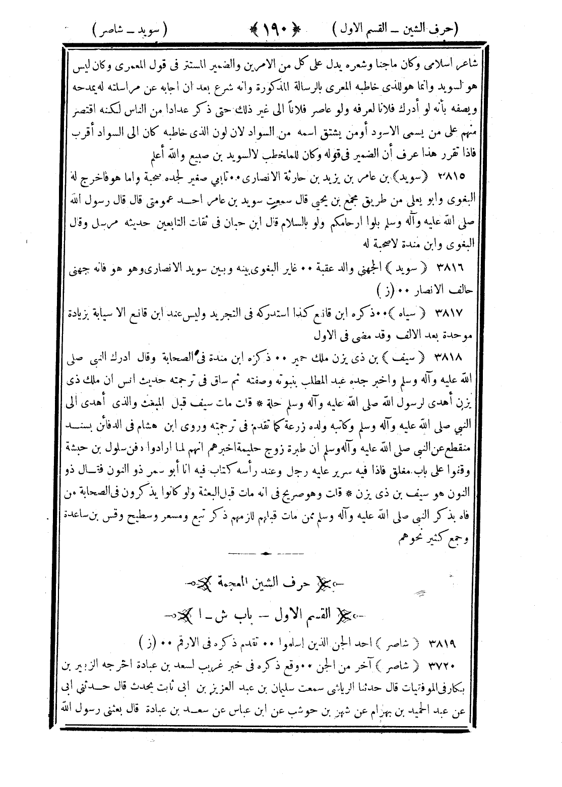والحمد الله أولا وآخرا ظاهرا وباطنا حسبنا الله ونعم الوكيل وصلى الله على سيدنا محمدا وآله وصحبه وسلم تسليما أبدا إلى يوم الدين ووافق الفراغ من تعليقه يوم الأحد جمادى الأول سنة أحسن الله العواقب بمنه وكرمه آمين والحمد لله رب العالمين ولا حول ولا قوة إلا بالله العظيم وأمامه في الهامش مدرت على هذا الجزء من أوله إلى آخره كتبه علي الحلبي الشافعي عفى عنه حرف الشين المعجمة القسم الأول الشين بعدها الألف شاصر أحد الجن الذين أسلموا تقدم ذكره في الأرقم شاصر آخر من الجن وقع ذكره في خبر غريب لسعد بن عبادة أخرجه الزبير بن بكار في الموفقيات قال حدثنا الرياشي سمعت سليمان بن عبد العزيز بن أبي ثابت يحدث قال حدثني أبي عن عبد الحميد بن بهرام عن شهر بن حوشب عن بن عباس عن سعد بن عبادة قال بعثني رسول الله §