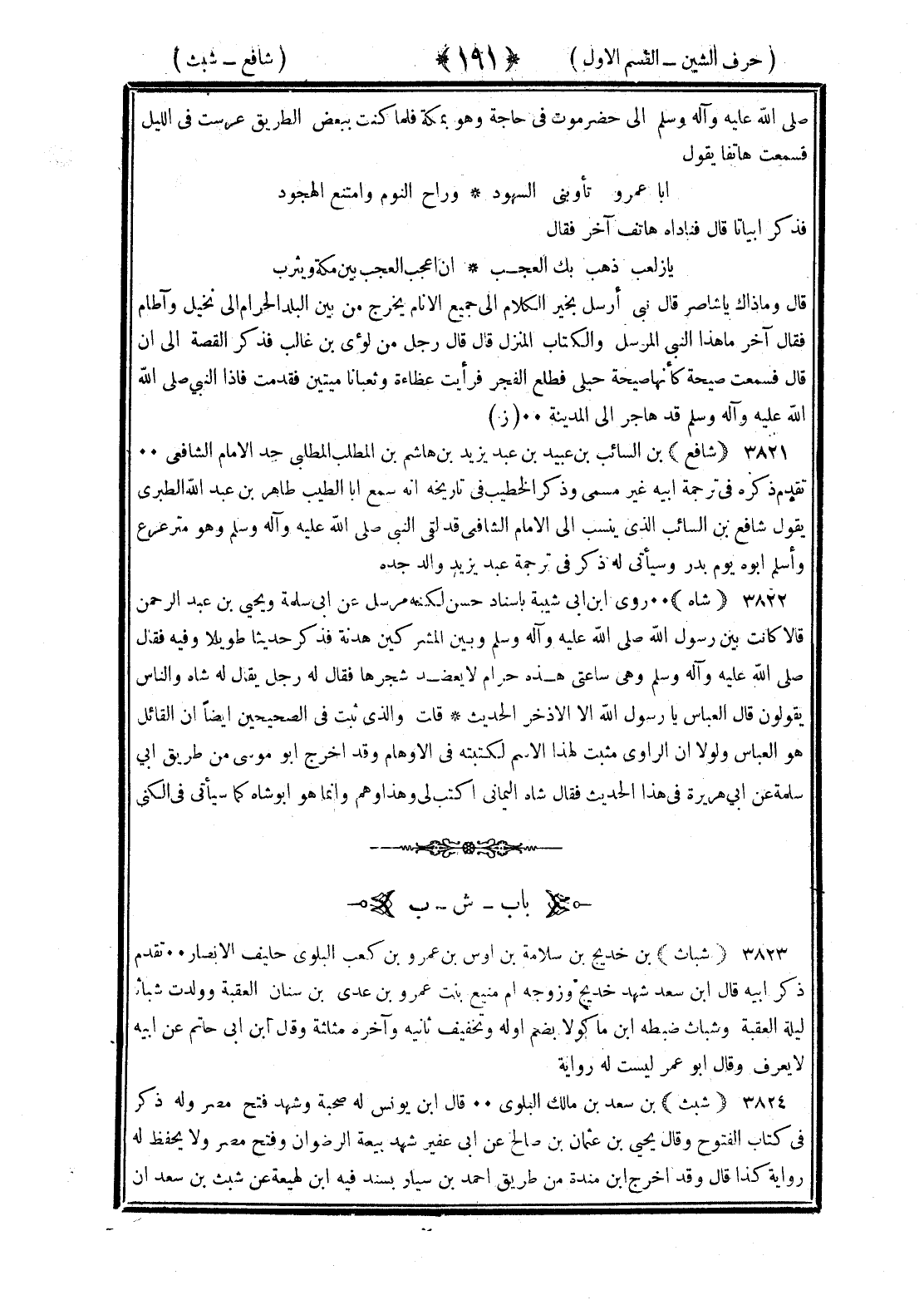 <191> صلى الله عليه وسلم إلى حضرموت في حاجة له وهو بمكة فلما كنت ببعض الطريق عرست في الليل فسمعت هاتفا يقول أبا عمرو تأوبني السهود وراح النوم وامتنع الهجود فذكر أبياتا قال فناداه هاتف آخر فقال يا زلعب ذهب بك العجب إن أعجب العجب بين مكة ويثرب قال وماذا يا شاصر قال نبي أرسل بخير الكلام إلى جميع الأنام يخرج من بين البلد الحرام إلى نخيل وآطام فقال آخر ما هذا النبي المرسل والكتاب المنزل قال رجل من لؤي بن غالب فذكر القصة إلى أن قال فسمعت صيحة كأنها صيحة حبلى فطلع الفجر فرأيت عظاية وثعبانا ميتين فقدمت فإذا النبي صلى الله عليه وسلم قد هاجر إلى المدينة شافع بن السائب بن عبيد بن عبد يزيد بن هاشم بن المطلب المطلبي جد الإمام الشافعي تقدم ذكره في ترجمة أبيه غير مسمى وذكر الخطيب في تاريخه أنه سمع أبا الطيب طاهر بن عبد الله الطبري يقول شافع بن السائب الذي ينسب إليه الإمام الشافعي قد لقي النبي صلى الله عليه وسلم وهو مترعرع وأسلم أبوه يوم بدر وسيأتي له ذكر في ترجمة عبد يزيد والد جده شاو روى بن أبي شيبة بإسناد حسن لكنه مرسل عن أبي سلمة ويحيى بن عبد الرحمن قالا كانت بين رسول الله صلى الله عليه وسلم وبين المشركين هدنة فذكر حديثا طويلا وفيه فقال صلى الله عليه وسلم وهي ساعتي هذه حرام لا يعضد شجرها فقال له رجل يقال له شاو والناس يقولون قال العباس يا رسول الله إلا الإذخر الحديث قلت والذي ثبت في الصحيحين أيضا أن القائل هو العباس ولولا أن الراوي مثبت لهذا الاسم لكتبته في الأوهام وقد أخرج أبو موسى من طريق أبي سلمة عن أبي هريرة في هذا لحديث فقال شاه اليماني اكتب لي وهذا وهم وإنما هو أبو شاه كما سيأتي في الكنى الشين بعدها الباء شباث بن خديج بن سلامة بن أوس بن عمرو بن كعب البلوي حليف الأنصار تقدم ذكر أبيه قال بن سعد شهد خديج وزوجه أم منيع بنت عمرو بن عدي بن سنان العقبة وولدت شباثا ليلة العقبة وشباث ضبطه بن ماكولا بضم أوله أوله وتخفيف ثانيه وآخره مثلثة وقال بن أبي حاتم عن أبيه لا يعرف وقال أبو عمر ليست له رواية شبث بن سعد بن مالك البلوي قال بن يونس له صحبة وشهد فتح مصر وله ذكر في كتاب الفتوح وقال يحيى بن عثمان بن صالح عن بن عفير شهد بيعة الرضوان وفتح مصر ولا يحفظ له رواية كذا قال وقد أخرج بن منده من طريق أحمد بن سيار بسند فيه بن لهيعة عن شبث بن سعد أن §