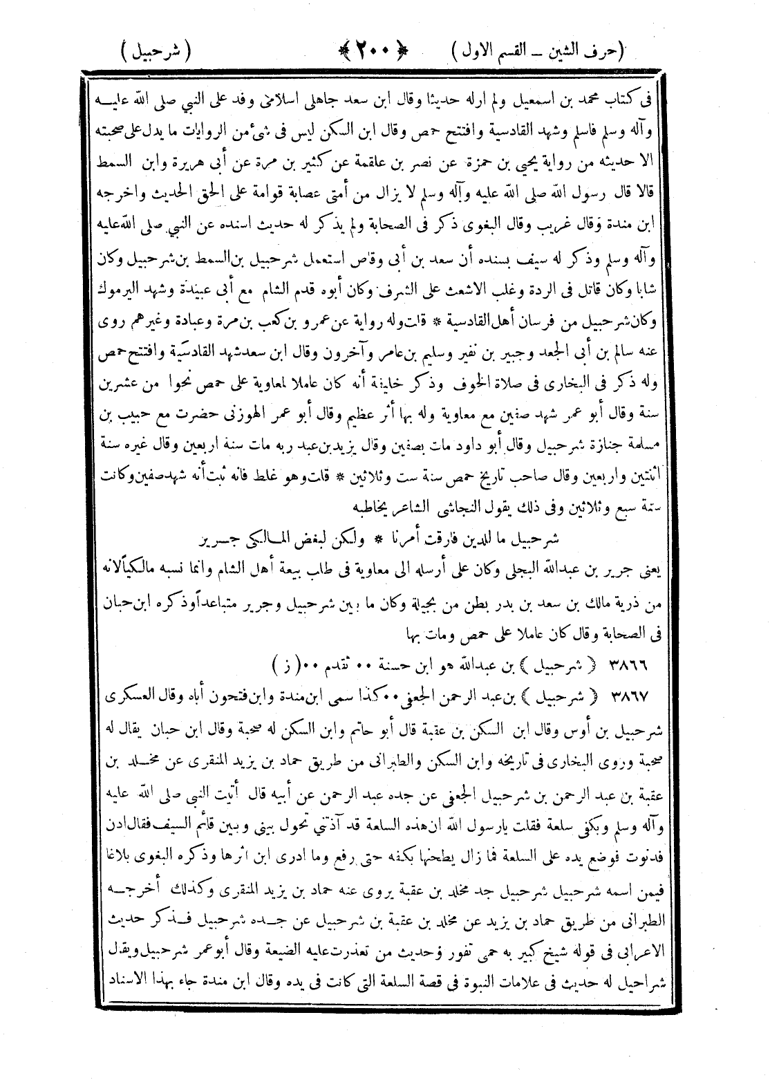 <200> في كتاب محمد بن إسماعيل ولم أر له حديثا وقال بن سعد جاهلي إسلامي وفد على النبي صلى الله عليه وسلم فأسلم وشهد القادسية وافتتح حمص وقال بن السكن ليس في شيء من الروايات ما يدل على صحبته إلا حديثه من رواية يحيى بن حمزة عن نصر بن علقمة عن كثير بن مرة عن أبي هريرة وابن السمط قالا قال رسول الله صلى الله عليه وسلم لا يزال من أمتي عصابة قوامة على الحق الحديث وأخرجه بن منده وقال غريب وقال البغوي ذكر في الصحابة ولم يذكر له حديث أسنده عن النبي صلى الله عليه وسلم وذكر له سيف بسنده أن سعد بن أبي وقاص استعمل شرحبيل بن السمط بن شرحبيل وكان شابا وكان قاتل في الردة وغلب الأشعث على الشرق وكان أبوه قدم الشام مع أبي عبيدة وشهد اليرموك وكان شرحبيل من فرسان أهل القادسية قلت وله رواية عن عمر وكعب بن مرة وعبادة وغيرهم روى عنه سالم بن أبي الجعد وجبير بن نفير وسليم بن عامر وآخرون وقال بن سعد شهد القادسية وافتتح حمص وله ذكر في البخاري في صلاة الخوف وذكر خليفة أنه كان عاملا على حمص نحوا من عشرين سنة وقال أبو عمر شهد صفين مع معاوية وله بها أثر عظيم وقال أبو عامر الهوزني حضرت مع حبيب بن مسلمة جنازة شرحبيل وقال أبو داود مات بصفين وقال يزيد بن عبد ربه مات سنة أربعين وقال غيره سنة اثنتين وأربعين وقال صاحب تاريخ حمص سنة ست وثلاثين قلت وهو غلط فإنه ثبت أنه شهد صفين وكانت سنة سبع وثلاثين وفي ذلك يقول النجاشي الشاعر يخاطب شرحبيل شرحبيل ما للدين فارقت أمرنا ولكن لبغض المالكي جرير يعني جرير بن عبد الله البجلي وكان علي أرسله إلى معاوية في طلب بيعة أهل الشام وإنما نسبه مالكيا لأنه من ذرية مالك بن سعد بن بدر بطن من بجيلة وكان ما بين شرحبيل وجرير متباعدا وذكره بن حبان في الصحابة وقال كان عاملا على حمص ومات بها شرحبيل بن عبد الله هو بن حسنة تقدم شرحبيل بن عبد الرحمن الجعفي كذا سمى بن منده وابن فتحون أباه وقال العسكري شرحبيل بن أوس وقال بن السكن له صحبة وقال بن حبان يقال له صحبة وروى البخاري في تاريخه وابن السكن والطبراني من طريق حماد بن يزيد المنقري عن مخلد بن عقبة بن عبد الرحمن بن شرحبيل الجعفي عن جده عبد الرحمن عن أبيه قال أتيت النبي صلى الله عليه وسلم وعلى آله وسلم وبكفي سلعة فقلت يا رسول الله إن هذه السلعة قد آذتني تحول بيني وبين قائم السيف فقال أدن فدنوت فوضع يده على السلعة فما زال يطحنها بكفه حتى رفع وما أدري أين أثرها وذكره البغوي بلاغا فيمن اسمه شرحبيل شرحبيل جد مخلد بن عقبة يروي عنه حماد بن يزيد المنقري وكذلك أخرجه الطبراني من طريق حماد بن زيد عن مخلد بن عقبة بن شرحبيل عن جده شرحبيل فذكره حديث الأعرابي في قوله شيخ كبير به حمي تفور وحديث من تعذرت عليه الضيعة وقال أبو عمر شرحبيل يقال شراحيل له حديث في علامات النبوة في قصة السلعة التي كانت في يده وقال بن منده جاء بهذا الإسناد §