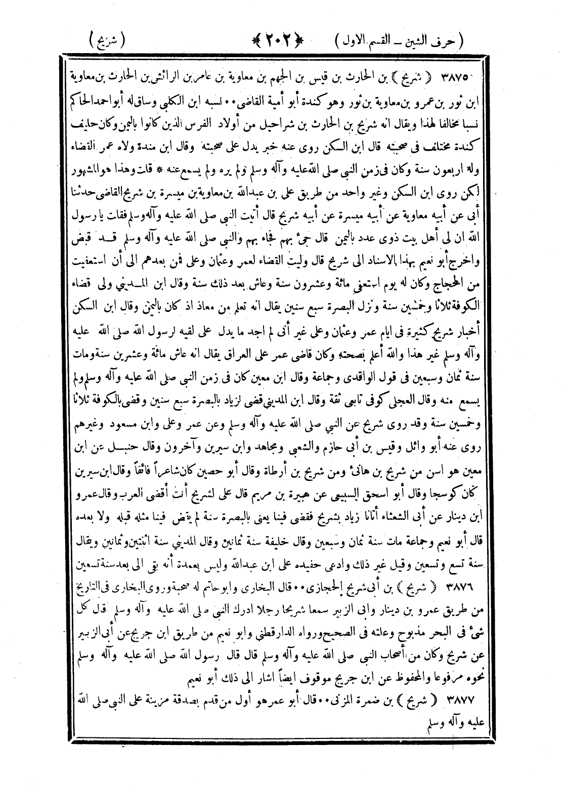 <202> شريح بن الحارث بن قيس بن الجهم بن معاوية بن عامر بن الرائش بن الحارث بن معاوية بن ثور بن عمرو بن معاوية بن ثور وهو كندة أبو أمية القاضي نسبه بن الكلبي وساق له أبو أحمد الحاكم نسبا مخالفا لهذا ويقال إنه شريح بن الحارث بن شراحيل من أولاد الفرس الذين كانوا باليمن وكان حليف كندة مختلف في صحبته قال بن السكن روى عنه خبر يدل على صحبته وقال بن منده ولاه عمر القضاء وله أربعون سنة وكان في زمن النبي صلى الله عليه وسلم ولم يره ولم يسمع عنه قلت وهذا هو المشهور ولكن روى بن السكن وغير واحد من طريق علي بن عبد الله بن معاوية بن ميسرة بن شريح القاضي حدثنا أبي عن أبيه معاوية عن أبيه ميسرة عن أبيه شريح قال أتيت النبي صلى الله عليه وسلم فقلت يا رسول الله إن لي أهل بيت ذوي عدد باليمن قال جيء بهم فجاء بهم والنبي صلى الله عليه وسلم قد قبض وأخرج أبو نعيم بهذا الإسناد إلى شريح قال وليت القضاء لعمر وعثمان وعلي فمن بعدهم إلى أن استعفيت من الحجاج وكان له يوم استعفى مائة وعشرون سنة وعاش بعد ذلك سنة وقال بن المديني ولي قضاء الكوفة ثلاثا وخمسين سنة ونزل البصرة سبع سنين يقال إنه تعلم من معاذ إذ كان باليمن وقال بن السكن أخبار شريح كثيرة في أيام عمر وعثمان وعلي غير أني لم أجد ما يدل على لقيه لرسول الله صلى الله عليه وسلم غير هذا والله أعلم بصحته وكان قاضي عمر على العراق يقال إنه عاش مائة وعشرين سنة ومات سنة ثمان وسبعين في قول الواقدي وجماعة وقال بن معين كان في زمن النبي صلى الله عليه وسلم ولم يسمع منه وقال العجلي كوفي تابعي ثقة وقال بن المديني قضى لزياد بالبصرة سبع سنين وقضى بالكوفة ثلاثا وخمسين سنة وقد روى شريح عن النبي صلى الله عليه وسلم وعن عمر وعلي وابن مسعود وغيرهم روى عنه أبو وائل وقيس بن أبي حازم والشعبي ومجاهد وابن سيرين وآخرون وقال حنبل عن بن معين هو أسن من شريح بن هانئ ومن شريح بن أرطاة وقال أبو حصين كان شاعرا فائقا وقال بن سيرين كان كوسجا وقال أبو إسحاق السبيعي عن هبيرة بن يريم قال علي لشريح أنت أقضى العرب وقال عمرو بن دينار عن أبي الشعثاء أتانا زياد بشريح فقضى فينا يعني البصرة سنة لم يقض فينا قبله مثله ولا بعده قال أبو نعيم وجماعة مات سنة ثمان وسبعين وقال خليفة سنة ثمانين وقال المديني سنة اثنتين وثمانين ويقال سنة تسع وتسعين وقيل غير ذلك وادعى حفيده علي بن عبد الله وليس بعمدة أنه بقي إلى بعد سنة تسعين شريح بن أبي شريح الحجازي قال البخاري وأبو حاتم له صحبة وروى البخاري في التاريخ من طريق عمرو بن دينار وأبو الزبير سمع شريحا رجلا أدرك النبي صلى الله عليه وسلم قال كل شيء في البحر مذبوح وعلقه في الصحيح ورواه الدارقطني وأبو نعيم من طريق بن جريج عن أبي الزبير عن شريح وكان من أصحاب النبي صلى الله عليه وسلم وقال قال رسول الله صلى الله عليه وسلم فذكر نحوه مرفوعا والمحفوظ عن أبي جريج موقوف أيضا أشار إلى ذلك أبو نعيم شريح بن ضمرة المزني قال أبو عمر هو أول من قدم بصدقة مزينة على النبي صلى الله عليه وسلم §