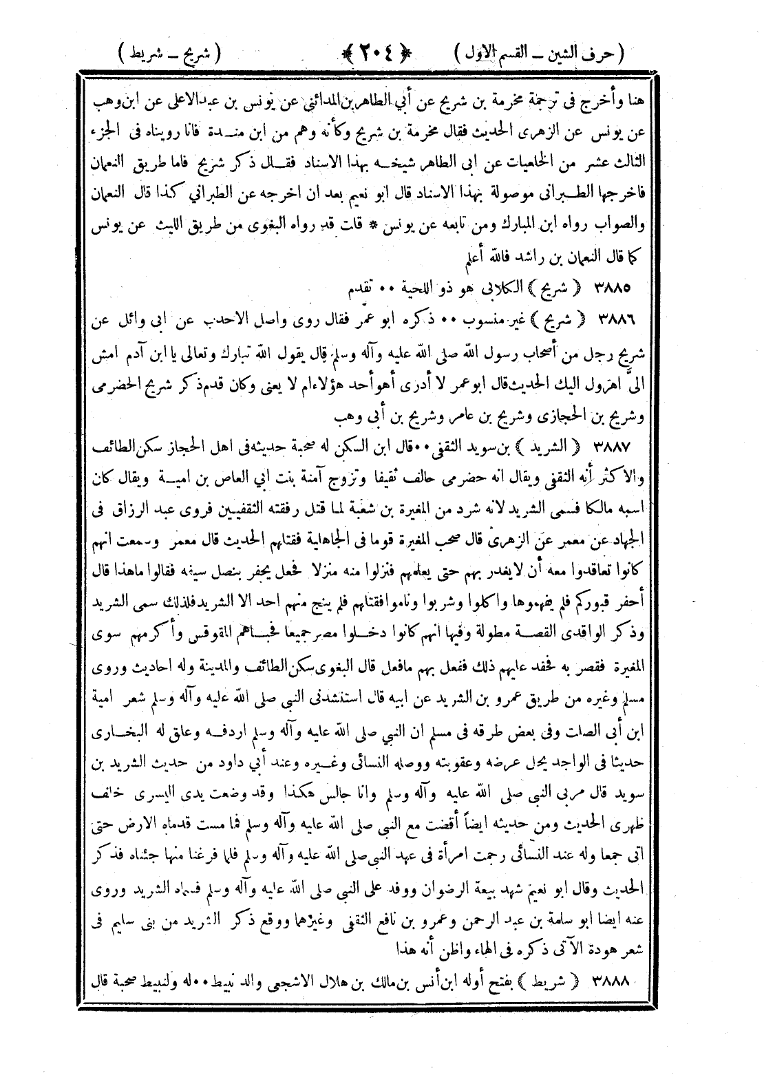 <204> هنا وأخرج في ترجمة مخرمة بن شريح عن أبي الطاهر بن المدائني عن يونس بن عبد الأعلى عن بن وهب عن يونس عن الزهري الحديث فقال مخرمة بن شريح وكأنه وهم من بن منده فإنا رويناه في الجزء الثالث عشر من الخلعيات عن أبي الطاهر شيخه بهذا الإسناد فقال ذكر شريح فأما طريق النعمان فأخرجها الطبراني موصولة بهذا الإسناد قال أبو نعيم بعد أن أخرجه عن الطبراني كذا قال النعمان والصواب ما رواه بن المبارك ومن تابعه عن يونس قلت قد رواه البغوي من طريق الليث عن يونس كما قال قال النعمان بن راشد فالله أعلم شريح الكلابي هو ذو اللحية تقدم شريح غير منسوب ذكره أبو عمر فقال روى واصل الأحدب عن أبي وائل عن شريح رجل من أصحاب رسول الله صلى الله عليه وسلم قال يقول الله تبارك وتعالى يا بن آدم امش إلى أهرول إليك الحديث قال أبو عمر لا أدري أهو أحد هؤلاء أم لا يعني وكان قدم ذكر شريح الحضرمي وشريج الحجازي وشريح بن عامر وشريح بن أبي وهب الشريد بن سويد الثقفي قال بن السكن له صحبة حديثه في أهل الحجاز سكن الطائف والأكثر أنه الثقفي ويقال إنه حضرمي حالف ثقيفا وتزوج آمنة بنت أبي العاص بن أمية ويقال كان اسمه مالكا فسمي الشريد لأنه شرد من المغيرة بن شعبة لما قتل رفقته الثقفيين فروى عبد الرزاق في الجهاد عن معمر عن الزهري قال صحب المغيرة قوما في الجاهلية فقتلهم الحديث قال معمر وسمعت أنهم كانوا تعاقدوا معه ألا يغدر بهم حتى يعلمهم فنزلوا منه منزلا فجعل يحفر بنصل سيفه فقالوا ما هذا قال أحفروا قبوركم فلم يفهموها وأكلوا وشربوا وناموا فقتلهم فلم ينج منهم أحد إلا الشريد فلذلك سمي الشريد وذكر الواقدي القصة مطولة وفيها أنهم كانوا دخلوا مصر جميعا فحباهم المقوقس وأكرمهم سوى المغيرة فقصر به فحنق عليهم ذلك ففعل بهم ما فعل قال البغوي سكن الطائف والمدينة وله أحاديث روى مسلم وغيره من طريق عمرو بن الشريد عن أبيه قال استنشدني النبي صلى الله عليه وسلم شعر أمية بن أبي الصلت وفي بعض طرقه في مسلم أن النبي صلى الله عليه وسلم أردفه وعلق له البخاري حديثا لي الواجد يحل عرضه وعقوبته ووصله النسائي وغيره وعند أبي داود من حديث الشريد بن سويد قال مر بي النبي صلى الله عليه وسلم وأنا جالس هكذا قد وضعت يدي اليسرى خلف ظهري الحديث ومن حديثه أيضا أفضت مع النبي صلى الله عليه وسلم فما مست قدماه الأرض حتى أتى جمعا وله عند النسائي رجمت امرأة في عهد النبي صلى الله عليه وسلم فلما فرغنا منها جئناه فذكر الحديث وقال أبو نعيم شهد بيعة الرضوان ووفد على النبي صلى الله عليه وسلم فسماه الشريد وروى عنه أيضا أبو سلمة بن عبد الرحمن وعمرو بن نافع الثقفي وغيرهما ووقع ذكر الشريد من بني سليم في شعر هوذة الآتي ذكره في الهاء وأظن أنه هذا شريط بفتح أوله بن أنس بن مالك بن هلال الأشجعي والد نبيط له ولنبيط صحبة قال §