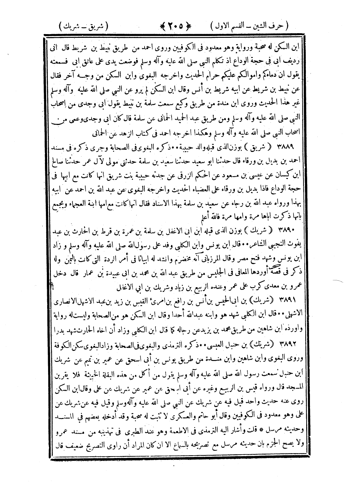 <205> بن السكن له صحبة ورواية وهو معدود في الكوفيين وروى أحمد من طريق نبيط بن شريط قال إني رديف أبي في حجة الوداع إذ تكلم النبي صلى الله عليه وسلم فوضعت يدي على عاتق أبي فسمعته يقول إن دماءكم وأموالكم عليكم حرام الحديث وأخرجه البغوي وابن السكن من وجه آخر فقال عن نبيط بن شريط عن أبيه شريط بن أنس وقال بن السكن لم يرو عن النبي صلى الله عليه وسلم غير هذا الحديث وروى بن منده من طريق وكيع سمعت سلمة بن نبيط يقول أبي وجدي من أصحاب النبي صلى الله عليه وسلم ومن طريق عبد الحميد الحماني عن سلمة قال كان أبي وجدي وعمي من أصحاب النبي صلى الله عليه وسلم وهكذا أخرجه أحمد في كتاب الزهد عن الحماني شريق بوزن الذي قبله والد حبيبة ذكره البغوي في الصحابة وجرى ذكره في مسند أحمد وفي مسند بديل بن ورقاء قال حدثنا أبو سعيد حدثنا سعيد بن سلمة حدثني مولى لآل عمر حدثنا صالح بن كيسان عن عيسى بن مسعود عن الحكم الزرقي عن جدته حبيبة بنت شريق أنها كانت مع أبيها يعني في حجة الوداع فإذا بديل بن ورقاء على العضباء الحديث وأخرجه البغوي عن عبد الله بن أحمد عن أبيه بهذا ورواه عبد الله بن رجاء عن سعيد بن سلمة بهذا الإسناد فقال إنها كانت مع أمها أمته العجماء ويجمع بأنها ذكرت أباها مرة وأمها مرة فالله أعلم شريك بوزن الذي قبله بن أبي الأغفل بن سلمة بن عمرة بن قرط بن الحارث بن عبد يغوث التجيبي الشاعر قال بن يونس وابن الكلبي وفد على رسول الله صلى الله عليه وسلم وزاد بن يونس وشهد فتح مصر وقال المرزباني إنه مخضرم وأنشد له أبياتا في أمر الردة التي كانت باليمن وله ذكر في قصة أوردها المعافى في الجليس من طريق عبد الله بن محمد بن أبي عبيدة بن عمار قال دخل عمرو بن معد يكرب على عمر وعنده الربيع بن زياد وشريك بن أبي الأغفل شريك بن أبي الحيسر أنس بن رافع بن امرئ القيس بن زيد بن عبد الأشهل الأنصاري الأشهلي قال بن الكلبي شهد هو وابنه عبد الله أحدا وقال بن السكن هو من الصحابة وليست له رواية وأورده بن شاهين من طريق محمد بن يزيد عن رجاله كما قال بن الكلبي وزاد أن أخاه الحارث شهد بدرا شريك بن حنبل العبسي ذكره الترمذي والبغوي في الصحابة وزاد البغوي سكن الكوفة وروى البغوي وابن شاهين وابن منده من طريق يونس بن أبي إسحاق عن عمير بن تميم عن شريك بن حنبل سمعت رسول الله صلى الله عليه وسلم يقول من أكل من هذه البقلة الخبيثة فلا يقربن المسجد قال ورواه قيس بن الربيع وغيره عن أبي إسحاق عن عمير عن شريك عن علي وقال بن السكن روى عنه حديث واحد قيل فيه عن شريك عن النبي صلى الله عليه وسلم وقيل فيه عن شريك عن علي وهو معدود في الكوفيين وقال أبو حاتم والعسكري لا تثبت له صحبة وقد أدخله بعضهم في المسند وحديثه مرسل قلت وأشار إليه الترمذي في الأطعمة وهو عند الطبري في تهذيبه من مسند عمرو ولا يصح الجزم بأن حديثه مرسل مع تصريحه بالسماع إلا إن كان المراد أن راوي التصريح ضعيف قال §