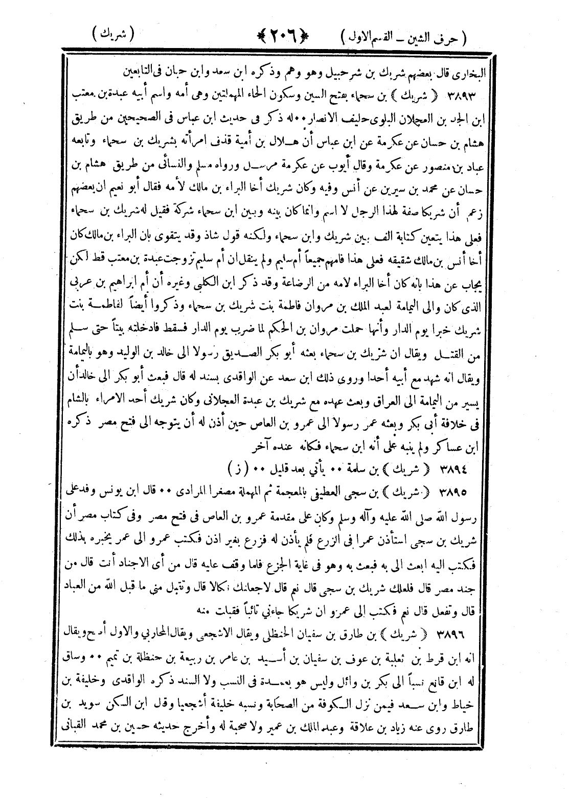 <206> البخاري قال بعضهم شريك بن شرحبيل وهو وهم وذكره بن سعد وابن حبان في التابعين شريك بن سحماء بفتح السين وسكون الحاء المهملتين وهي أمه واسم أبيه عبدة بن مغيث بن الجد بن العجلان البلوي حليف الأنصار له ذكر في حديث بن عباس في الصحيحين من طريق هشام بن حسان عن عكرمة عن بن عباس أن هلال بن أمية قذف امرأته بشريك بن سحماء وتابعه عباد بن منصور عن عكرمة وقال أيوب عن عكرمة مرسل ورواه مسلم والنسائي من طريق هشام بن حسان عن محمد بن سيرين عن أنس وفيه وكان شريك أخا البراء بن مالك لأمه ونقل أبو نعيم أن بعضهم زعم أن شريكا صفة لهذا الرجل لا اسم وإنما كان بينه وبين بن سحماء شركة فقيل له شريك بن سحماء فعلى هذا يتعين كتابه ألف بين شريك وابن سحماء ولكنه قول شاذ وقد يتقوى بأن البراء بن مالك كان أخا أنس بن مالك شقيقه فعلي هذا فأمهم جميعا أم سليم ولم ينقل أن أم سليم تزوجت عبدة بن مغيث قط لكن يجاب عن هذا بأنه كان أخا البراء لأمه من الرضاعة وقد ذكر بن الكلبي وغيره أن أم إبراهيم بن عربي الذي كان والي اليمامة لبعد الملك بن مروان فاطمة بنت شريك بن سحماء وذكروا أيضا لفاطمة بنت شريك خبرا يوم الدار وأنها حملت مروان بن الحكم لما ضرب يوم الدار فسقط فأدخلته بيتا حتى سلم من القتل ويقال إن شريك بن سحماء بعثه أبو بكر الصديق رسولا إلى خالد بن الوليد وهو باليمامة ويقال إنه شهد مع أبيه أحدا وروى ذلك بن سعد عن الواقدي بسند له قال فبعث أبو بكر إلى خالد أن يسير من اليمامة إلى العراق وبعث عهده مع شريك بن عبدة العجلاني وكان شريك أحد الأمراء بالشام في خلافة أبي بكر وبعثه عمر رسولا إلى عمرو بن العاص حين أذن له أن يتوجه إلى فتح مصر ذكره بن عساكر ولم ينبه على أنه بن سحماء فكأنه عنده آخر شريك بن سلمة يأتي بعد قليل شريك بن سمي الغطيفي بالمعجمة ثم المهملة مصغرا المرادي قال بن يونس وفد على رسول الله صلى الله عليه وسلم وكان على مقدمة عمرو بن العاص في فتح مصر وفي كتاب مصر أن شريك بن سمي استأذن عمرا في الزرع فلم يأذن له فزرع بغير إذن فكتب عمرو إلى عمر يخبره بذلك فكتب إليه ابعث إلي به فبعث به وهو في غاية الجزع فلما وقف عليه قال من أي الأجناد أنت قال من جند مصر قال فلعلك شريك بن سمي قال نعم قال لأجعلنك نكالا قال وتقبل مني ما قبل الله من العباد قال وتفعل قال نعم فكتب إلى عمرو إن شريكا جاءني تائبا فقبلت منه شريك بن طارق بن سفيان الحنظلي ويقال الأشجعي ويقال المحاربي والأول أصح ويقال إنه بن قرط بن ثعلبة بن عوف بن سفيان بن أسيد بن عامر بن ربيعة بن حنظلة بن تميم وساق له بن قانع نسبا إلى بكر بن وائل وليس هو بعمدة في النسب ولا السند ذكره الواقدي وخليفة بن خياط وابن سعد فيمن نزل الكوفة من الصحابة ونسبه خليفة أشجعيا وقال بن السكن سويد بن طارق روى عنه زياد بن علاقة وعبد الملك بن عمير ولا صحبة له وأخرج حديثه حسين بن محمد القباني §
