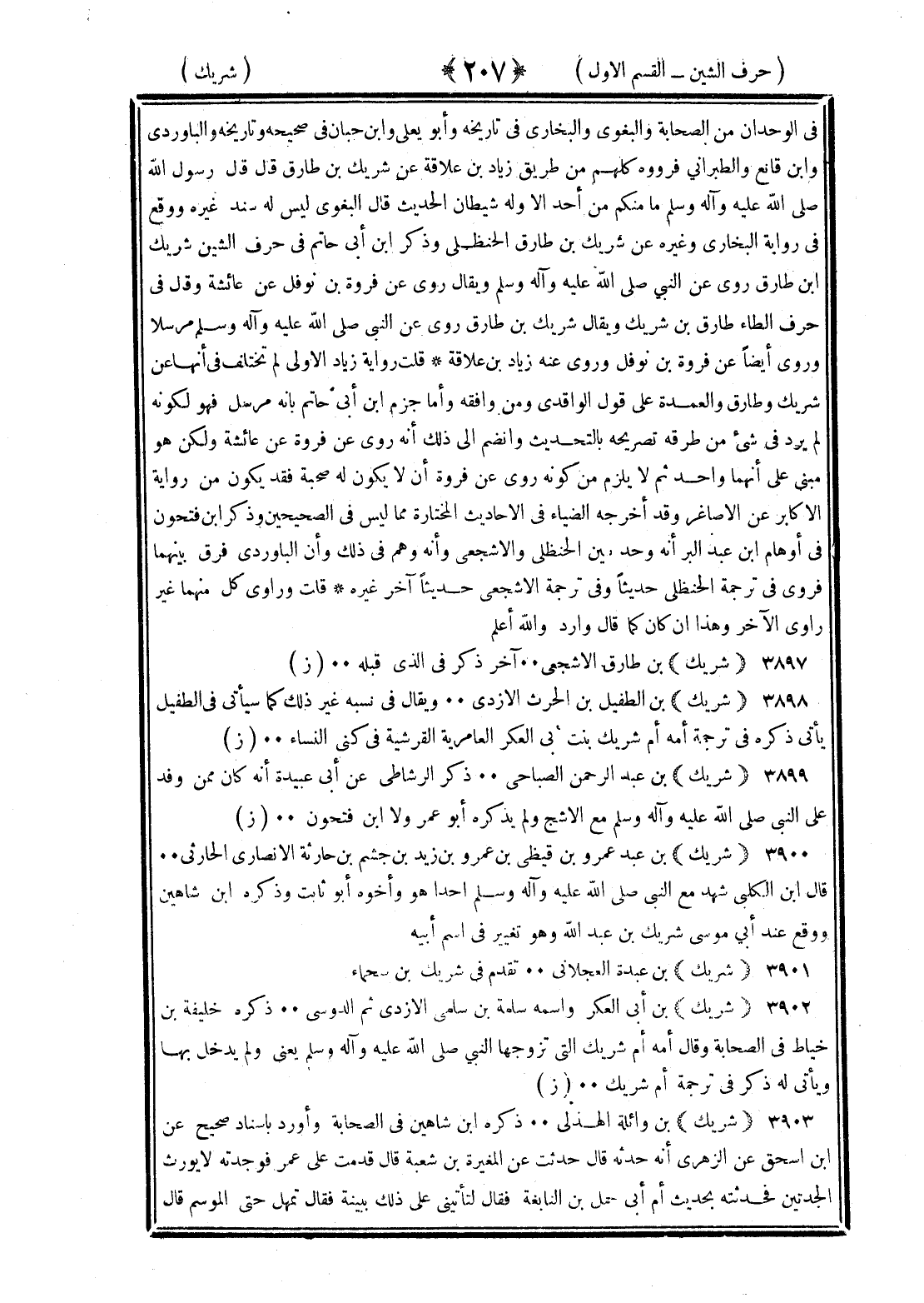 <207> في الوحدان من الصحابة والبغوي والبخاري في تاريخه وأبو يعلى وابن حبان في صحيحه وتاريخه والباوردي وابن قانع والطبراني فرووه كلهم من طريق زياد بن علاقة عن شريك بن طارق قال قال رسول الله صلى الله عليه وسلم ما منكم من أحد إلا وله شيطان الحديث قال البغوي ليس له مسند غيره ووقع في رواية البخاري وغيره عن شريك بن طارق الحنظلي وذكر بن أبي حاتم في حرف الشين شريك بن طارق روى عن النبي صلى الله عليه وسلم ويقال روى عن فروة بن نوفل عن عائشة وقال في حرف الطاء طارق بن شريك ويقال شريك بن طارق روى عن النبي صلى الله عليه وسلم مرسلا وروى أيضا عن فروة بن نوفل وروى عنه زياد بن علاقة قلت رواية زياد الأولى لم تختلف في أنها عن شريك وطارق والعمدة في كونه صحابيا على قول الواقدي ومن وافقه وأما جزم بن أبي حاتم بأنه مرسل فهو لكونه لم يرد في شيء من طرقه تصريحه بالتحديث وانضم إلى ذلك أنه روى عن فروة عن عائشة ولكن هو مبني على أنهما واحد ثم لا يلزم من كونه روى عن فروة ألا يكون له صحبة فقد يكون من رواية الأكابر عن الأصاغر وقد أخرجه الضياء في الأحاديث المختارة مما ليس في الصحيحين وذكر بن فتحون في أوهام بن عبد البر أنه وحد بين الحنظلي والأشجعي وأنه وهم في ذلك وأن الباوردي فرق بينهما فروى في ترجمة الحنظلي حديثا وفي الأشجعي حديث آخر غيره قلت وراوي كل منهما غير راوي الآخر وهذا إن كان كما قال وأرد والله أعلم شريك بن طارق الأشجعي آخر ذكر في الذي قبله شريك بن الطفيل بن الحارث الأزدي ويقال في نسبه غير ذلك كما سيأتي في الطفيل يأتي ذكره في ترجمة أمه أم شريك بنت أبي بكر العامرية القرشية في كنى النساء ز شريك بن عبد الرحمن الصباحي ذكر الرشاطي عن أبي عبيدة أنه كان ممن وفد على النبي صلى الله عليه وسلم مع الأشج ولم يذكره أبو عمرو ولا بن فتحون شريك بن عبد عمرو بن قيظي بن عمرو بن زيد بن جشم بن حارثة الأنصاري الحارثي الأنصاري قال بن الكلبي شهد مع النبي صلى الله عليه وسلم أحدا هو وأخوه أبو ثابت وذكره بن شاهين ووقع عند أبي موسى شريك بن عبد الله وهو تغيير في اسم أبيه شريك بن عبدة العجلاني تقدم في شريك بن سحماء شريك بن أبي العكر واسمه سلمة بن سلمى الأزدي ثم الدوسي ذكره خليفة بن خياط في السحابة وقال أمه أم شريك التي تزوجها النبي صلى الله عليه وسلم يعني ولم يدخل بها ويأتي له ذكر في ترجمة أمه أم شريك شريك بن وائلة الهذلي ذكره بن شاهين في الصحابة وأورد بإسناد صحيح عن بن إسحاق عن الزهري أنه حدثه قال حدثت عن المغيرة بن شعبة قال قدمت على عمر فوجدته لا يورث الجدتين فحدثته بحديث حمل بن النابغة فقال لتأتيني على ذلك ببينة فقال تمهل حتى الموسم قال §