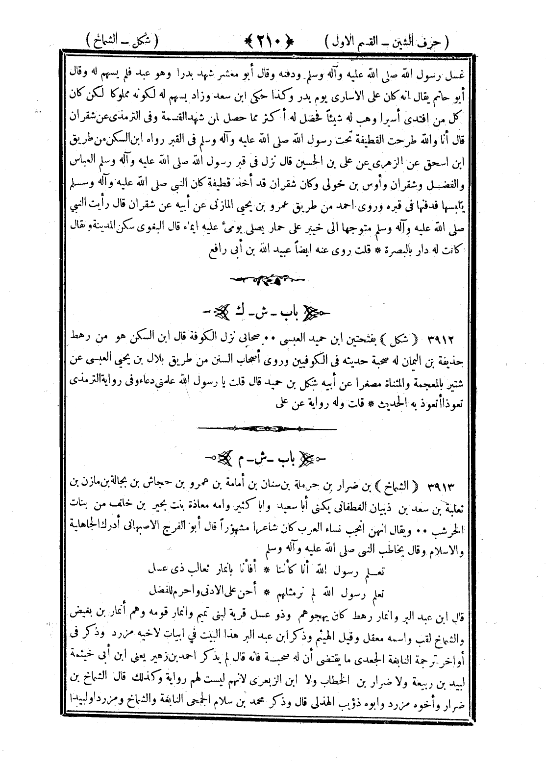 <210> غسل رسول الله صلى الله عليه وسلم ودفنه وقال أبو معشر شهد بدرا وهو عبد فلم يسهم له وقال أبو حاتم يقال إنه كان على الأسارى يوم بدر وكذا حكى بن سعد وزاد لم يسهم له لكونه مملوكا لكن كان كل من افتدى أسيرا وهب له شيئا فحصل له أكثر مما حصل لمن شهد القسمة وفي الترمذي عن شقران قال أنا والله طرحت القطيفة تحت رسول الله صلى الله عليه وسلم في القبر ورواه بن السكن من طريق بن إسحاق عن الزهري عن علي بن الحسين قال نزل في قبر رسول الله صلى الله عليه وسلم العباس والفضل وشقران وأوس بن خولى وكان شقران قد أخذ قطيفة كان النبي صلى الله عليه وسلم يلبسها فدفنها في قبره وروى أحمد من طريق عمرو بن يحيى المازني عن أبيه عن شقران قال رأيت النبي صلى الله عليه وسلم متوجها إلى خيبر على حمار يصلي يومئ عليه إيماء قال البغوي سكن المدينة ويقال كانت له دار بالبصرة قلت روى عنه أيضا عبيد الله بن أبي رافع الشين بعدها الكاف شكل بفتحتين بن حميد العبسي صحابي نزل الكوفة قال بن السكن هو من رهط حذيفة بن اليمان له صحبة حديثه في الكوفيين وروى أصحاب السنن من طريق بلال بن يحيى العبسي عن شتير بالمعجمة والمثناة مصغرا عن أبيه شكل بن حميد قال قلت يا رسول الله علمني دعاء وفي رواية الترمذي تعوذا أتعوذ به الحديث قلت وله رواية عن علي الشين بعدها الميم الشماخ بن ضرار بن حرملة بن سنان بن أمامة بن عمرو بن جحاش بن بجالة بن مازن بن ثعلبة بن سعد بن ذبيان الغطفاني يكنى أبا سعيد وأبا كثير وأمه معاذة بنت بجير بن خلف من بنات الخرشب ويقال إنهن أنجب نساء العرب كان شاعرا مشهورا قال أبو الفرج الأصبهاني أدرك الجاهلية والإسلام وقال يخاطب النبي صلى الله عليه وسلم تعلم رسول الله أنا كأننا أفأنا بأنمار ثعالب ذي غسل تعلم رسول الله لم تر مثلهم أجر على الأدنى وأحرم للفضل قال بن عبد البر وأنمار رهط كان يهجوهم وذو غسل قرية لبني تميم وأنمار قومه وهم أنمار بن بغيض والشماخ لقب واسمه معقل وقيل الهيثم وذكر بن عبد البر هذا البيت في أبيات لأخيه مزرد وذكر في أواخر ترجمة النابغة الجعدي ما يقتضي أن له صحبة فإنه قال لم يذكر أحمد بن زهير يعني بن أبي خيثمة لبيد بن ربيعة ولا ضرار بن الخطاب ولا بن الزبعري لأنهم ليست لهم رواية قال وكذلك الشماخ بن ضرار وأخوه مزرد وأبو ذؤيب الهذلي قال وذكر محمد بن سلام الجمحي النابغة والشماخ ومزردا ولبيدا §