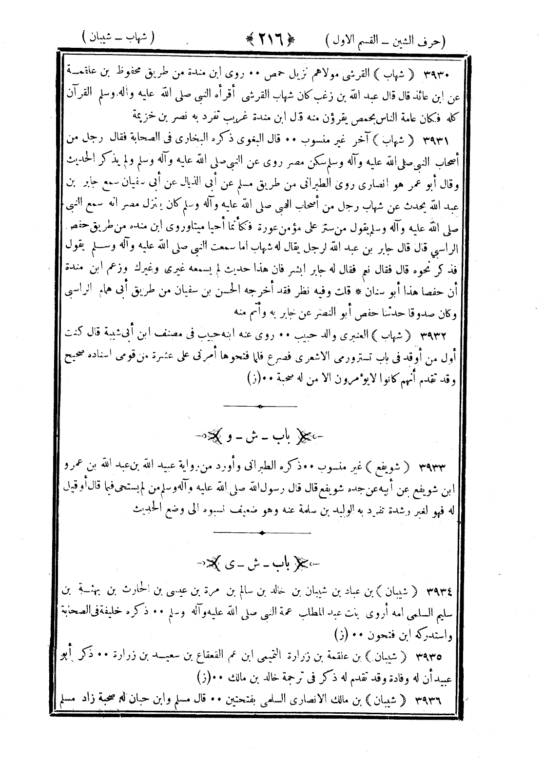 <216> شهاب القرشي مولاهم نزيل حمص روى بن منده من طريق محفوظ بن علقمة عن بن عائذ قال قال عبد الله بن زغب كان شهاب القرشي أقرأه النبي صلى الله عليه وسلم القرآن كله فكان عامة الناس بحمص يقرءون منه قال بن منده غريب تفرد به نصر بن خزيمة شهاب آخر غير منسوب قال البغوي ذكره البخاري في الصحابة فقال رجل من أصحاب النبي صلى الله عليه وسلم سكن مصر روى عن النبي صلى الله عليه وسلم ولم يذكر الحديث وقال أبو عمر هو أنصاري روى الطبراني من طريق مسلم عن أبي الذيال عن أبي سفيان سمع جابر بن عبد الله يحدث عن شهاب رجل من أصحاب النبي صلى الله عليه وسلم كان ينزل مصر أنه سمع النبي صلى الله عليه وسلم يقول من ستر على مؤمن عورة فكأنما أحيى ميتا وروى بن منده من طريق حفص الراسبي قال قال جابر بن عبد الله لرجل يقال له شهاب أما سمعت النبي صلى الله عليه وسلم يقول فذكر نحوه قال فقال نعم فقال له جابر أبشر فإن هذا حديث لم يسمعه غيري وغيرك وزعم بن منده أن حفصا هذا أبو سنان قلت وفيه نظر فقد أخرجه الحسن بن سفيان من طريق أبي همام الراسبي وكان صدوقا حدثنا حفص أبو النصر عن جابر به وأتم منه شهاب العنبري والد حبيب روى عنه ابنه حبيب في مصنف بن أبي شيبة قال كنت أول من أوقد في باب تستر ورمى الأشعري فصرع فلما فتحوها أمرني على عشرة من قومي إسناده صحيح وقد تقدم أنهم كانوا لا يؤمرون إلا من له صحبة الشين بعدها الواو شويفع غير منسوب ذكره الطبراني وأورد من رواية عبيد الله بن عبد الله بن عمرو بن شويفع عن أبيه عن جده شويفع قال قال النبي صلى الله عليه وسلم من لم يستحي فيما قال أو قيل له فهو لغير رشدة تفرد به الوليد بن سلمة عنه وهو ضعيف نسبوه إلى وضع الحديث الشين بعدها الياء شيبان بن عباد بن شيبان بن خالد بن سالم بن مرة بن عبس بن الحارث بن بهثة بن سليم السلمي أمه أروى بنت عبد المطلب عمة النبي صلى الله عليه وسلم ذكره خليفة في الصحابة واستدركه بن فتحون شيبان بن علقمة بن زرارة التميمي بن عم القعقاع بن سعيد بن زرارة ذكر أبو عبيد أن له وفادة وقد تقدم له ذكر في ترجمة خالد بن مالك شيبان بن مالك الأنصاري السلمي بفتحتين قال مسلم وابن حبان له صحبة زاد مسلم §