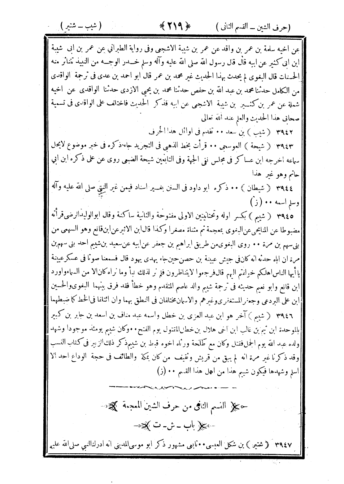 <219> عن أخيه شملة بن عمر بن واقد عن عمر بن شيبة الأشجعي وفي رواية الطبراني عن عمر بن شيبة بن أبي كثير عن أبيه قال قال رسول الله صلى الله عليه وسلم خدر الوجه من النبيذ تتناثر منه الحسنات قال البغوي لم يحدث بهذا الحديث غير محمد بن عمر قال أبو أحمد بن عدي في ترجمة الواقدي من الكامل حدثنا محمد بن عبد الله بن حفص حدثنا محمد بن يحيى الأزدي حدثنا الواقدي عن أخيه شملة عن عمر بن كثير بن شيبة الأشجعي عن أبيه فذكر الحديث فاختلف على الواقدي في تسمية صحابي هذا الحديث والعلم عند الله تعالى شبيب بن سعد تقدم في أوائل هذا الحرف شيحة العوسجي قرأت بخط الذهبي في التجريد جاء ذكره في خبر موضوع لا يحل سماعه أخرجه بن عساكر في مجلس نفي الجهة وفي التابعين شيحة الضبعي روى عن علي ذكره بن أبي حاتم وهو غير هذا شيطان ذكره أبو داود في السنن بغير إسناد فيمن غير النبي صلى الله عليه وسلم اسمه شييم بكسر أوله وتحتانيتين الأولى مفتوحة والثانية ساكنة وقال أبو الوليد الفرضي قرأته مضبوطا عن المنائحي عن البغوي بمعجمة ثم مثناة مصغرا وكذا قال بن الأثير عن بن قانع وهو السهمي من بني سهم بن مرة روى البغوي من طريق إبراهيم بن جعفر عن أبيه عن سعيد بن شييم أحد بني سهم بن مرة أن أباه حدثه أنه كان في جيش عيينة بن حصن حين جاء يمد يهود خيبر قال فسمعنا صوتا في عسكر عيينة يأيها الناس أهلكم خولفتم إليهم قال فرجعوا لا يتناظرون فلم نر لذلك نبأ وما نراه كان إلا من السماء وأورد بن قانع وأبو نعيم حديثه في ترجمة شييم والد عاصم المتقدم وهو خطأ فقد فرق بينهما البغوي والحسين بن علي البرذعي وجعفر المستغفري وغيرهم والاسمان مختلفان في النطق بهما وإن ائتلفا في الخط كما ضبطتهما شييم آخر هو بن عبد العزى بن خطل واسمه عبد مناف بن أسعد بن جابر بن كبير بالموحدة بن تيم بن غالب بن أخي هلال بن خطل المقتول يوم الفتح وكان شييم يومئذ موجودا وشهد ولده عبد الله يوم الجمل فقتل وكان مع طلحة ورثاه أخوه قطبة بن شييم ذكر ذلك الزبير في كتاب النسب وقد ذكرنا غير مرة أنه لم يبق من قريش وثقيف ممن كان بمكة والطائف في حجة الوداع أحد إلا أسلم وشهدها فيكون شييم هذا من أهل هذا القسم القسم الثاني من حرف الشين المعجمة الشين بعدها التاء شتير بن شكل العبسي تابعي مشهور ذكر أبو موسى المديني أنه أدرك النبي صلى الله عليه §