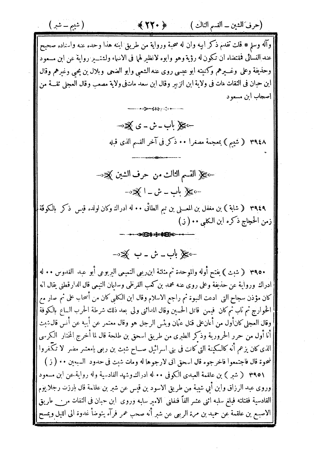 <220> وسلم قلت تقدم ذكر أبيه وأن له صحبة ورواية من طريق ابنه هذا وحده عنه وإسناده صحيح عند النسائي فمقتضاه أن تكون له رؤية وهو وأبوه لا نظير لهما في الأسماء ولشتير رواية عن بن مسعود وحذيفة وعلي وغيرهم وكنيته أبو عيسى روى عنه الشعبي وأبو الضحى وبلال بن يحيى وغيرهم وقال بن حبان في الثقات مات في ولاية بن الزبير وقال بن سعد مات في ولاية مصعب وقال العجلي ثقة من أصحاب بن مسعود الشين بعدها الياء شييم بمعجمة مصغرا ذكر في آخر القسم الذي قبله القسم الثالث من حرف الشين الشين بعدها الألف شابة بن مغفل بن المعلى بن تيم الطائي له إدراك وكان لولده قيس ذكر بالكوفة زمن الحجاج ذكره الكلبي الشين بعدها الباء شبث بفتح أوله والموحدة ثم مثلثة بن ربعي التميمي اليربوعي أبو عبد القدوس له إدراك ورواية عن حذيفة وعلي روى عنه محمد بن كعب القرظي وسليمان التيمي قال الدارقطني يقال إنه كان مؤذن سجاح التي ادعت النبوة ثم راجع الإسلام وقال بن الكلبي كان من أصحاب علي ثم صار مع الخوارج ثم تاب ثم كان فيمن قاتل الحسين وقال المدائني ولي بعد ذلك شرطة القباع بالكوفة وقال العجلي كان أول من أعان على قتل عثمان وبئس الرجل هو وقال معتمر عن أبيه عن أنس قال شبث أنا أول من حرر الحرورية وذكر الطبري من طريق إسحاق بن طلحة قال لما أخرج المختار الكرسي الذي كان يزعم أنه كالسكينة التي كانت في بني إسرائيل صاح شبث بن ربعي يا معشر مضر لا تكفروا ضحوة قال فاجتمعوا فأخرجوه قال إسحاق إني لأرجوها له ومات شبث في حدود السبعين شبر بن علقمة العبدي الكوفي له إدراك وشهد القادسية وله رواية عن بن مسعود وروى عبد الرزاق وابن أبي شيبة من طريق الأسود بن قيس عن شبر بن علقمة قال بارزت رجلا يوم القادسية فقتلته فبلغ سلبه اثنى عشر ألفا فنفلني الأمير سلبه وروى بن حبان في الثقات من طريق الأصبغ بن علقمة عن حميد بن مرة الربعي عن شبر أنه صحب عمر فرآه يتوضأ غدوة إلى الليل ويمسح §