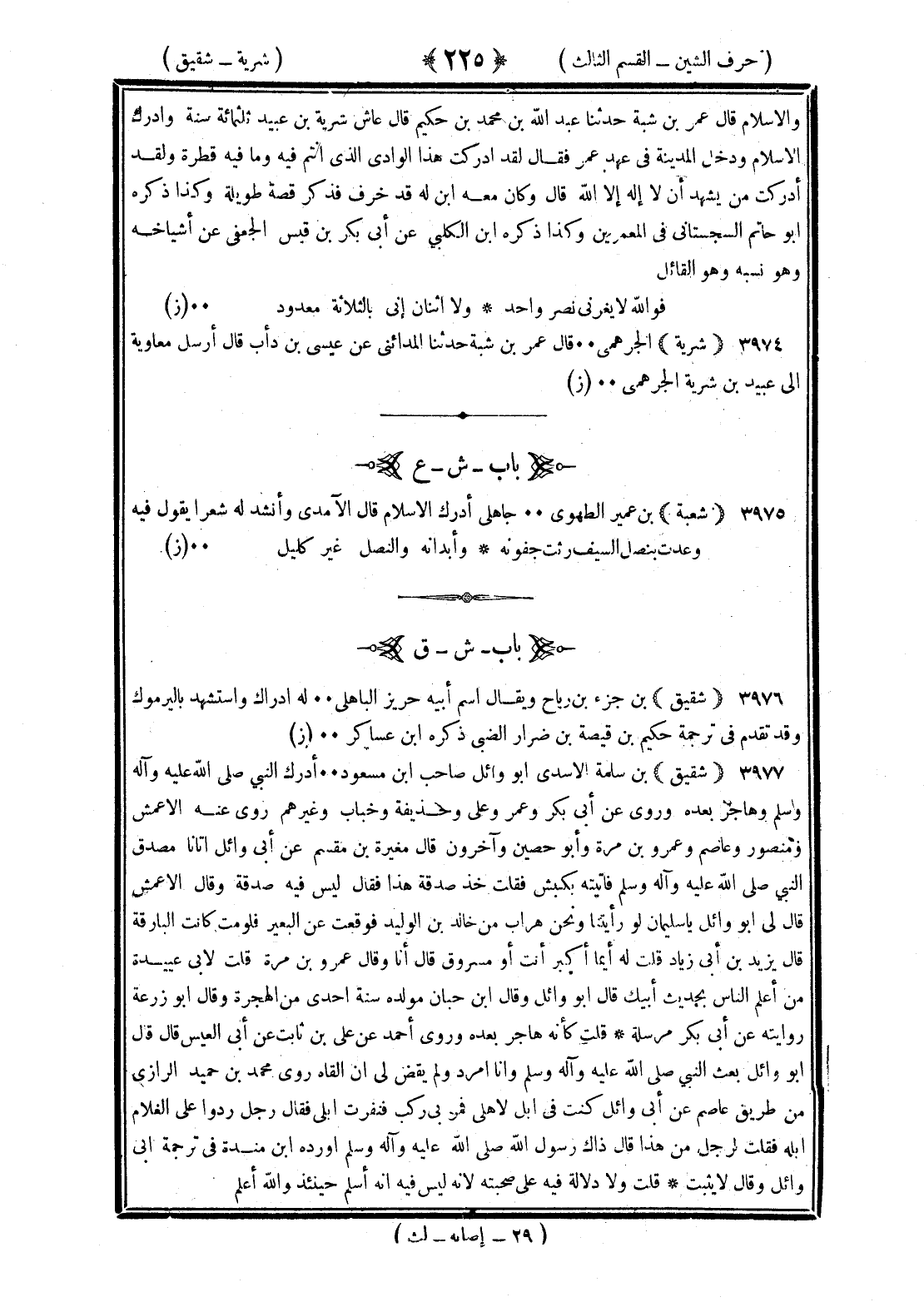 <225> والإسلام قال عمر بن شبة حدثنا عبد الله بن محمد بن حكيم قال عاش شرية بن عبيد ثلاثمائة سنة وأدرك الإسلام ودخل المدينة في عهد عمر فقال لقد أدركت هذا الوادي الذي أنتم فيه وما فيه قطرة ولقد أدركت من يشهد أن لا إله إلا الله قال وكان معه بن له قد خرف فذكر قصة طويلة وكذا ذكره أبو حاتم السجستاني في المعمرين وكذا ذكره بن الكلبي عن أبي بكر بن قيس الجعفي عن أشياخه وهو نسبه وهو القائل فوالله لا يغرني نصر واحد ولا اثنان إني بالثلاثة معذور شرية الجرهمي قال عمر بن شبة حدثنا المدائني عن عيسى بن دأب قال أرسل معاوية إلى عبيد بن شرية الجرهمي الشين بعدها العين والفاء شعبة بن قمير الطهوي جاهلي أدرك الإسلام قاله الآمدي وأنشد له شعرا يقول فيه وعدت بنصل السيف رثت جفونه وأبدانه والنصل غير كليل شقيق بن جزء بن رياح ويقال اسم أبيه جرير الباهلي له إدراك واستشهد باليرموك وقد تقدم في ترجمة حكيم بن قبيصة بن ضرار الضبي ذكره بن عساكر شقيق بن سلمة الأسدي أبو وائل صاحب بن مسعود أدرك النبي صلى الله عليه وسلم وهاجر بعده وروى عن أبي بكر وعمر وعلي وحذيفة وخباب وغيرهم روى عنه الأعمش ومنصور وعاصم وعمرو بن مرة وأبو حصين وآخرون قال مغيرة بن مقسم عن أبي وائل أتانا مصدق النبي صلى الله عليه وسلم فأتيته بكبش فقلت خذ صدقة هذا فقال ليس فيه صدقة وقال الأعمش قال لي أبو وائل يا سليمان لو رأيتنا ونحن هراب من خالد بن الوليد فوقعت عن البعير فلو مت كانت البارقة قال يزيد بن أبي زياد قلت له أيما أكبر أنت أو مسروق قال أنا وقال عمرو بن مرة قلت لأبي عبيدة من أعلم الناس بحديث أبيك قال أبو وائل وقال بن حبان مولده سنة إحدى من الهجرة وقال أبو زرعة روايته عن أبي بكر مرسلة قلت كأنه هاجر بعده وروى أحمد عن علي بن ثابت عن أبي العنبس قال قال أبو وائل بعث النبي صلى الله عليه وسلم وأنا أمرد ولم يقض لي أن ألقاه روى محمد بن حميد الرازي من طريق عاصم عن أبي وائل كنت في إبل لأهلي فمر بي ركب فنفرت إبلي فقال رجل ردوا على الغلام إبله فقلت لرجل من هذا قال ذاك رسول الله صلى الله عليه وسلم أورده بن منده في ترجمة أبي وائل وقال لا يثبت قلت ولا دلالة فيه على صحبته لأنه ليس فيه أنه أسلم حينئذ والله أعلم الشين بعدها الميم §