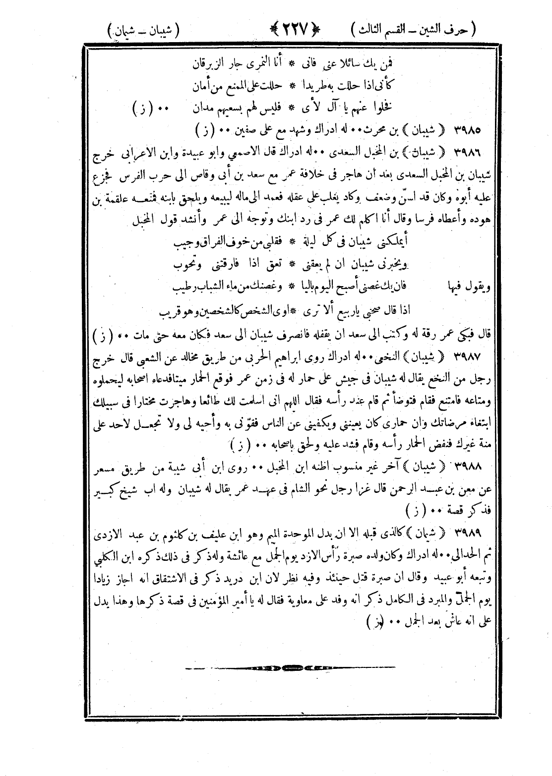 <227> فمن يك سائلا عني فإني أنا النمري جار الزبرقان كأني إذ حللت به طريدا حللت على الممنع من أبان فحلوا عنهم يا آل لأي فليس لكم بسعيهم يدان شيبان بن محرث له إدراك وشهد مع علي صفين شيبان بن المخبل السعدي له إدراك قال الأصمعي وأبو عبيدة وابن الأعرابي خرج شيبان بن المخبل السعدي بعد أن هاجر في خلافة عمر مع سعد بن أبي وقاص إلى حرب الفرس فجزع عليه أبوه وكان قد أسن وضعف وكاد يغلب على عقله فعمد إلى ما له ليبيعه ويلحق بابنه فمنعه علقمة بن هوذة وأعطاه فرسا وقال له أنا أكلم لك عمر في رد ابنك وتوجه إلى عمر وأنشده قول المخبل أيملكني شيبان في كل ليلة بقلبي من خوف الفراق وجيب ويخبرني شيبان أن لن يعقني يعق إذا فارقتني ويحوب يقول فيها فإن يك غصني أصبح اليوم باليا وغصنك من ماء الشباب رطيب إذا قال صحبي يا ربيع ألا ترى أرى الشخص كالشخصين وهو قريب قال فبكى عمر رقة له وكتب إلى سعد أن يقفله فانصرف شيبان إلى أبيه فكان معه حتى مات شيبان النخعي له إدراك روى إبراهيم الحربي من طريق مجالد عن الشعبي قال خرج رجل من النخع يقال له شيبان في جيش على حمار له في زمن عمر فوقع الحمار ميتا فدعاه أصحابه ليحملوه ومتاعه فامتنع فقام فتوضأ ثم قام عند رأسه فقال اللهم إني أسلمت لك طائعا وهاجرت مختارا في سبيلك ابتغاء مرضاتك وإن حماري كان يعينني ويكفيني عن الناس فقوني به وأحيه لي ولا تجعل لأحد علي منة غيرك فنفض الحمار رأسه وقام فشد عليه ولحق بأصحابه شيبان آخر غير منسوب أظنه بن المخبل روى بن أبي شيبة من طريق مسعر عن معن بن عبد الرحمن قال غزا رجل نحو الشام في عهد عمر يقال له شيبان وله أبى شيخ كبير فذكر قصة شيمان كالذي قبله إلا أن بدل الموحدة الميم وهو بن عكيف بن كيوم بن عبد الأزدي ثم الحداني له إدراك وكان ولده صبرة رأس الأزد يوم الجمل مع عائشة وله ذكر في ذلك ذكره بن الكلبي وتبعه أبو عبيد وقال إن صبرة قتل حينئذ وفيه نظر لأن بن دريد ذكر في الإشتقاق أنه أجار زيادا يوم الجمل والمبرد في الكامل ذكر أنه وفد على معاوية فقال له يا أمير المؤمنين في قصة ذكرها وهذا يدل على أنه عاش بعد الجمل §