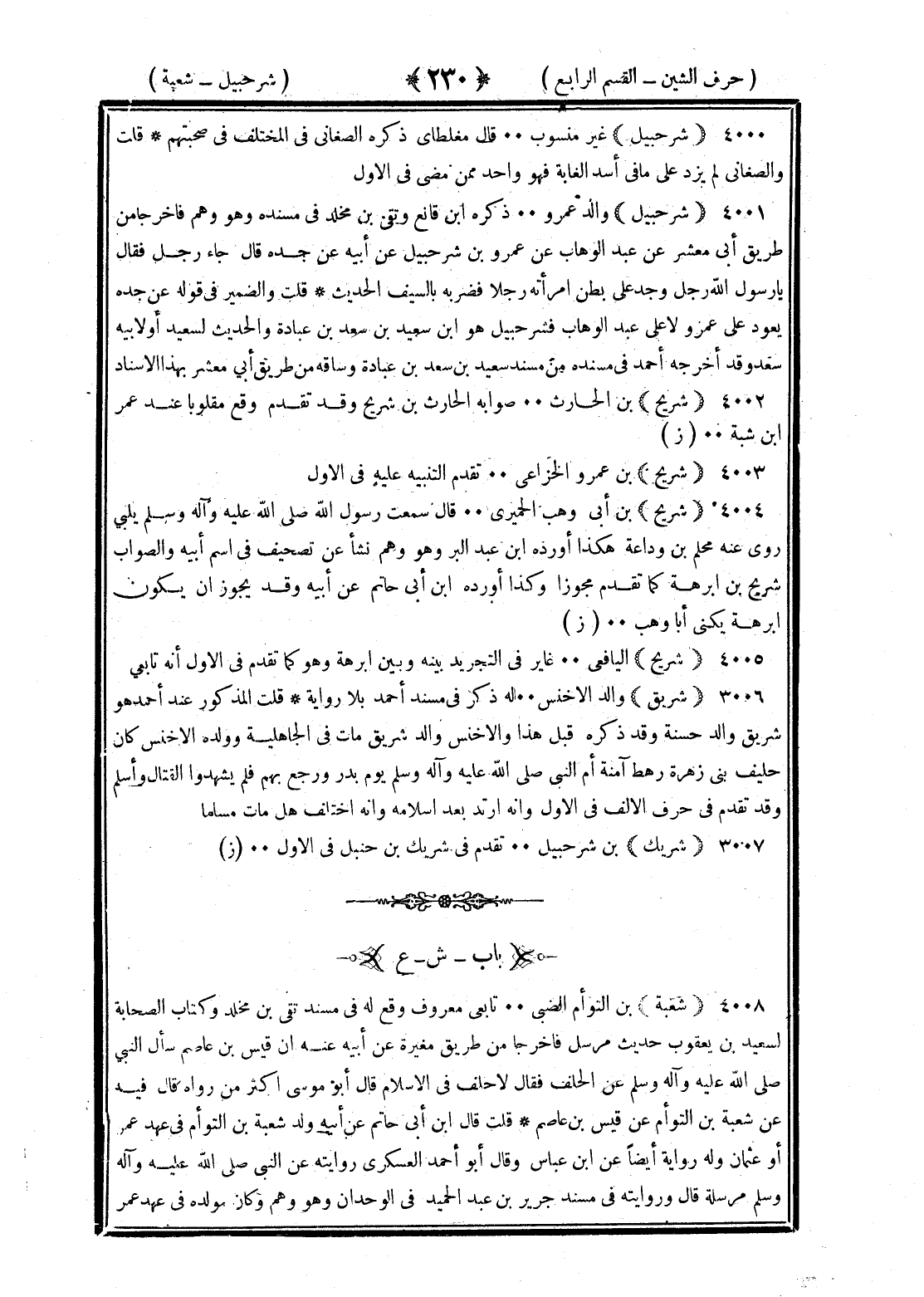 <230> شرحبيل غير منسوب قال مغلطاي ذكره الصغاني في المختلف في صحبتهم قلت والصغاني لم يزد على ما في أسد الغابة فهو واحد ممن مضى في الأول شرحبيل والد عمرو ذكره بن قانع وبقي بن مخلد في مسنده وهو وهم فأخرجا من طريق أبي معشر عن عبد الوهاب عن عمرو بن شرحبيل عن أبيه عن جده قال جاء رجل فقال يا رسول الله رجل وجد على بطن امرأته رجلا فضربه بالسيف الحديث قلت والضمير في قوله عن جده يعود على عمرو لا على عبد الوهاب فشرحبيل هو بن سعيد بن سعد بن عبادة والحديث لسعيد أو لأبيه سعد وقد أخرجه أحمد في مسنده من مسند سعيد بن سعد بن عبادة وساقه من طريق أبي معشر بهذا الإسناد شريح بن الحارث صوابه الحارث بن شريح وقد تقدم وقع مقلوبا عند عمر بن شبة شريح بن عمرو الخزاعي تقدم التنبيه عليه في الأول شريح بن أبي وهب الحميري قال سمعت رسول الله صلى الله عليه وسلم يلبي روى عنه محلم بن وداعة هكذا أورده بن عبد البر وهو وهم نشأ عن تصحيف في اسم أبيه والصواب شريح بن أبرهة كما تقدم مجودا وكذا أورده بن أبي حاتم عن أبيه ويجوز أن يكون أبرهة يكنى أبا وهب شريح اليافعي غاير في التجريد بينه وبين بن أبرهة وهو هو كما تقدم في الأول أنه تابعي شريق والد الأخنس له ذكر في مسند أحمد بلا رواية قلت المذكور عند أحمد هو شريق والد حسنة وقد ذكره قبل هذا والأخنس والد شريق مات في الجاهلية وولده الأخنس كان حليف بني زهرة رهط آمنة أم النبي صلى الله عليه وسلم يوم بدر ورجع بهم فلم يشهدوا القتال وأسلم وقد تقدم في حرف الألف في الأول وأنه ارتد بعد إسلامه وأنه اختلف هل مات مسلما شريك بن شرحبيل تقدم في شريك بن حنبل في الأول الشين بعدها العين شعبة بن التوأم الضبي تابعي معروف وقع له في مسند بقي بن مخلد وكتاب الصحابة لسعيد بن يعقوب حديث مرسل فأخرجا من طريق مغيرة عن ابنه عنه أن قيس بن عاصم سأل النبي صلى الله عليه وسلم عن الحلف فقال لا حلف في الإسلام قال أبو موسى أكثر من رواه قال فيه عن شعبة عن التوأم عن قيس بن عاصم قلت قال بن أبي حاتم عن أبيه ولد شعبة بن التوأم في عهد عمر أو عثمان وله رواية أيضا عن بن عباس وقال أبو أحمد العسكري روايته عن النبي صلى الله عليه وسلم مرسلة قال وروايته في مسند جرير بن عبد الحميد في الوحدان وهو وهم وكان مولده في عهد عمر §