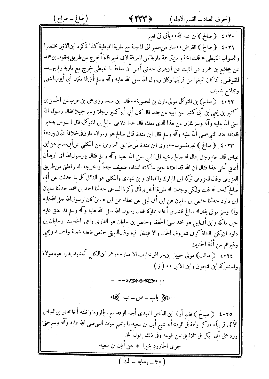 <233> صالح بن عبد الله النحام يأتي في نعيم صالح القرظي سار من مصر إلى المدينة مع مارية القبطية كذا ذكره بن الأثير مختصرا والصواب القبطي قلت أخذه من ترجمة مارية من المعرفة لأبي نعيم فإنه أخرج من طريق يعقوب بن محمد عن مجاشع بن عمرو عن الليث عن الزهري حدثني أنس أن صالحا القبطي خرج مع مارية ولم يهده المقوقس وإنما كان اتبعها من قريتها وكان رسول الله صلى الله عليه وسلم أنزلها منزل أبي أيوب ومجاشع ضعيف صالح بن المتوكل مولى مازن بن الغضوبة قال بن منده روى علي بن حرب عن الحسن بن كثير بن يحيى بن أبي كثير عن أبيه عن جده قال كان أبي أبو كثير رجلا وسيما جميلا فقال رسول الله صلى الله عليه وسلم لمازن من هذا الذي معك قال هذا غلامي صالح بن المتوكل قال استوص به خيرا فأعتقه عند النبي صلى الله عليه وسلم قال بن منده قتل صالح هو ومولاه مازن في خلافة عثمان ببرذعة صالح غير منسوب روى بن منده من طريق العرزمي عن الكلبي عن أبي صالح عن بن عباس قال جاء رجل يقال له صالح بأخيه إلى النبي صلى الله عليه وسلم فقال يا رسول الله أريد أن أعتق أخي هذا فقال إن الله قد أعتقه حين ملكته إسناده ضعيف جدا وأخرجه الدارقطني من طريق العرزمي وقال العرزمي تركه بن المبارك والقطان وابن مهدي والكلبي هو القائل كل ما حدثت عن أبي صالح كذب قلت ولكن وجدت له طريقا أخرى قال زكريا الساجي حدثنا أحمد بن محمد حدثنا سليمان بن داود حدثنا حفص بن سليمان عن بن أبي ليلى عن عطاء عن بن عباس كان لرسول الله صلى الله عليه وسلم مولى يقال له صالح فاشترى أخا له مملوكا فقال رسول الله صلى الله عليه وسلم قد عتق عليه حين ملكه وابن أبي ليلى هو محمد سيء الحفظ وحفص بن سليمان هو القاري واهي الحديث وسليمان بن داود إن يكن الشاذكوني فمعروف الحال وإلا فلينظر فيه وقال البيهقي حفص ضعفه شعبة وأحمد ويحيى وغيرهم من أئمة الحديث صامت مولى حبيب بن خراش حليف الأنصار زعم بن الكلبي أنه شهد بدرا هو ومولاه واستدركه بن فتحون وابن الأثير الصاد بعدها الباء صباح بضم أوله بن العباس العبدي أحد الوفد مع الجارود وأظنه أخا صحار بن العباس الآتي قريبا ذكر وثيمة في الردة أنه شيع أبان بن سعيد لما بلغهم موت النبي صلى الله عليه وسلم حتى ورد على أبي بكر في ثلاثين من قومه وفي ذلك يقول أبان جزى الجارود خيرا عن أبان بن سعيد §