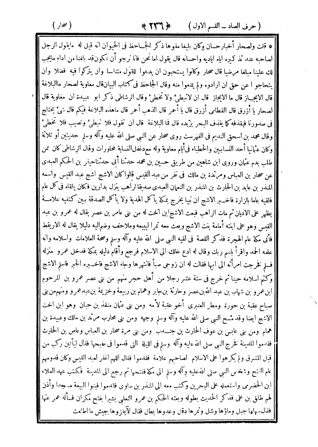 <236> قلت ولصحار أخبار حسان وكان بليغا مفوها ذكر الجاحظ في الحيوان أنه قيل له ما يقول الرجل لصاحبه عند تذكيره إياه أياديه وإحسانه قال يقول أما نحن فإنا نرجو أن نكون قد بلغنا من أداء ما يجب لك علينا مبلغا مرضيا قال صحار وكانوا يستحبون أن يدعوا للقول متنفسا وأن يتركوا فيه فضلا وأن يتجافوا عن حق إن أرادوه ولم يمنعوا منه وقال الجاحظ في كتاب البيان قال معاوية لصحار ما البلاغة قال الإيجاز قال ما الإيجاز قال ألا تبطىء ولا تخطىء وقال الرشاطي ذكر أبو عبيدة أن معاوية قال لصحار يا أزرق قال القطامي أزرق قال يا أحمر قال الذهب أحمر قال ما هذه البلاغة فيكم قال شيء يختلج في صدورنا فنقذفه كما يقذف البحر بزبده قال فما البلاغة قال أن تقول فلا تبطىء وتصيب فلا تخطىء وقال محمد بن إسحاق النديم في الفهرست روى صحار عن النبي صلى الله عليه وسلم حديثين أو ثلاثة وكان عثمانيا أحد النسابين والخطباء في أيام معاوية وله مع دفل النسابة محاورات وقال الرشاطي كان ممن طلب بدم عثمان وروى بن شاهين من طريق حسين بن محمد حدثنا أبي حدثنا جيفر بن الحكم العبدي عن صحار بن العباس ومزيدة بن مالك بن نفر من عبد القيس قالوا كان الأشج أشج عبد القيس واسمه المنذر بن عائذ بن الحارث بن المنذر بن النعمان العصري صديقا لراهب ينزل بدارين فكان يلقاه في كل عام فلقيه عاما بالزارة فأخبر الأشج أن نبيا يخرج بمكة يأكل الهدية ولا يأكل الصدقة بين كتفيه علامة يظهر على الأديان ثم مات الراهب فبعث الأشج بن أخت له من بني عامر بن عصر يقال له عمرو بن عبد القيس وهو على بنته أمامة بنت الأشج وبعث معه تمرا ليبيعه وملاحف وضم إليه دليلا يقال له الأريقط فأتى مكة عام الهجرة فذكر القصة في لقيه النبي صلى الله عليه وسلم وصحة العلامات وإسلامه وأنه علمه الحمد واقرأ باسم ربك وقال له دع خالك إلى الإسلام فرجع وأقام دليله بمكة فدخل عمرو منزله فسلم فخرجت امرأته إلى أبيها فقالت له إن زوجي صبأ فانتهرها وجاء الأشج فأخبره الخبر فأسلم الأشج وكتم الإسلام حينا ثم خرج في ستة عشر رجلا من أهل هجر منهم من بني عصر عمرو بن المرحوم بن عمرو وشهاب بن عبد الله بن عصر وحارثة بن جابر وهمام بن ربيعة وخزيمة بن عبد عمرو ومنهم من بني صباح عقبة بن حوزة ومطر العنبري أخو عقبة لأمه ومن بني عثمان منقذ بن حبان وهو بن أخت الأشج أيضا وقد مسح النبي صلى الله عليه وسلم وجهه ومن بني محارب مزيدة بن مالك وعبيدة بن همام ومن بني عابس بن عوف الحارث بن جندب ومن بني مرة صحار بن العباس وعامر بن الحارث فقدموا المدينة فخرج النبي صلى الله عليه وسلم في الليلة التي قدموا في صبحها فقال ليأتين ركب من قبل المشرق ولم يكرهوا على الإسلام لصاحبهم علامة فقدموا فقال اللهم اغفر لعبد القيس وكان قدومهم عام الفتح وشخص النبي صلى الله عليه وسلم إلى مكة ففتحها ثم رجع إلى المدينة فكتب عهدا للعلاء بن الحضرمي واستعمله على البحرين وكتب معه إلى المنذر بن ساوي فقدموا فبنوا البيعة مسجدا وأذن لهم طلق بن علي فذكر الحديث بطوله وبعثه الحكم بن عمرو الثعلبي بشيرا بفتح مكران فسأله عمر عنها فقال سهلها جبل وماؤها وشل وتمرها دقل وعدوها بطل فقال لا يغزوها جيش ما غربت شمس أو طلعت §