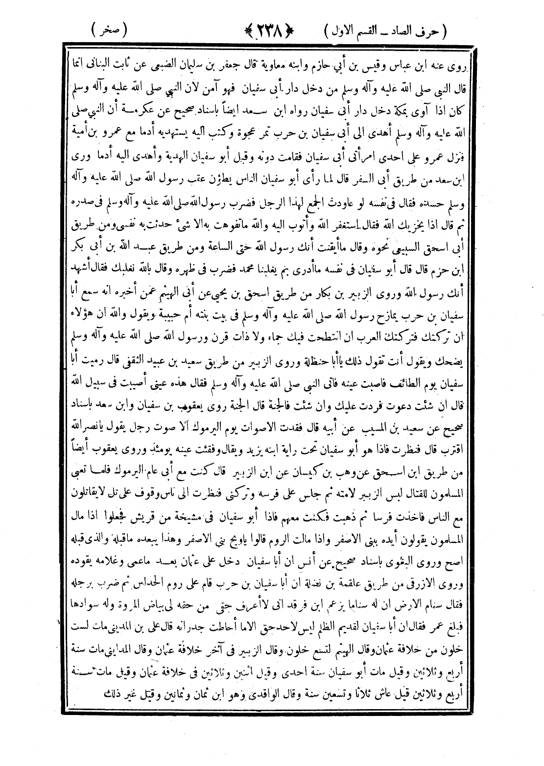 <238> روى عنه بن عباس وقيس بن حازم وابنه معاوية قال جعفر بن سليمان الضبعي عن ثابت البناني إنما قال النبي صلى الله عليه وسلم من دخل دار أبي سفيان فهو آمن لأن النبي صلى الله عليه وسلم كان إذا آوى بمكة دخل دار أبي سفيان رواه بن سعد وروى بن سعد أيضا بإسناد صحيح عن عكرمة أن النبي صلى الله عليه وسلم أهدى إلى أبي سفيان بن حرب تمر عجوة وكتب إليه يستهديه أدما مع عمرو بن أمية فنزل عمرو على إحدى امرأتي أبي سفيان فقامت دونه وقبل أبو سفيان الهدية وأهدى إليه أدما وروى بن سعد من طريق أبي السفر قال لما رأى أبو سفيان الناس يطئون عقب رسول الله صلى الله عليه وسلم حسده فقال في نفسه لو عاودت الجمع لهذا الرجل فضرب رسول الله صلى الله عليه وسلم في صدره ثم قال إذا يخزيك الله فقال أستغفر الله وأتوب إليه والله ما تفوهت به ما هو إلا شيء حدثت به نفسي ومن طريق أبي إسحاق السبيعي نحوه وقال ما أيقنت أنك رسول الله حتى الساعة ومن طريق عبد الله بن أبي بكر بن حزم قال قال أبو سفيان في نفسه ما أدري بم يغلبنا محمد فضرب في ظهره وقال بالله يغلبك فقال أشهد أنك رسول الله وروى الزبير بن بكار من طريق إسحاق بن يحيى عن أبي الهيثم عمن أخبره أنه سمع أبا سفيان بن حرب يمازح رسول الله صلى الله عليه وسلم في بيت بنته أم حبيبة ويقول والله هو إلا أن تركتك فتركتك العرب إن انطحت فيك جماء ولا ذات قرن ورسول الله صلى الله عليه وسلم يضحك ويقول أنت تقول ذلك يا أبا حنظلة وروى الزبير من طريق سعيد بن عبيد الثقفي قال رميت أبا سفيان يوم الطائف فأصبت عينه فأتى النبي صلى الله عليه وسلم فقال هذه عيني أصيبت في سبيل الله قال إن شئت دعوت فردت عليك وإن شئت فالجنة قال الجنة وروى يعقوب بن سفيان وابن سعد بإسناد صحيح عن سعيد بن المسيب عن أبيه قال فقدت الأصوات يوم اليرموك إلا صوت رجل يقول يا نصر الله اقترب قال فنظرت فإذا هو أبو سفيان تحت راية ابنه يزيد ويقال فقئت عينه يومئذ وروى يعقوب أيضا من طريق بن إسحاق عن وهب بن كيسان عن بن الزبير قال كنت مع أبي عام اليرموك فلما تعبى المسلمون للقتال لبس الزبير لأمته ثم جلس على فرسه وتركني فنظرت إلى ناس وقوف على تل يقاتلون مع الناس فأخذت ترسا ثم ذهبت فكنت معهم فإذا أبو سفيان في مشيخة من قريش فجعلوا إذا مال المسلون يقولون أيده ببني الأصفر وإذا مالت الروم قالوا يا ويح بني الأصفر وهذا يبعده ما قبله والذي قبله أصح وروى البغوي بإسناد صحيح عن أنس أن أبا سفيان دخل على عثمان عبد ما عمي وغلامه يقوده وروى الأزرقي من طريق علقمة بن نضلة أن أبا سفيان بن حرب قام على ردم المرأتين ثم ضرب برجله فقال سنام الأرض إن له سناما يزعم بن فرقد أني لا أعرف حقي من حقه لي بياض المروة وله سوادها فبلغ عمر فقال إن أبا سفيان لقديم الظلم ليس لأحد حق إلا ما أحاطت عليه جدرانه قال علي بن المديني مات لست خلون من خلافة عثمان وقال الهيثم لتسع خلون وقال الزبير في آخر خلافة عثمان وقال المدائني مات سنة أربع وثلاثين وقيل مات أبو سفيان سنة إحدى وقيل اثنتين وثلاثين في خلافة عثمان وقيل مات سنة أربع وثلاثين قيل عاش ثلاثا وتسعين سنة وقال الواقدي وهو بن ثمان وثمانين وقيل غير ذلك §