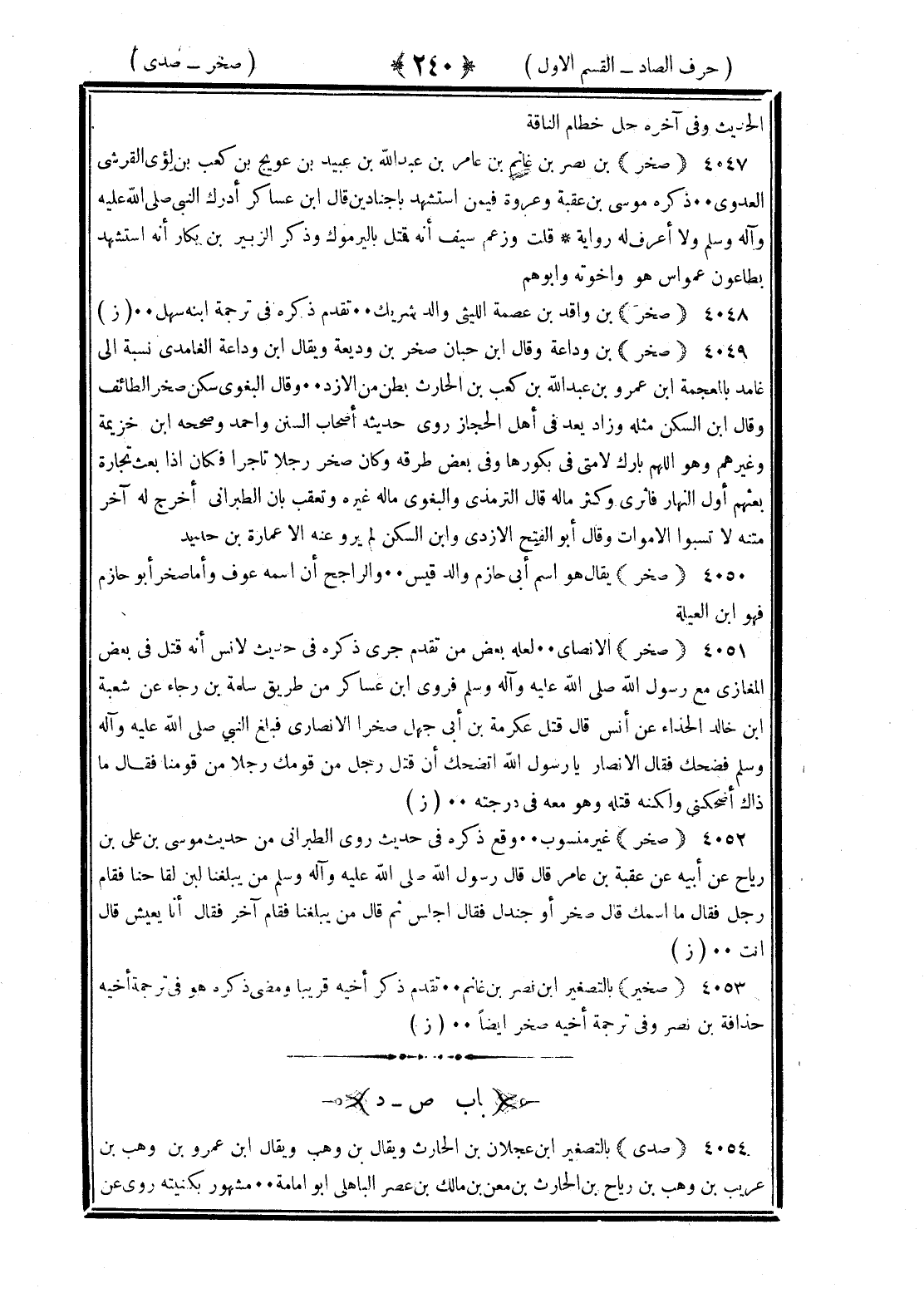 <240> الحديث وفي آخره خل خطام الناقة صخر بن نصر بن غانم بن عامر بن عبد الله بن عبيد بن عويج بن كعب بن لؤي القرشي العدوي ذكره موسى بن عقبة وعروة فيمن استشهد بأجنادين قال بن عساكر أدرك النبي صلى الله عليه وسلم ولا أعرف له رواية قلت وزعم سيف أنه قتل باليرموك وذكر الزبير بن بكار أنه استشهد بطاعون عمواس هو وأخوته وأبوهم صخر بن واقد بن عصمة الليثي والد شريك تقدم ذكره في ترجمة ابنه سهل صخر بن وداعة وقال بن حبان صخر بن وديعة ويقال بن وداعة الغامدي نسبة إلى غامد بالمعجمة بن عمرو بن عبد الله بن كعب بن الحارث بطن من الأزد وقال البغوي سكن صخر الطائف وقال بن السكن مثله وزاد يعد في أهل الحجاز روى حديثه أصحاب السنن وأحمد وصححه بن خزيمة وغيره وهو اللهم بارك لأمتي في بكورها وفي بعض طرقه وكان صخر رجلا تاجرا فكان إذا بعث تجاره بعثهم أول النهار فأثرى وكثر ماله قال الترمذي والبغوي ماله غيره وتعقب بأن الطبراني أخرج له آخر متنه لا تسبوا الأموات وقال أبو الفتح الأزدي وابن السكن لم يرو عنه إلا عمارة بن حديد صخر يقال هو اسم أبي حازم والد قيس والراجح أن اسمه عوف وأما صخر أبو حازم فهو بن العيلة صخر الأنصاري لعله بعض من تقدم جرى ذكره في حديث لأنس أنه قتل في بعض المغازي مع رسول الله صلى الله عليه وسلم فروى بن عساكر من طريق سلمة بن رجاء عن شعبة بن خالد الحذاء عن أنس قال قتل عكرمة بن أبي جهل صخرا الأنصاري فبلغ النبي صلى الله عليه وسلم فضحك فقال الأنصار يا رسول الله أتضحك أن قتل رجل من قومك رجلا من قومنا فقال ما ذاك أضحكني ولكنه قتله وهو معه في درجته صخر غير منسوب وقع ذكره في حديث روى الطبراني من حديث موسى بن علي بن رباح عن أبيه عن عقبة بن عامر قال قال رسول الله صلى الله عليه وسلم من يبلغنا لبن لقاحنا فقام رجل فقال أنا فقال ما اسمك قال صخر أو جندل فقال اجلس ثم قال من يبلغنا فقام آخر أنا فقال ما اسمك قال يعيش قال أنت صخير بالتصغير بن نصر بن غانم تقدم ذكر أخيه قريبا ومضى ذكره هو في ترجمة أخيه حذافة بن نصر وفي ترجمة أخيه صخر أيضا الصاد بعدها الدال صدى بالتصغير بن عجلان بن الحارث ويقال بن وهب ويقال بن عمرو بن وهب بن عريب بن وهب بن رياح بن الحارث بن معن بن مالك بن أعصر الباهلي أبو أمامة مشهور بكنيته روى عن §