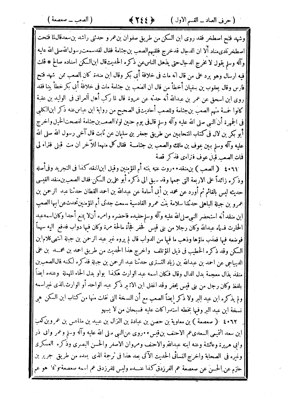<244> وشهد فتح اصطخر فقد روى بن السكن من طريق صفوان بن عمرو حدثني راشد بن سعد قال لما فتحت اصطخر نادى مناد ألا إن الدجال قد خرج فلقيهم الصعب بن جثامة قال لقد سمعت رسول الله صلى الله عليه وسلم يقول لا يخرج الدجال حتى يذهل الناس عن ذكره الحديث قال بن السكن إسناده صالح قلت فيه إرسال وهو يرد على من قال إنه مات في خلافة أبي بكر وقال بن منده كان الصعب ممن شهد فتح فارس وقال يعقوب بن سفيان أخطأ من قال إن الصعب بن جثامة مات في خلافة أبي بكر خطأ بينا فقد روى بن إسحاق عن عمر بن عبد الله أنه حدثه عن عروة قال لما ركب أهل العراق في الوليد بن عقبة كانوا خمسة منهم الصعب بن جثامة وللصعب أحاديث في الصحيح من رواية بن عباس عنه وذكر بن الكلبي في الجمهرة أن النبي صلى الله عليه وسلم قال في يوم حنين لولا الصعب بن جثامة لفضحت الخيل وأخرج أبو بكر بن لال في كتاب المتحابين من طريق جعفر بن سليمان عن ثابت قال آخى رسول الله صلى الله عليه وسلم بين عوف بن مالك والصعب بن جثامة فقال كل منهما للآخر إن مت قبلي فتراء لي فمات الصعب قبل عوف فتراءى فذكر قصة الصعب بن منقر روى عنه بنته أم البنين وقيل بن منقد كذا في التجريد وفي أصله وذكره زائدا على الأربعة التي جمعها وقد سبق إلى ذكره أبو علي بن السكن فقال الصعب بن منقر القيسي حديثه ليس بالقائم ثم أورد عن محمد بن أبي أسامة عن عبد الله بن أحمد القطان حدثنا عبد الرحمن بن عمرو بن جبلة الباهلي حدثتنا سلامة بنت عمرو القادسية سمعت جدتي أم البنين تحدث عن أبيه الصعب بن منقر أنه استحفر النبي صلى الله عليه وسلم حفيرة فأحفره وأمره ألا يمنع أحدا وكان اسمه عبد الحارث فسماه عبد الله وكان رجلا من بني قيس فحفر فجاءت مالحة مرة وكان فيها دوابي فدفع إليه سهما فوضعه فيها فعذب ماؤها وذهب ما فيها من الدواب قال لم يروه غير عبد الرحمن بن جبلة انتهى كلام بن السكن وقد ذكره الخطيب في ذيل المؤتلف وأخرج هذا الحديث من طريق أحمد بن محمد بن علي الديباجي عن أحمد بن عبد الله بن زياد التستري حدثنا عبد الرحمن بن عمرو بن جبلة فذكره لكنه قال الصعب بن منقذ بذال معجمة بدل الدال وقال فكان اسمه عبد الوارث هكذا بواو بدل الحاء المهملة وعنده أيضا بلفظ وكان رجل من بني قيس يحفر وقد أغفل بن الأثير ذكر عبد الواحد أو الوارث الذي غير اسمه ولم يذكره بن عبد البر ولا ذكر أيضا الصعب مع أن النسخة التي نقلت منها من كتاب بن السكن هي نسخة بن عبد البر وفيها بخطه استدراكات عليه فسبحان من لا يسهو صعصعة بن معاوية بن حصن بن عبادة بن النزال بن مرة بن عبيد بن مقاعس بن عمرو بن كعب بن سعد التميمي السعدي عم الأحنف بن قيس روى عن النبي صلى الله عليه وسلم وعمر وأبي ذر وأبي هريرة وعائشة وعنه ابنه عبد الله والأحنف ومروان الأصغر والحسن البصري وذكره العسكري وغيره في الصحابة وأخرج النسائي الحديث الآتي بعد هذا في ترجمة الذي بعده من طريق جرير بن حازم عن الحسن عن صعصعة عم الفرزدق كذا عنده وليس للفرزدق عم اسمه صعصعة وإنما هو عم §