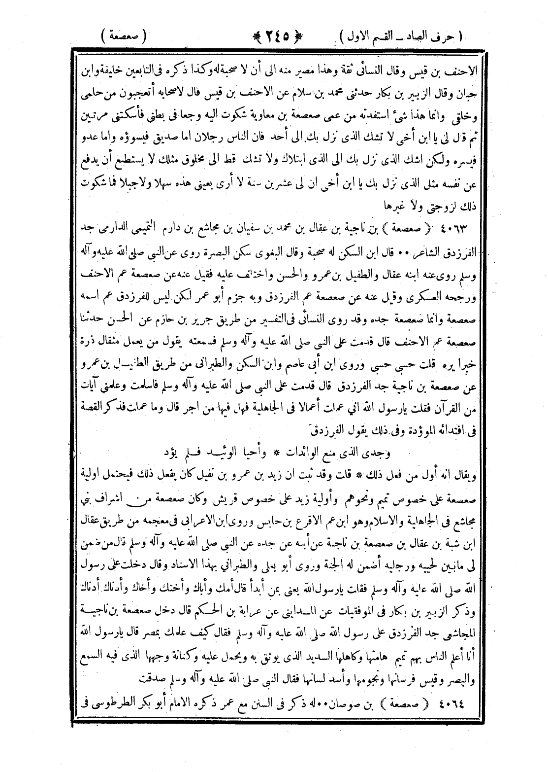 <245> الأحنف بن قيس وقال النسائي ثقة وهذا مصير منه إلى أن لا صحبة له وكذا ذكره في التابعين خليفة وابن حبان وقال الزبير بن بكار حدثني محمد بن سلام عن الأحنف بن قيس قال لأصحابه أتعجبون من حملي وخلقي وإنما هذا شيء استفدته من عمي صعصعة بن معاوية شكوت إليه وجعا في بطني فأسكتني مرتين ثم قال لي بابن أخي لا تشك الذي نزل بك إلى أحد فإن الناس رجلان إما صديق فيسوءه وإما عدو فيسره ولكن اشك الذي نزل بك إلى الذي ابتلاك ولا تشك قط إلى مخلوق مثلك لا يستطيع أن يدفع عن نفسه مثل الذي نزل بك بابن أخي إن لي عشرين سنة لا أرى بعيني هذه سهلا ولا جبلا فما شكوت ذلك لزوجتي ولا غيرها صعصعة بن ناجية بن عقال بن محمد بن سفيان بن مجاشع بن دارم التميمي الدارمي جد الفرزدق الشاعر قال بن السكن له صحبة وقال البغوي سكن البصرة روى عن النبي صلى الله عليه وسلم روى عنه ابنه عقال والطفيل بن عمرو والحسن واختلف عليه فقيل عنه عن صعصعة عم الأحنف ورجحه العسكري وقيل عنه عن صعصعة عم الفرزدق وبه جزم أبو عمر لكن ليس للفرزدق عم اسمه صعصعة وإنما صعصعة جده وقد روى النسائي في التفسير من طريق جريج بن حازم عن الحسن حدثنا صعصعة عم الأحنف قال قدمت على النبي صلى الله عليه وسلم فسمعته يقول من يعمل مثقال ذرة خيرا يره قلت حسبي حسبي وروى بن أبي عاصم وابن السكن والطبراني من طريق الطفيل بن عمرو عن صعصعة بن ناجية جد الفرزدق قال قدمت على النبي صلى الله عليه وسلم فأسلمت وعلمني آيات من القرآن فقلت يا رسول الله إني عملت أعمالا في الجاهلية فهل فيها من أجر قال وما عملت فذكر القصة في افتدائه الموءودة وفي ذلك يقول الفرزدق وجدي الذي منع الوائدات وأحيا الوئيد فلم يوأد ويقال إنه أول من فعل ذلك قلت وقد ثبت أن زيد بن عمرو بن نفيل كان يفعل ذلك فيحتمل أولية صعصعة على خصوص تميم ونحوهم وأولية زيد على خصوص قريش وكان صعصعة من أشراف بني مجاشع في الجاهلية والإسلام وهو بن عم الأفرع بن حابس وروى بن الأعرابي في معجمه من طريق عقال بن شبة بن عقال بن صعصعة بن ناجية عن أبيه عن جده عن النبي صلى الله عليه وسلم قال من ضمن لي ما بين لحييه ورجليه أضمن له الجنة وروى أبو يعلى والطبراني بهذا الإسناد وقال دخلت على رسول الله صلى الله عليه وسلم فقلت يا رسول الله يعني بمن أبدأ قال أمك وأباك وأختك وأخاك وأدناك أدناك وذكر الزبير بن بكار في الموفقيات عن المدائني عن عرابة بن الحكم قال دخل صعصعة بن ناجية المجاشعي جد الفرزدق على رسول الله صلى الله عليه وسلم فقال كيف علمك بمضر قال يا رسول الله أنا أعلم الناس بهم تميم هامتها وكاهلها الشديد الذي يوثق به ويحمل عليه وكنانة وجهها الذي فيه السمع والبصر وقيس فرسانها ونجومها وأسد لسانها فقال النبي صلى الله عليه وسلم صدقت صعصعة بن صوحان له ذكر في السنن مع عمر ذكر الإمام أبو بكر الطرطوسي في §