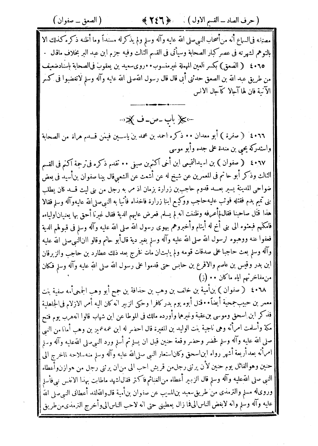 <246> مصنفه في السماع أنه من أصحاب النبي صلى الله عليه وسلم ولم يذكر له مسند وما أظنه ذكره كذلك إلا بالتوهم لشهرته في عصر كبار الصحابة وسيأتي في القسم الثالث وفيه جزم بن عبد البر بخلاف ما قال الصعق بكسر العين المهملة غير منسوب روى سعيد بن يعقوب في الصحابة بإسناد ضعيف من طريق عبد الله بن الصعق حدثني أبي قال قال رسول الله صلى الله عليه وسلم لا تغضبوا في كسر الآنية فإن لها آجالا كآجال الإنس الصاد بعدها الفاء صفرة أبو معدان ذكره أحمد بن محمد بن ياسين فيمن قدم هراة من الصحابة واستدركه يحيى بن منده على جده وأبو موسى ز صفوان بن أسيد التميمي بن أخي أكثم بن صيفي تقدم ذكره في ترجمة أكثم في القسم الثالث وذكر أبو حاتم في المعمرين عن شيخ له عن أشعث عن الشعبي قال بينا صفوان بن أسيد في بعض ضواحي المدينة يسير بعد قدوم حاجب بن زرارة بزمان إذ مر به رجل من بني ليث قد كان يطلب بني تميم بدم فقتله فوثب عليه حاجب ووكيع ابنا زرارة فأخذاه فأتيا به النبي صلى الله عليه وسلم فقالا هذا قتل صاحبنا فقال لم أعرفه وظننت أنه لم يسلم فعرض عليهم الدية فقال غيرنا أحق بها يعنيان أولياءه فأمكنهم فبعثوه إلى بني أخ له أيتام وأخبروهم بهوى رسول الله صلى الله عليه وسلم في قبولهم الدية فعفوا عنه ووهبوه لرسول الله صلى الله عليه وسلم بغير دية قال أبو حاتم وقالوا إن النبي صلى الله عليه وسلم بعث حاجبا على صدقات قومه ولم يلبث أن مات فخرج بعد ذلك عطارد بن حاجب والزبرقان بن بدر وقيس بن عاصم والأقرع بن حابس حتى قدموا على رسول الله صلى الله عليه وسلم فكان من مفاخرتهم إياه ما كان صفوان بن أمية بن خلف بن وهب بن حذافة بن جمح أبو وهب الجمحي أمه صفية بنت معمر بن حبيب جمحية أيضا قتل أبوه يوم بدر كافرا وحكى الزبير أنه كان إليه أمر الأزلام في الجاهلية فذكره بن إسحاق وموسى بن عقبة وغيرهما وأورده مالك في الموطأ عن بن شهاب قالوا إنه هرب يوم فتح مكة وأسلمت امرأته وهي ناجية بنت الوليد بن المغيرة قال فأحضر له بن عمه عمير بن وهب أمانا من النبي صلى الله عليه وسلم فحضر وحضر وقعة حنين قبل أن يسلم ثم أسلم ورد النبي صلى الله عليه وسلم امرأته بعد أربعة أشهر رواه بن إسحاق وكان استعار النبي صلى الله عليه وسلم منه سلاحه لما خرج إلى حنين وهو القائل يوم حنين لأن يربني رجل من قريش أحب إلي من أن يربني رجل من هوازن وأعطاه النبي صلى الله عليه وسلم قال الزبير أعطاه من الغنائم فأكثر فقال أشهد ما طابت بهذا إلا نفس نبي فأسلم وروى له مسلم والترمذي من طريق سعيد بن المسيب عن صفوان بن أمية قال والله لقد أعطاني النبي صلى الله عليه وسلم وإنه لأبغض الناس إلي فما زال يعطيني حتى إنه لأحب الناس إلى وأخرج الترمذي من طريق §