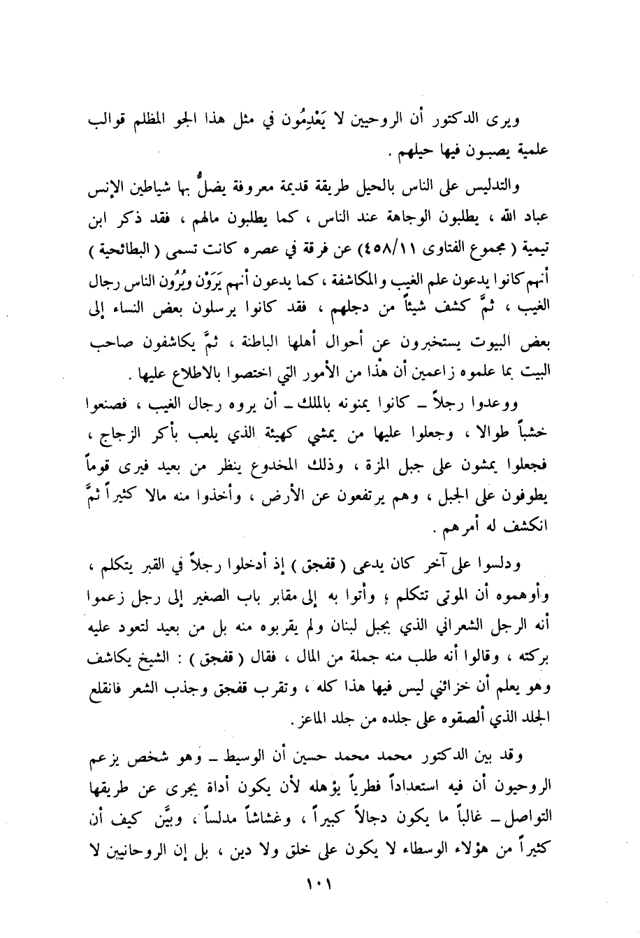 ويرى الدكتور أن الروحيين لا يعْدِمون في مثل هذا الجو المظلم قوالب علمية يصبون فيها حيلهم.
