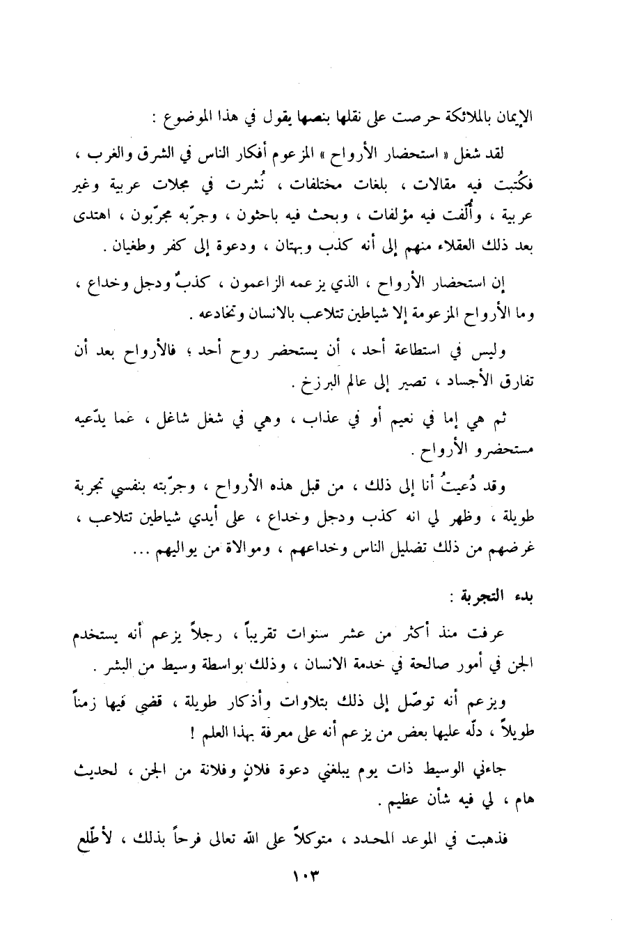" لقد شغل (استحضار الأرواح) المزعوم أفكار الناس في الشرق والغرب، فكُتبت فيه مقالات، بلغات مختلفات، نُشرت في مجلات عربية وغير عربية، وألفت فيه مؤلفات، وبحث فيه باحثون، وجربه مجربون، اهتدى بعد ذلك العقلاء منهم إلى أنه كذب وبهتان، ودعوة إلى كفر وطغيان.