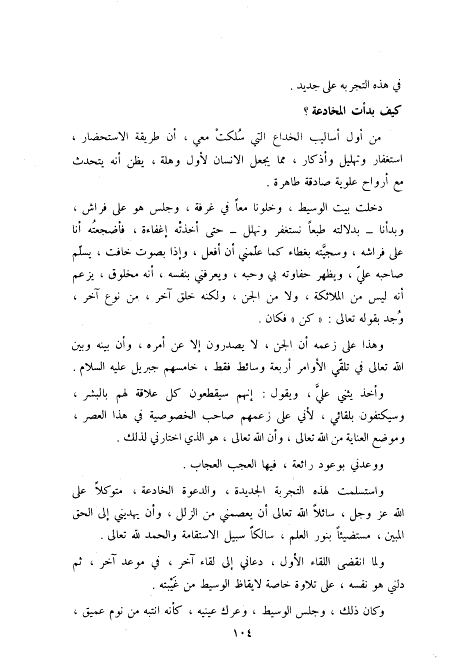 دخلت بيت الوسيط، وخلونا معاً في غرفة، وجلس هو على فراش، وبدأنا - بدلالته طبعاً نستغفر ونهلل - حتى أخذته إغفاءة، فَأضجعته أنا على فراشه، وسجيته بغطاء، كما علمني أن أفعل، وإذا بصوت خافت، يسلم صاحبه عليّ، ويظهر حفاوته بي وحبه، ويعرفني بنفسه، إنه مخلوق، يزعم أنه ليس من الملائكة، ولا من الجنّ، ولكنه خلق آخر، من نوع آخر، وُجد بقوله تعالى " كن " فكان.