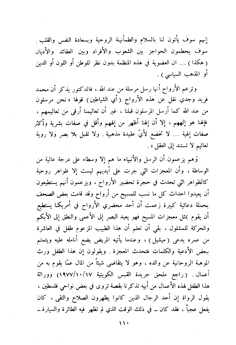 وقد تزعم الأرواح أنها مرسلة من عند الله، فالدكتور محمد محمد حسين يذكر أن محمد فريد وجدي نقل عن هذه الأرواح (الشياطين) قولها: " نحن مرسلون من عند الله كما أرسل المرسلون قبلنا، غير أن تعاليمنا أرقى من تعاليمهم، فإلهنا هو إلههم، إلا أن إلهنا أظهر من إلههم، وأقل صفات بشرية وأكثر صفات إلهية ... ، لا تخضع لأي عقيدة مذهبية، ولا تقبل بلا بصر ولا روية تعاليم لا تستند إلى العقل ".
