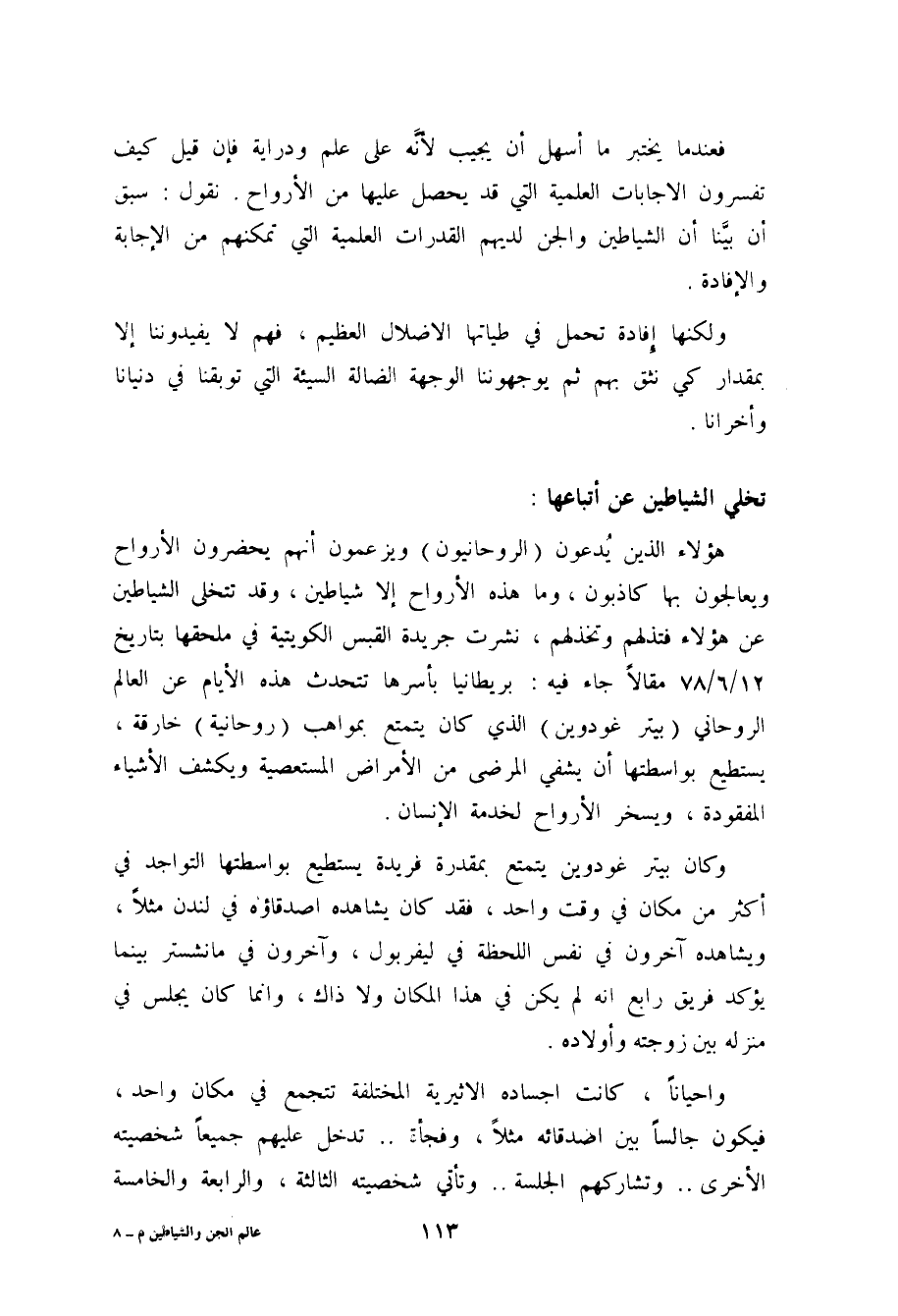 هؤلاء الذين يُدعون بالروحانيين، ويزعمون أنهم يحضرون الأرواح ويعالجون بها كاذبون، وما هذه الأرواح إلا شياطين، وقد تتخلى الشياطين عن هؤلاء فتذلهم وتخذلهم، نشرت جريدة القبس الكويتية (¬1) مقالاً جاء فيه: " بريطانيا بأسرها تتحدث هذه الأيام عن العالم الروحاني (بيتر غودوين) الذي كان يتمتع بمواهب (روحانية) خارقة، يستطيع بوساطتها أن يشفي المرضى من الأمراض المستعصية، ويكشف الأشياء المفقودة، ويسخر الأرواح لخدمة الإنسان.