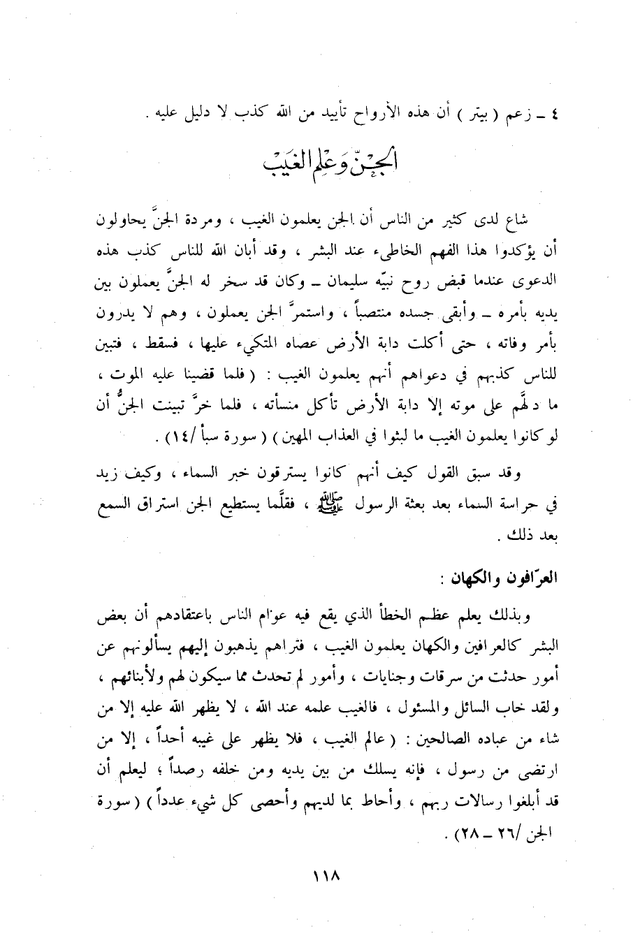وبذلك يعلم عظم الخطأ الذي يقع فيه عوام الناس باعتقادهم أن بعض البشر كالعرافين والكهان يعلمون الغيب، فتراهم يذهبون إليه يسألونهم عن أمور حدثت من سرقات وجنايات، وأمور لم تحدث مما سيكون لهم ولأبنائهم، ولق خاب السائل والمسؤول، فالغيب علمه عند الله، لا يظهر الله عليه إلا من شاء من رسله: (عالم الغيب فلا يظهر على غيبه أحداً - إلاَّ من ارتضى من رَّسولٍ فإنَّه يسلك من بين يديه ومن خلفه رصداً - ليعلم أن قد أبلغوا رسالات ربهم وأحاط بما لديهم وأحصى كل شيءٍ عددا) [الجن: 28] .