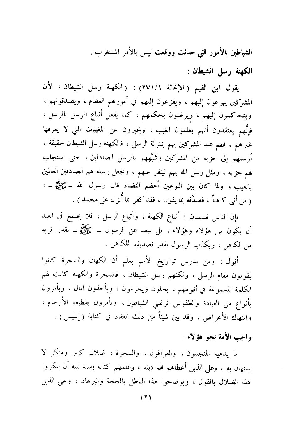 فإن الناس قسمان: أتباع الكهنة، وأتباع الرسل، فلا يجتمع في العبد أن يكون من هؤلاء وهؤلاء، بل يبعد عن الرسول صلى الله عليه وسلم بقدر قربه من الكاهن، ويُكَذّبُ الرسول بقدر تصديقه للكاهن.