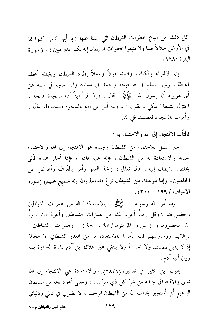 إن الالتزام بالكتاب والسنة قولاً وعملاً يطرد الشيطان ويغيظه أعظم إغاظة، روى مسلم في صحيحه عن أبي هريرة قال: قال رسول الله صلى الله عليه وسلم: (إذا قرأ ابنُ آدم السجدة فسجد، اعتزل الشيطان يبكي، يقول: يا ويله، (وفي رواية أبي كريب: يا ويلي) أمر ابن آدم بالسجود فسجد، فله الجنّة وأُمرتُ بالسجود فأبيت، في النار) (¬1) .