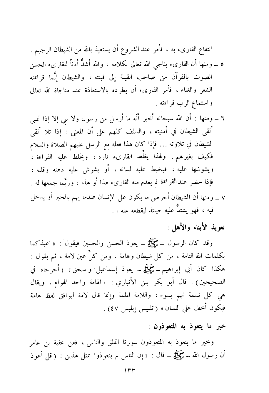 وخير ما يتعوذ به المتعوذون سورتا الفلق والناس، فقد أمر الرسول صلى الله عليه وسلم عبد الله بن خبيب أن يقرأ: (قل هو الله أحد) ، والمعوذتين حين يمسي، وحين يصبح، ثلاثاً. وقال له: (يكفيك الله كل شيء) .