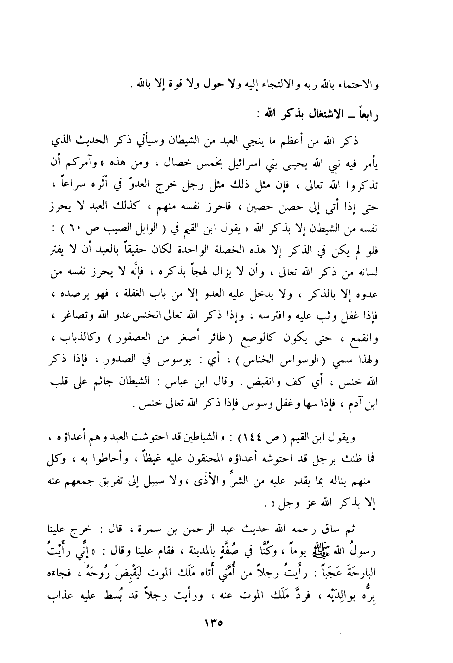 ويقول ابن القيم: " الشياطين قد احتوشت العبد وهم أعداؤه، فما ظنك برجل قد احتوشه أعداؤه المحنقون عليه غيظاً، وأحاطوا به، وكل منهم يناله بما يقدر عليه من الشرّ والأذى، ولا سبيل إلى تفريق جمعهم عنه إلا بذكر الله عزّ وجلّ ".